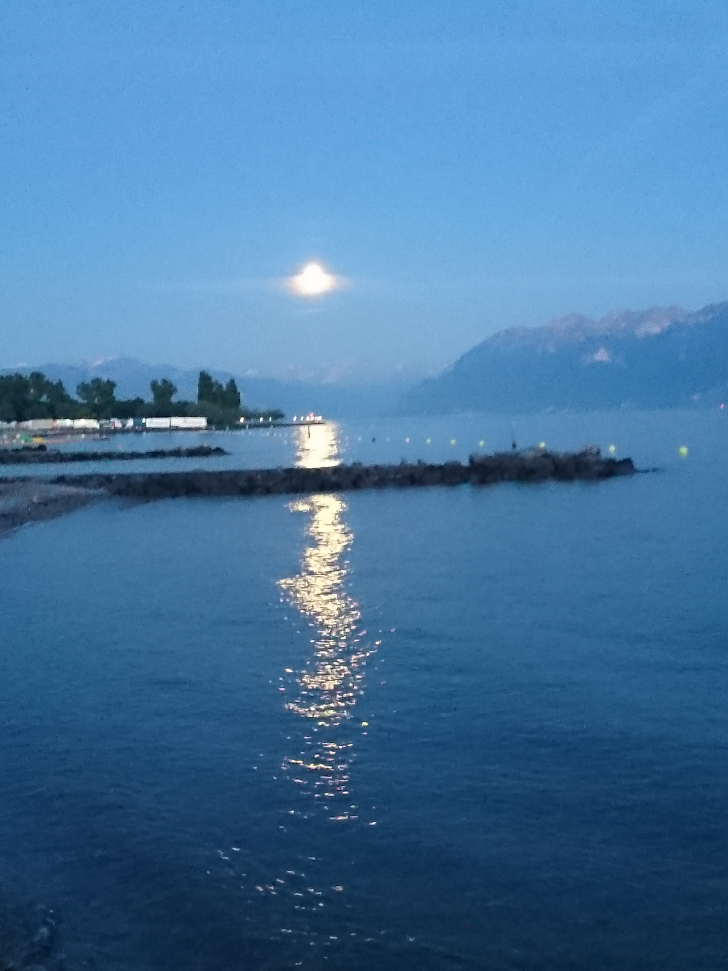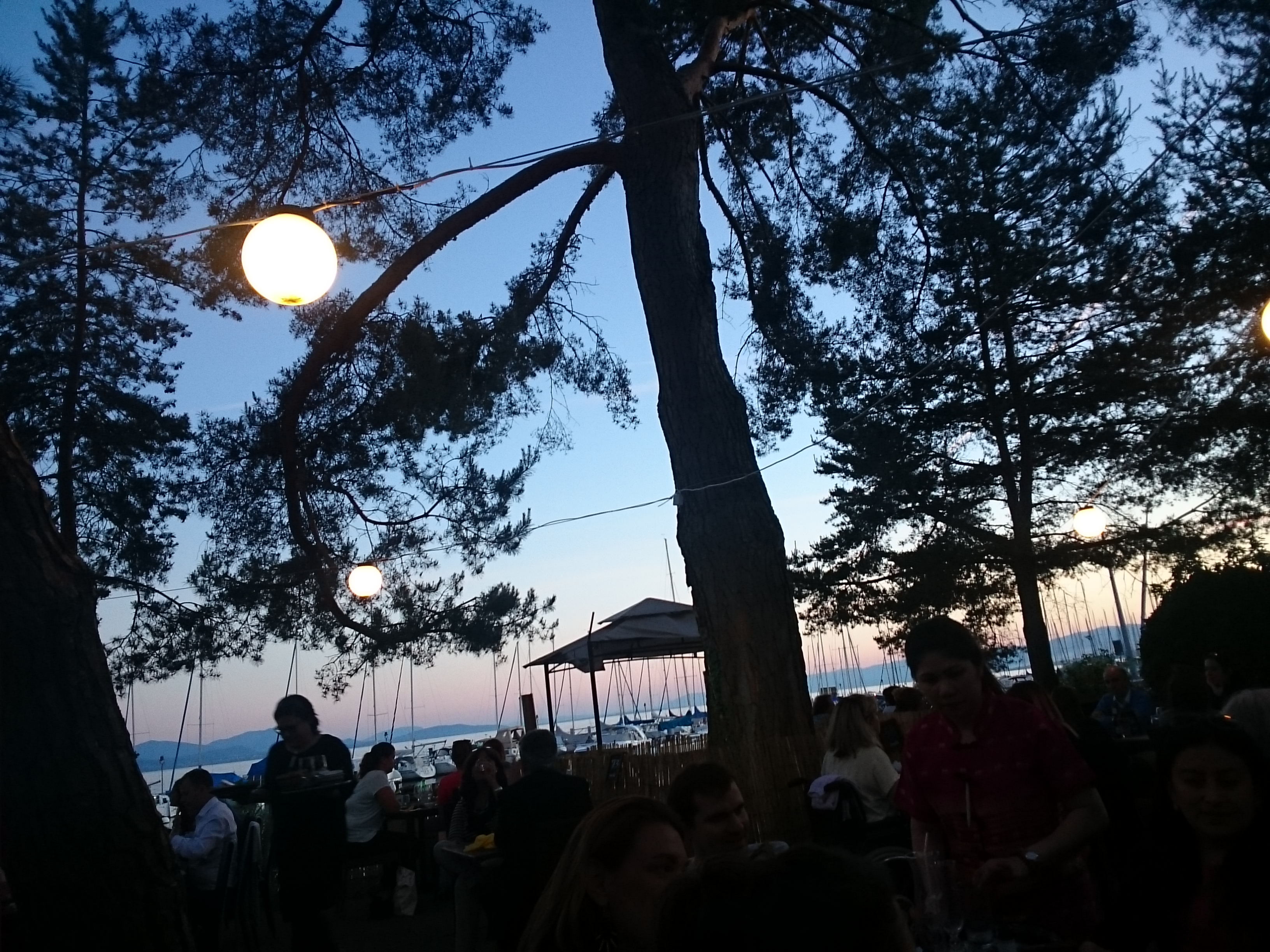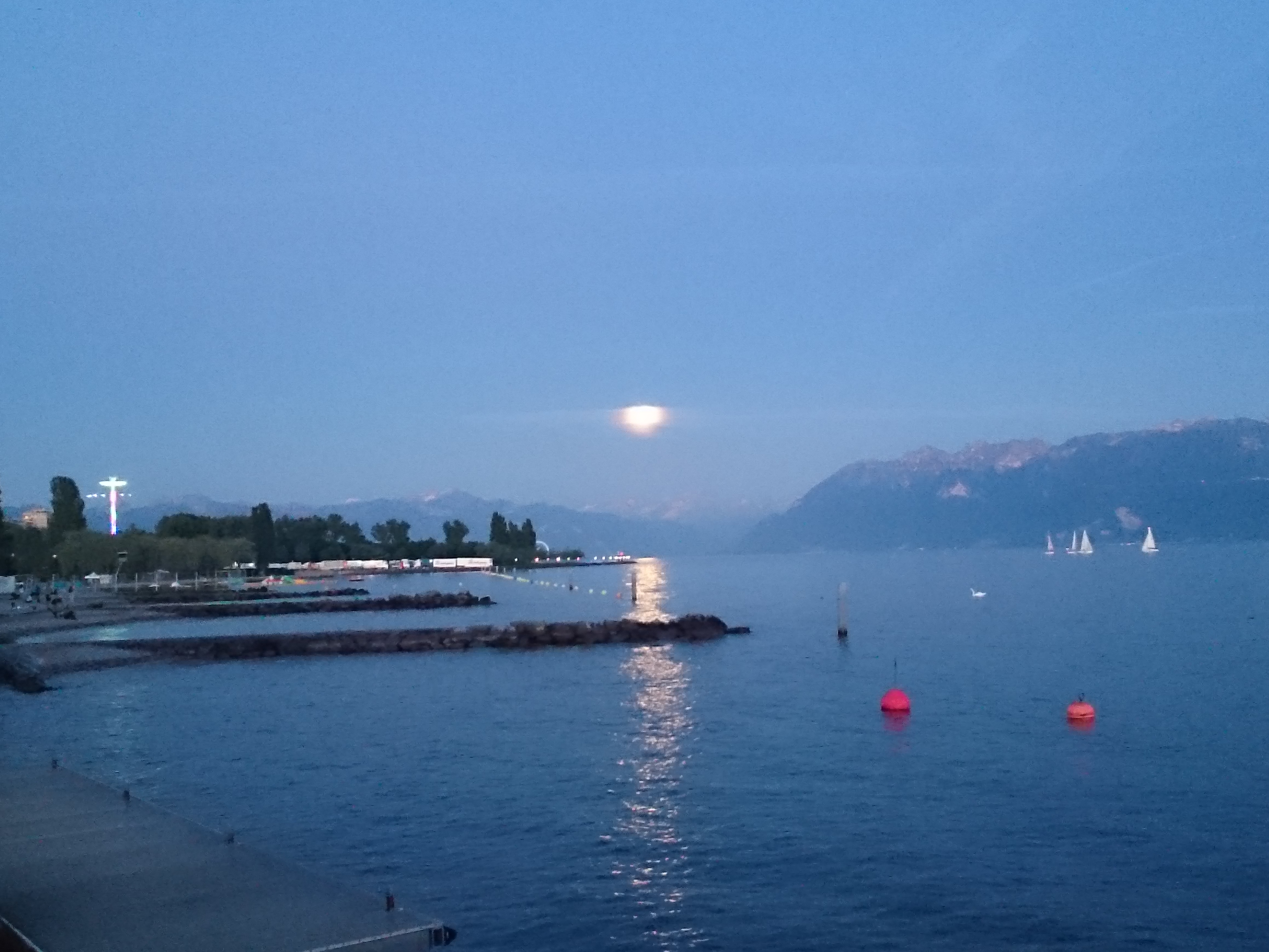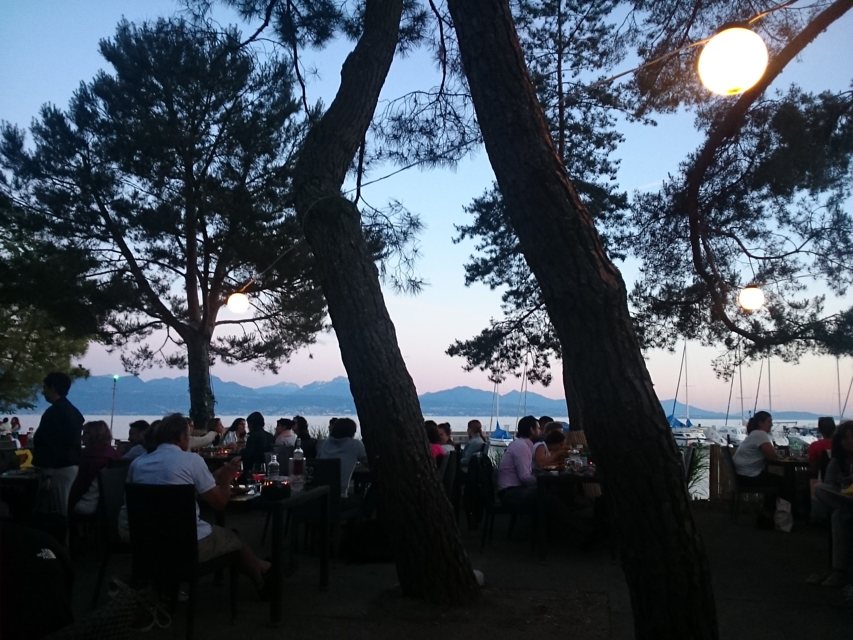Mardi soir, j’ai fait un repas exquis avec une amie au bord du lac, sur la terrasse de la Maison Thaï au Lac. En entrée, nous avons partagé une salade de papaye verte et une salade de crevettes à la menthe (dont j’ai trouvé la sauce, que je ne connaissais pas, vraiment sublime). En plat, nous avons aussi partagé un exemplaire bœuf au curry vert et un canard sauté au basilic d’une tendreté absolue. C’était vraiment une soirée d’enchantement, sur la terrasse, face au lac et aux montagnes, dans la douceur du soir, à papoter en buvant un sauvignon blanc de Cheverny qui s’accordait parfaitement avec la cuisine thaïlandaise. J’ai même pris des photos, c’est vous dire, piètre photographe que je suis, si j’étais impressionnée par le paysage !