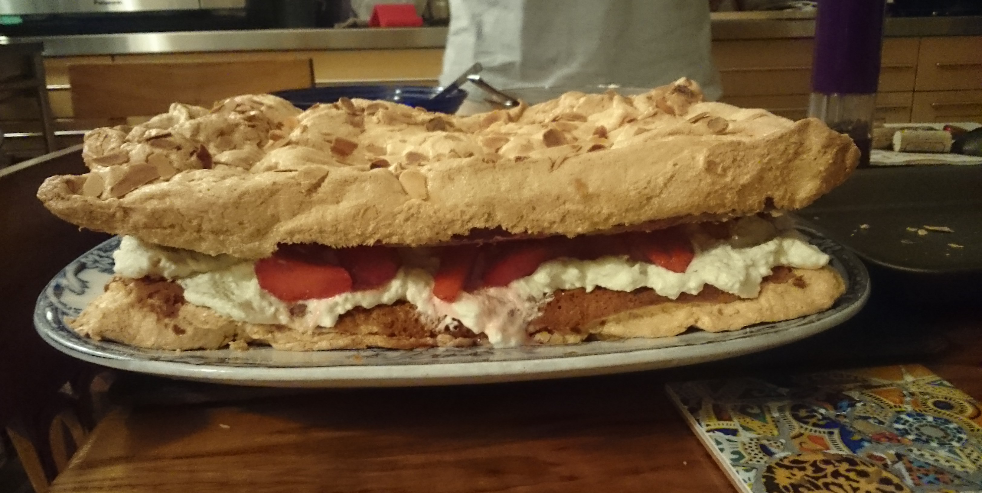 Vendredi soir, nous avons mangé sur notre terrasse avec des amis. En entrée, ce fut du foie gras aux asperges et noix (avec un foie gras au sel préparé par moi-même, et non pas coupé en copeaux à l’économe comme indiqué dans la recette, ce que j’ai tenté et trouvé impossible, mais en fines tranches au couteau), et j’en suis sortie convaincue de l’alliance asperges-foie gras. En plat, du filet de bœuf cuisson lente juste badigeonné d’un mélange de vinaigre balsamique et de moutarde, et une purée de pommes de terre à l’oseille. En dessert, une variation sur la pavlova trouvée dans le Nigella Lawson, aussi agréable que jolie