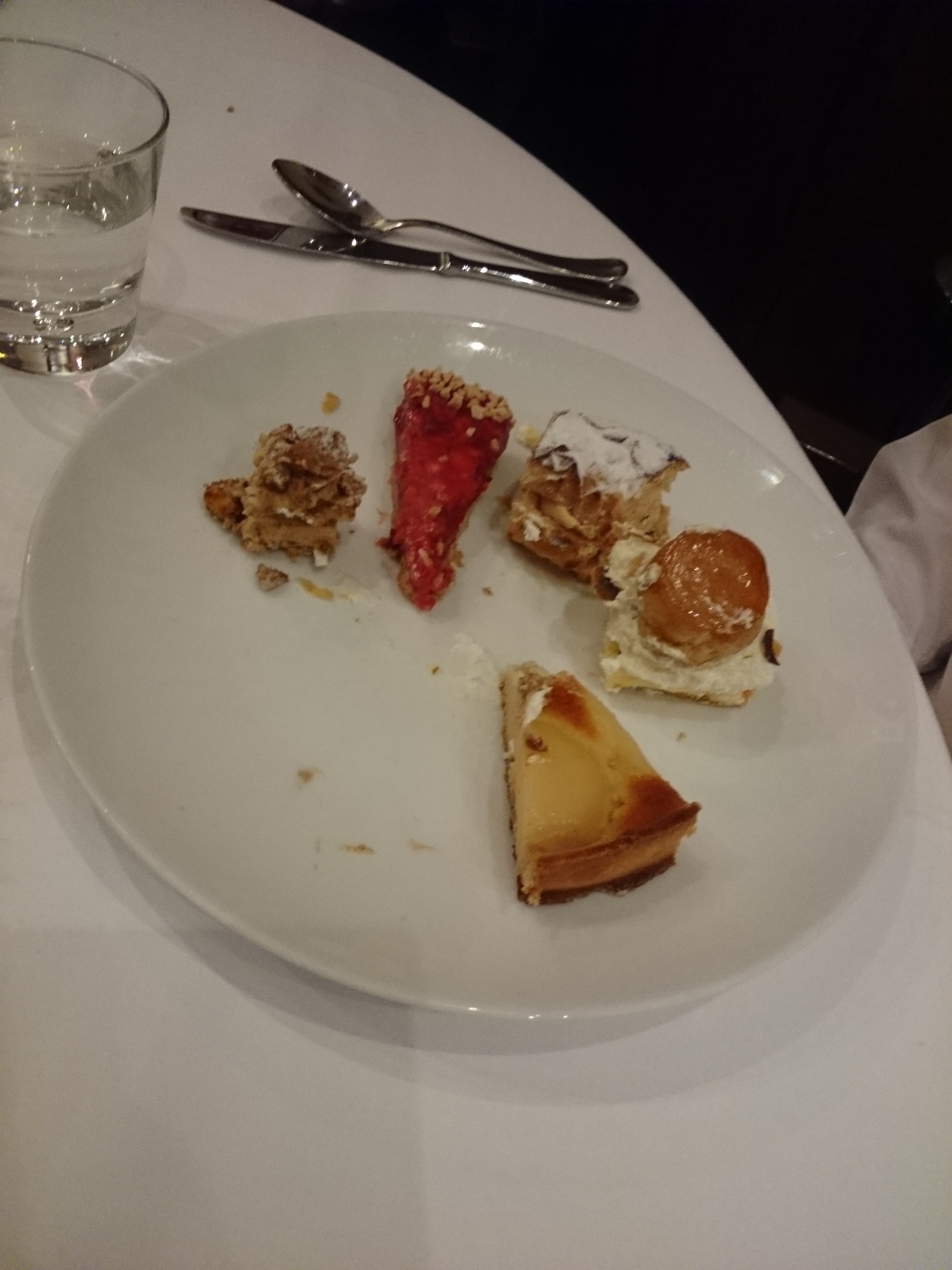 Restaurant Vatel : il s’agit là du restaurant d’application de l’école hôtelière « Institut Vatel », le service est parfois un peu empoté (ben oui, les pauvres, ils débutent…) mais toujours charmant (et bien supervisé), et on y mange une belle cuisine classique française à prix très doux, dans un décor très « cuisine bourgeoise années 80 ». Nous avons pris un menu, avec entre autres une entrée de coquilles Saint-Jacques peut-être un peu trop éclectique dans ses garnitures (aubergines, et je ne sais plus trop quoi d’autre), mais cuites juste bien, nacrées, délicieuses. Et les desserts ! Les desserts ! J’ai beau être plus salé que sucré, même moi, je craque ! Regardez par vous-mêmes…