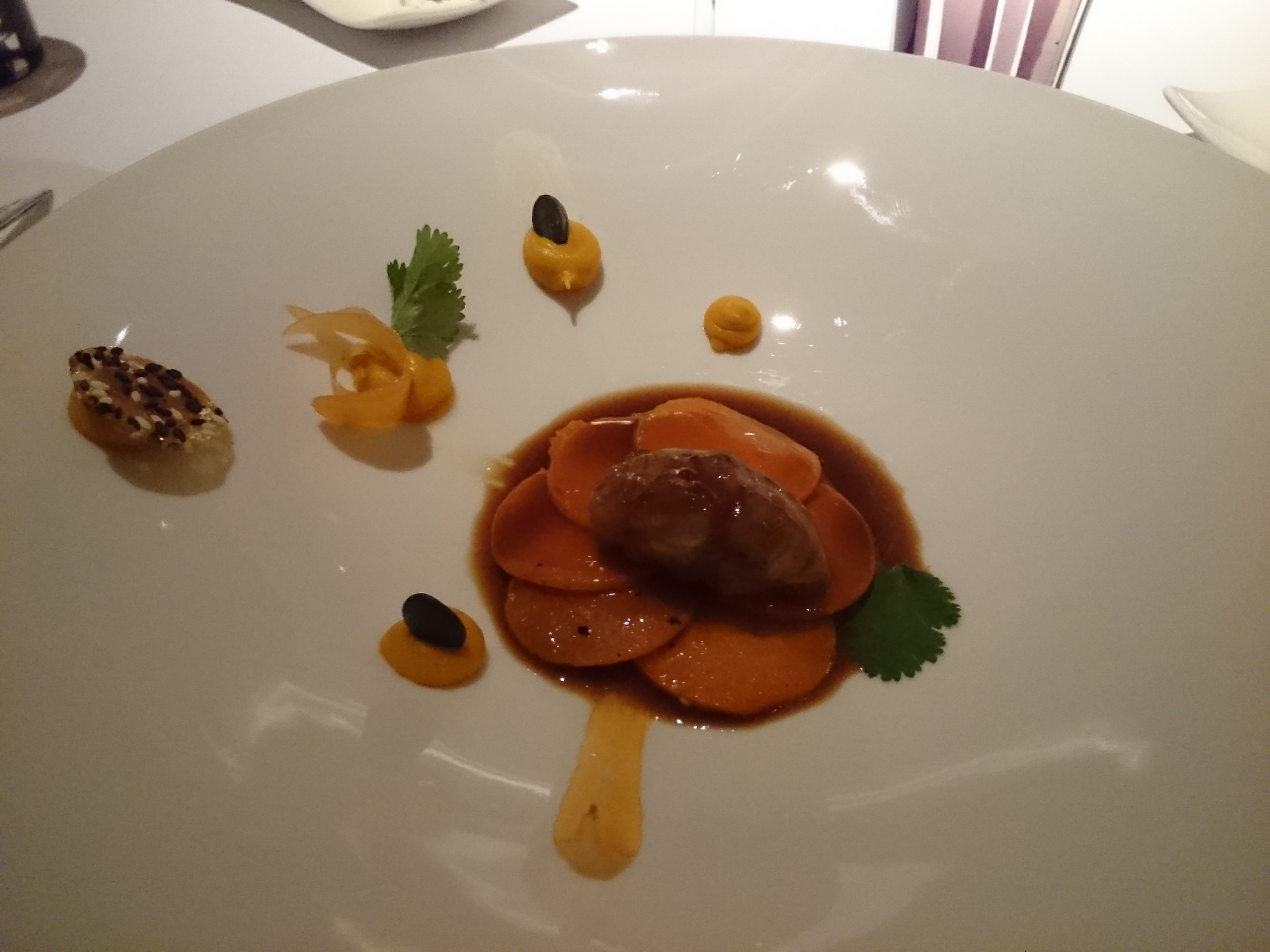 La deuxième entrée se nommait « Ris de veau Carotte | courge muscade | miel | sésame ». Je cuisine moi-même les ris de veau, et j’avais été très déçue par ceux dégustés chez Passard à L’Arpège à Paris, qui, pour un prix exorbitant, n’étaient franchement pas meilleurs que les miens. Aux Saisons j’ai été comblée :