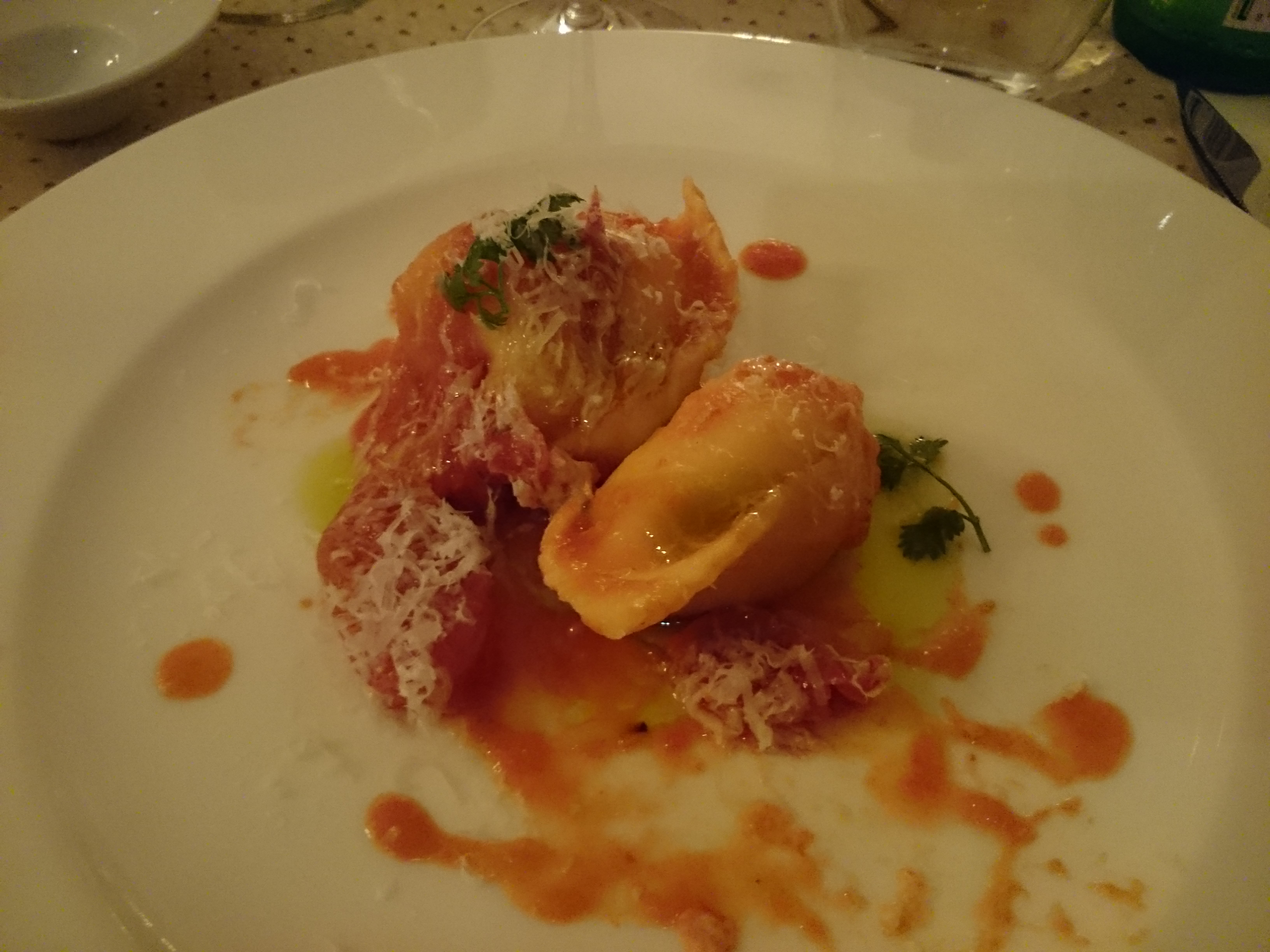Nous décidons de nous partager des pâtes (qui, si on se fie à leur prix, sont proposées en version plat sur la carte) pour commencer. On nous propose les tortellonis du jour, hors carte, farcis à la mozzarella et servis avec de la tomate.