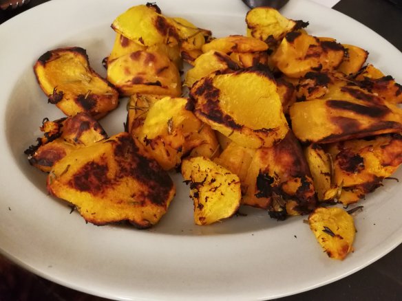 Vendredi soir, j’ai fait de l’émincé de veau à la crème et au Marsala, et de la courge au four (ou plutôt des courges, j’en avais acheté plusieurs petites de plusieurs sortes différentes) :