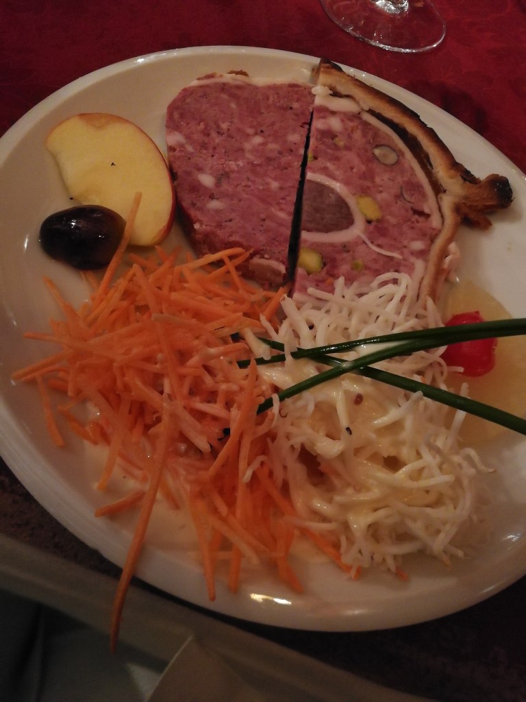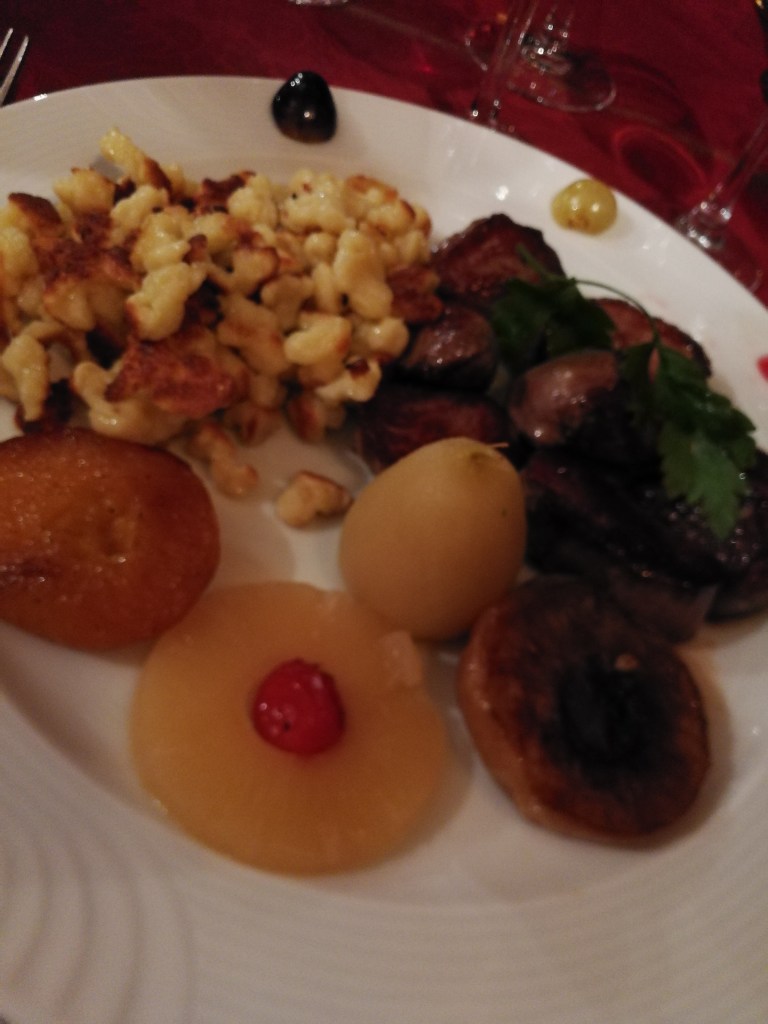Samedi soir, nous avons été avec des amis manger à l’Hôtel de France à Cuarnens, dont j’ai déjà parlé dans cet article. C’était, comme d’habitude, parfait dans son style, avec tout d’abord une assiette de terrine de gibiers et pâté en croûte de lièvre, puis des noisettes de chevreuil accompagnées d’une sauce crémée aux morilles tout à fait délectable, de choux, marrons, fruits cuits et de spätzlis bien croquants, et enfin nous avons partagé des raisins à la lie qui ont bien couronné le tout.