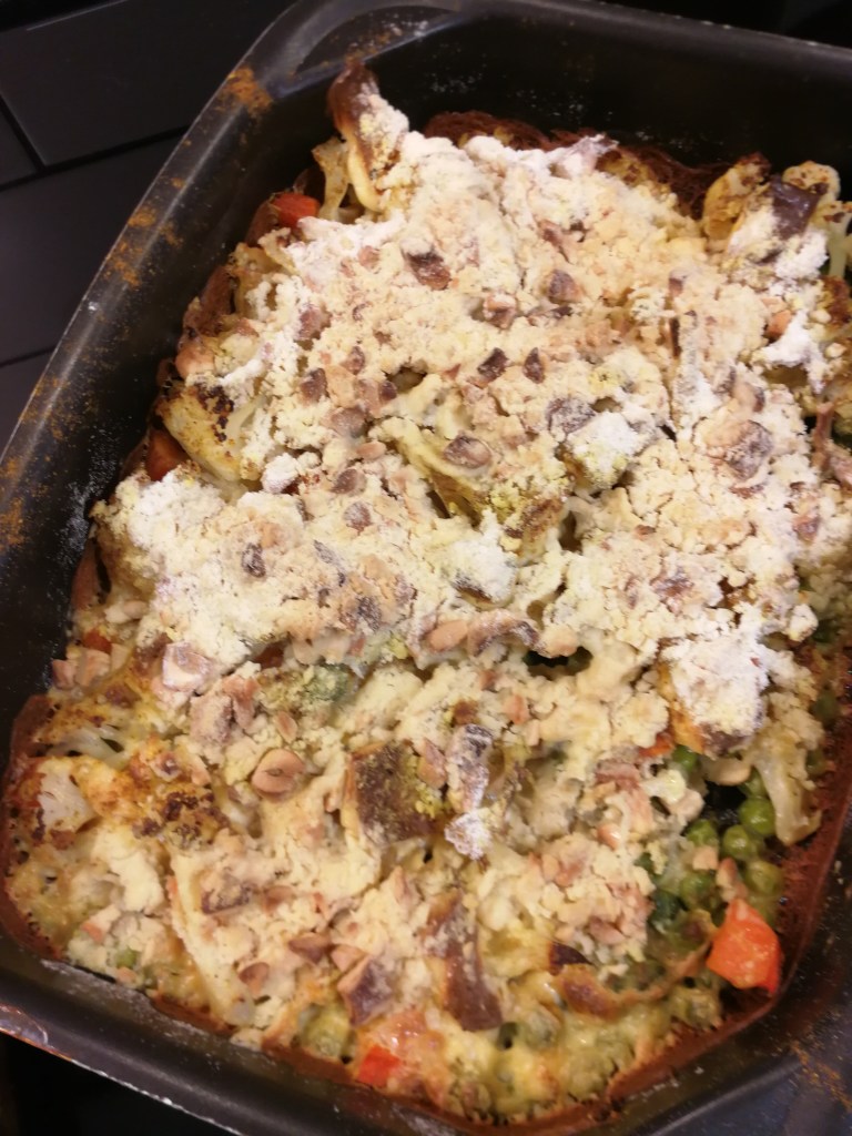 Lundi soir, j’ai tenté un crumble de légumes à l’indienne, bien sympathique – il n’en n’est pas resté une miette. Je l’ai fait sans poivron (ce n’est plus de saison), et j’ai augmenté la quantité de chou-fleur et de carottes pour compenser. Je vois dans les commentaires de la recette que certains l’ont trouvé pâteux, je pense qu’ils ont commis l’erreur de réduire les noix de cajou en poudre, il faut juste les hacher grossièrement.