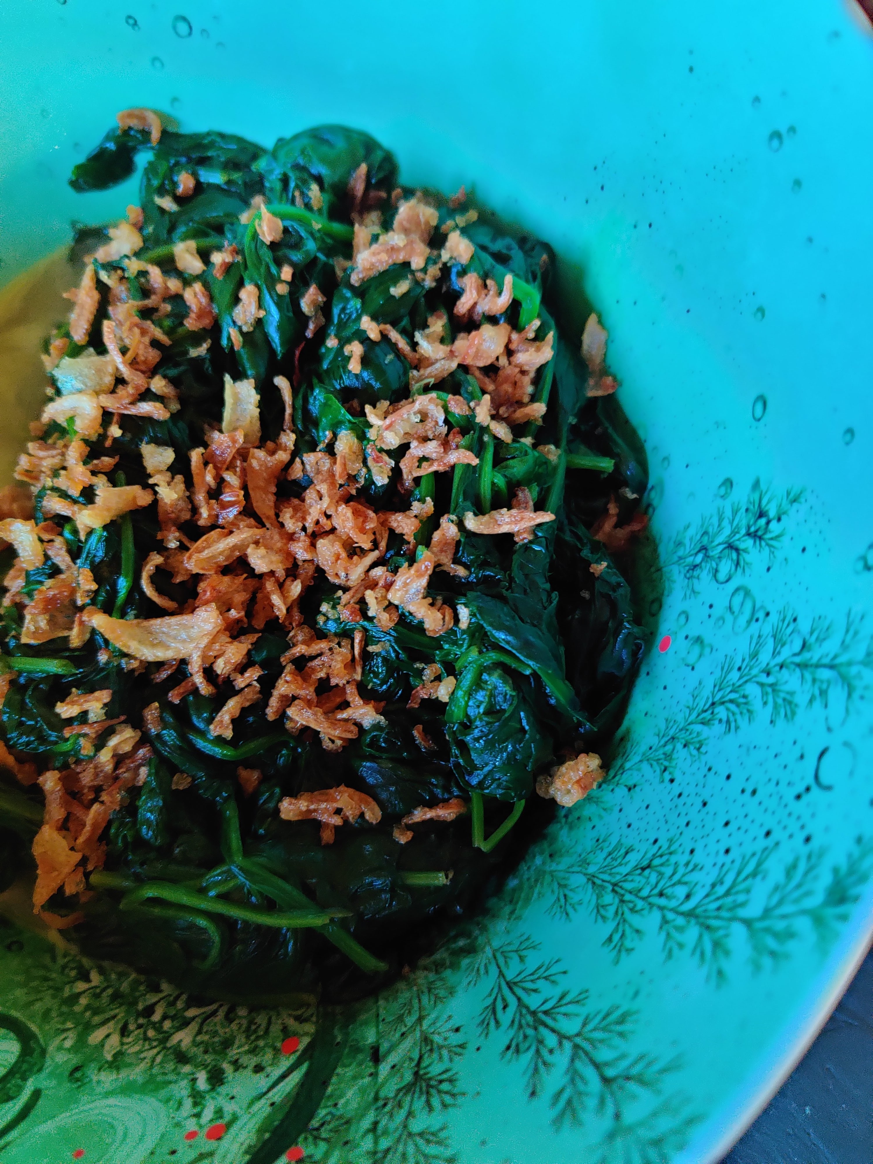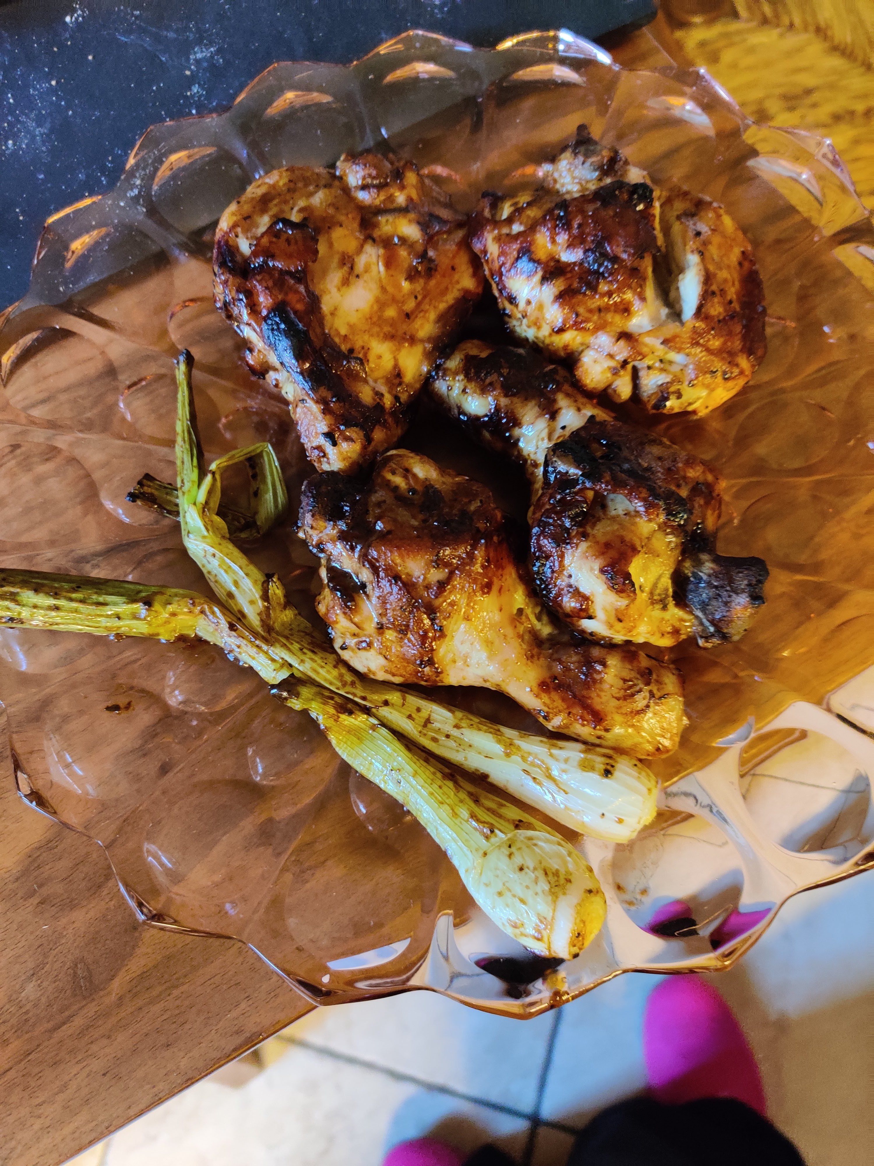 Mardi soir, j’ai servi des cuisses de poulet rôties laquées (j’avais un sachet de glaçage à la fumée liquide ramené de dieu sait où à utiliser, c’était étonnamment bon) et des épinards au beurre et aux oignons frits.