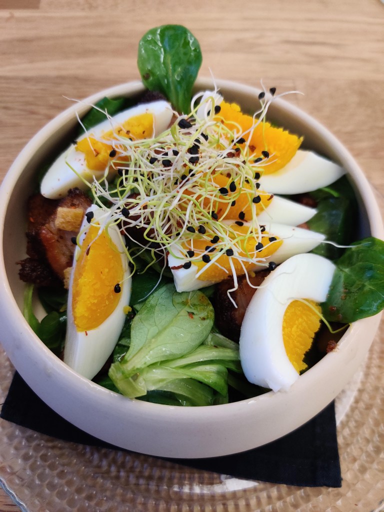 😂😂 Il a pris la même salade en entrée, puis la poitrine de cochon confite aux épices, salade de haricots blancs, très bonne.