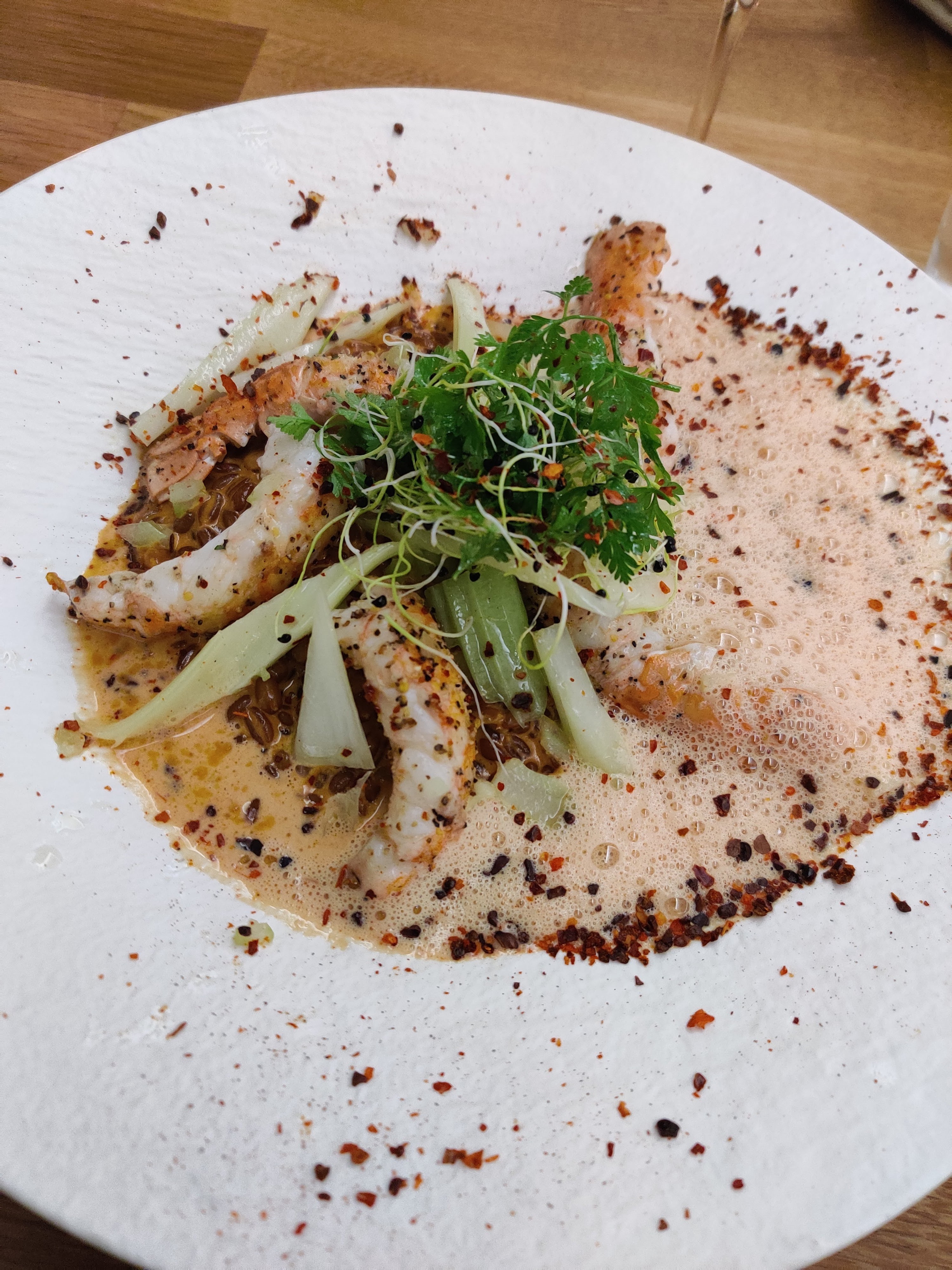 Samedi soir, nous avons fait un excellent repas au Njørd Café – voilà un endroit qui fait une très belle cuisine nordique, élaborée et de saison, avec une carte courte mais qui change régulièrement. Le seul autre restaurant nordique que je connais dans les parages (et que je ne nommerai pas, n’ayant aucun bien à en dire) fait du saumon, et du lard, et encore du saumon, et peut-être aussi du lard, tout ça dans un cadre très hipster-compatible avec des prix surfaits, je suis donc fort contente d’avoir trouvé une autre adresse pour ce type de cuisine ! J’ai d’abord pris une simple salade de rampon aux oeufs, lards et croûtons, très fraîche , avec une excellente sauce maison. Mais là où la cuisine a vraiment brillé, c’est avec mon plat de langoustines de casiers, belles et vigoureuses dans une sauce exquise, avec du céleri-branche pour le peps et du sarrasin pour « saucer », bref, parfait ! La prochaine fois je teste leur restaurant gastronomique…