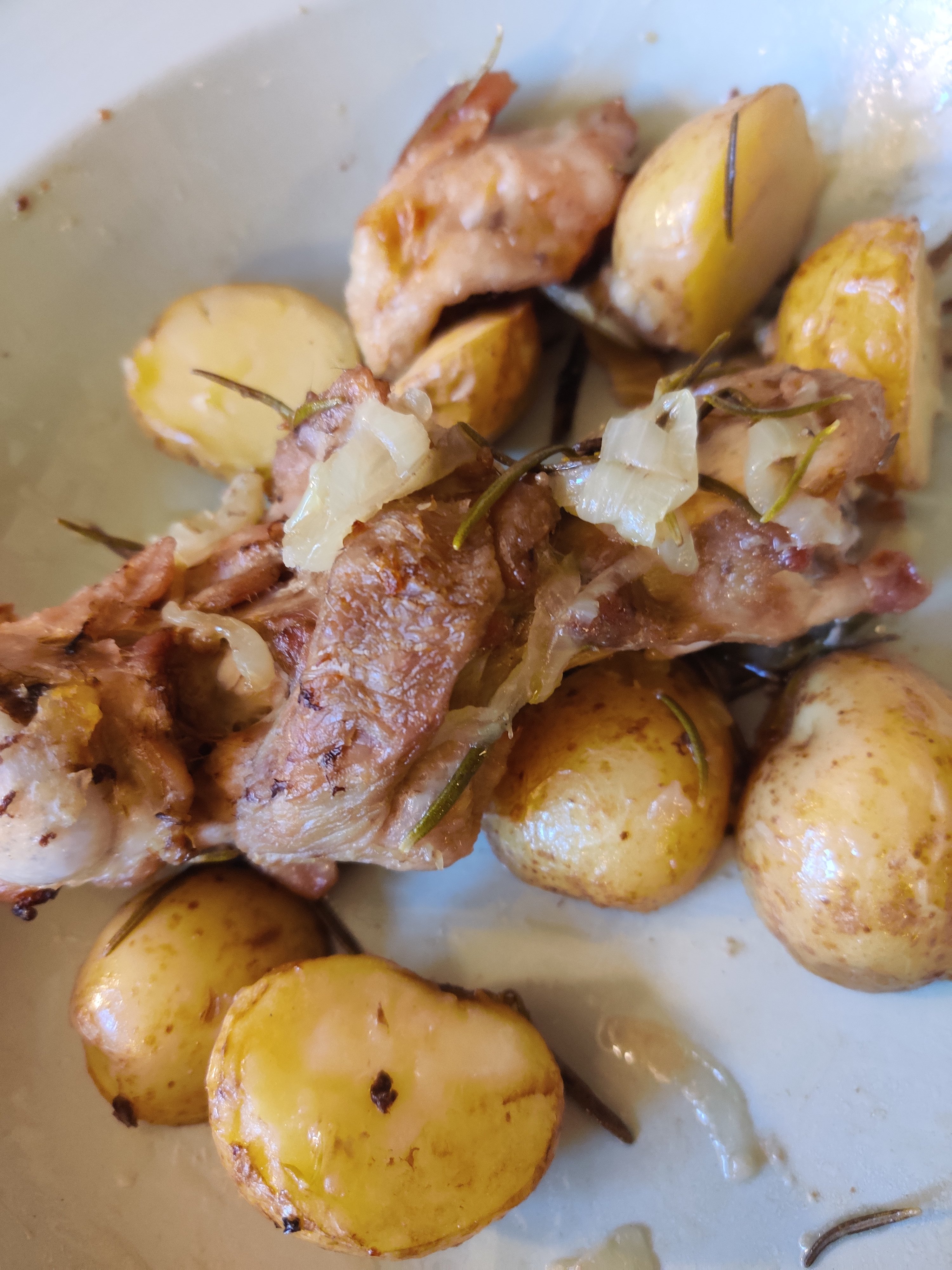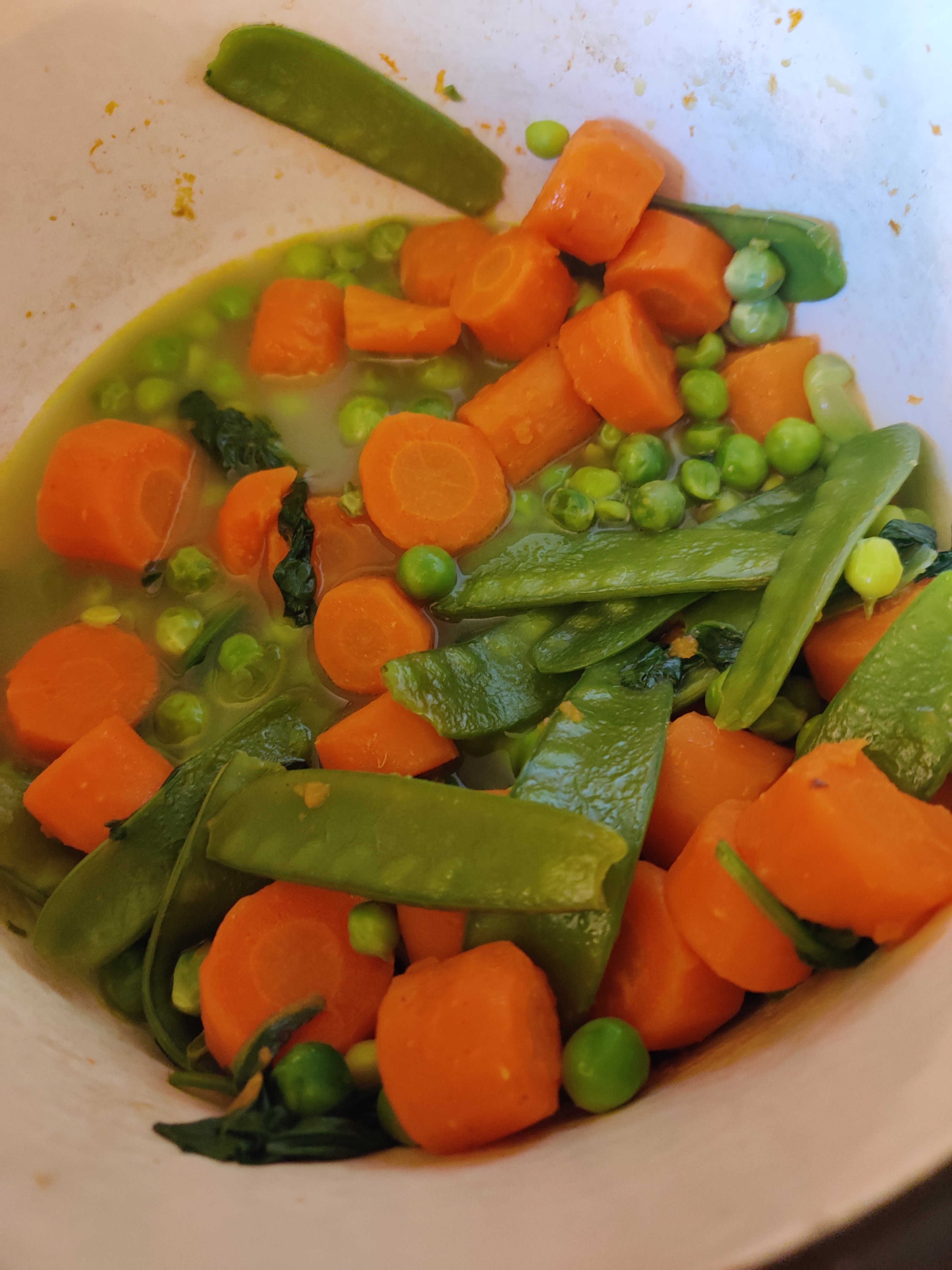 Jeudi soir, j’avais miraculeusement trouvé du cabri (voilà pourquoi je n’ai pas fait d’agneau), j’ai donc fait du cabri au four aux pommes de terre nouvelles, et une belle cassolette de petits pois (frais !), carottes, pois mange-tout et pousses d’épinard .