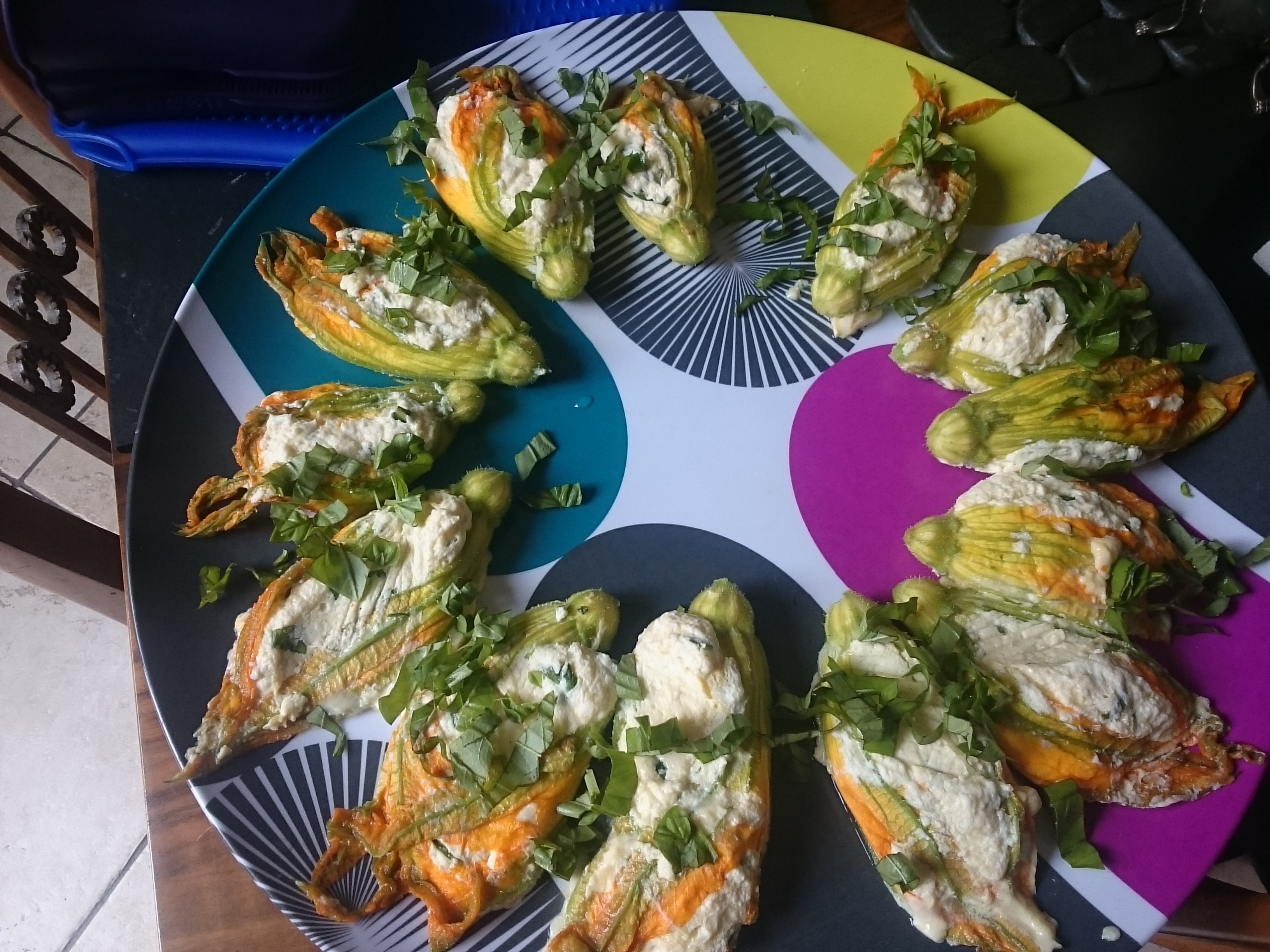 C’est une recette que j’ai mise au point en vacances en Toscane, un jour où j’avais trouvé des superbes fleurs de courgettes au marché du coin, et où nous séjournions dans un appartement de location (traduction : je disposais de 4 assiettes, 4 fourchettes, 4 couteaux, deux casseroles, une poêle et une passoire…). Elle est facile à faire, et je trouve que la cuisson à la vapeur respecte bien mieux le goût délicat des fleurs de courgettes que la friture.