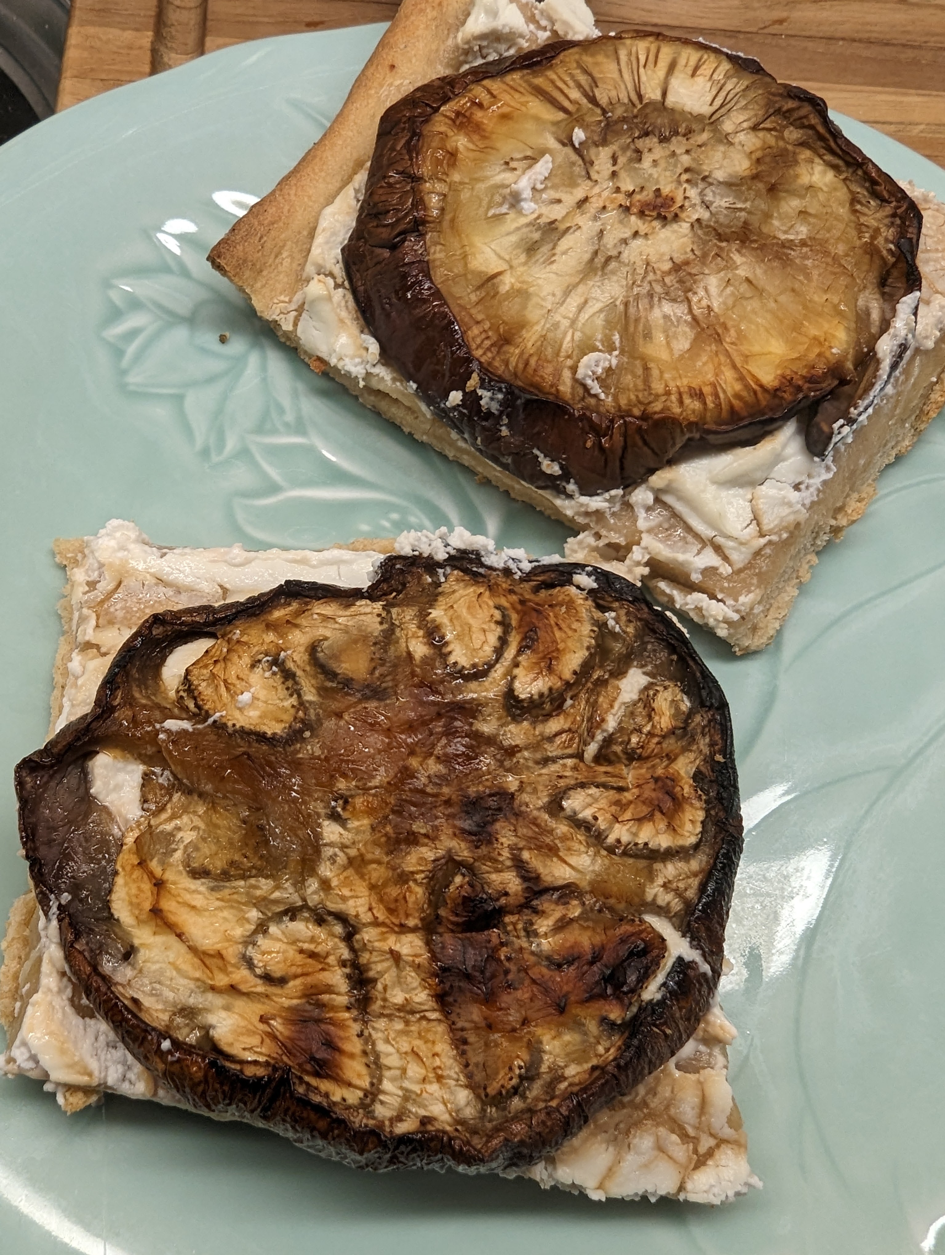 Etaler le chèvre frais sur la pâte, recouvrir avec les tranches d’aubergines, terminer la cuisson au four.