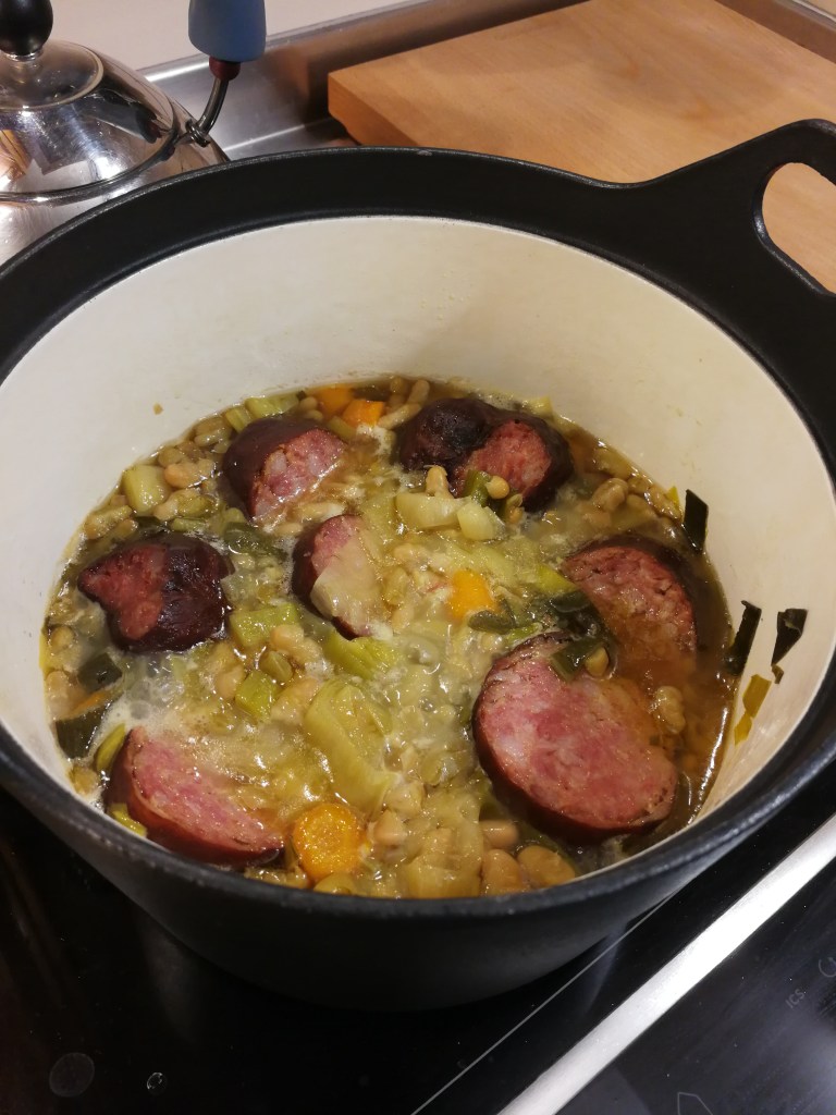 Avant de servir, retirer les saucissons de la cocotte, enlever les cure-dents, couper en tranches, puis remettre dans la cocotte. Poivrer, servir.