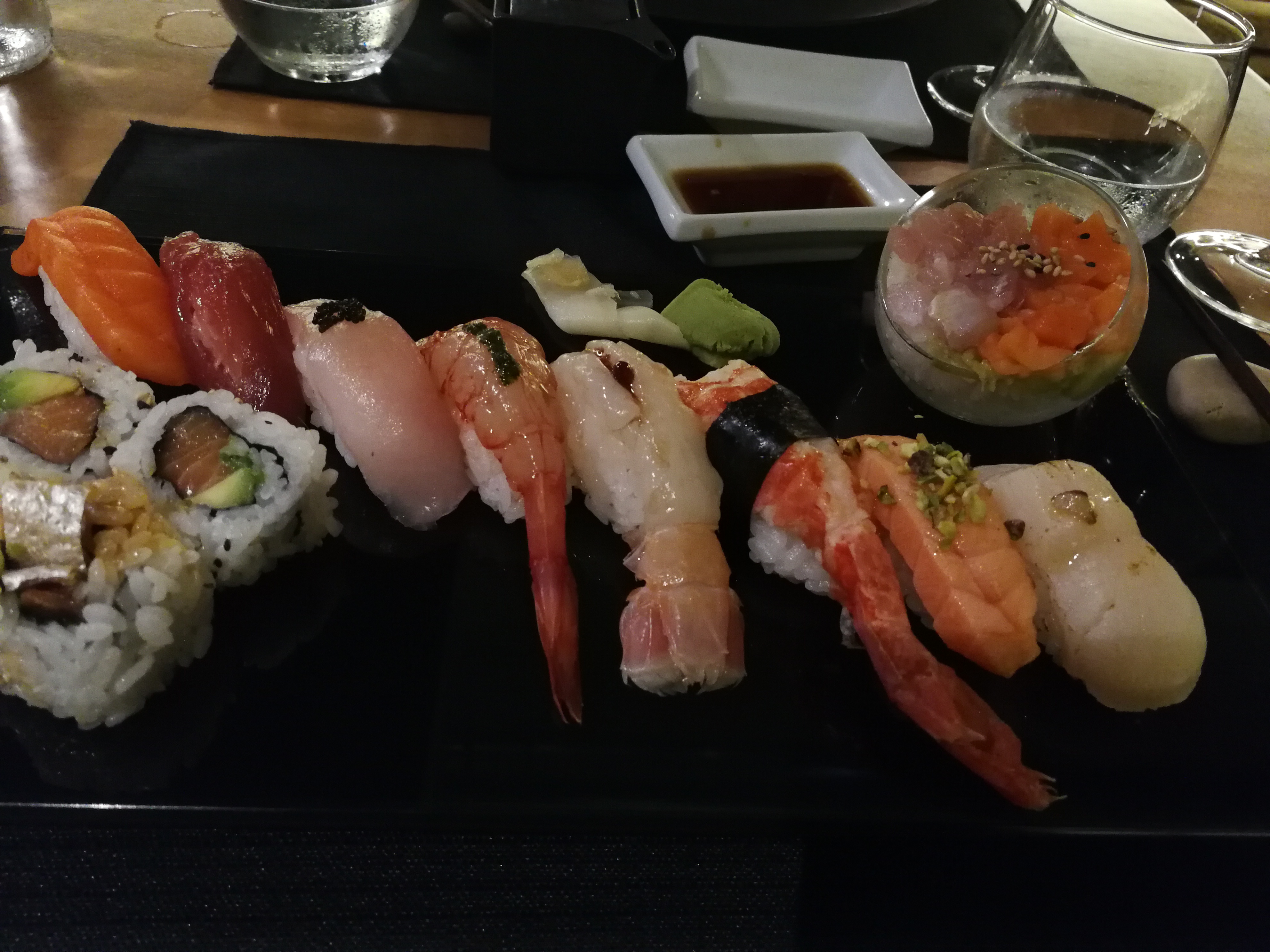 Une belle surprise dans un pays où les restaurants « exotiques » (c’est à dire de cuisine non italienne) sont rares et souvent mauvais : un restaurant japonais exceptionnel. J’y ai pris d’abord un carpaccio de saumon hyper-frais, puis un assortiment de sushis à damner un saint, et enfin une glace au gingembre. Cela faisait très longtemps que je n’avais pas mangé des sushis de cette qualité-là, et ils étaient de plus légèrement et délicieusement assaisonnés (ou aromatisés plutôt, chacun différemment), la perfection.