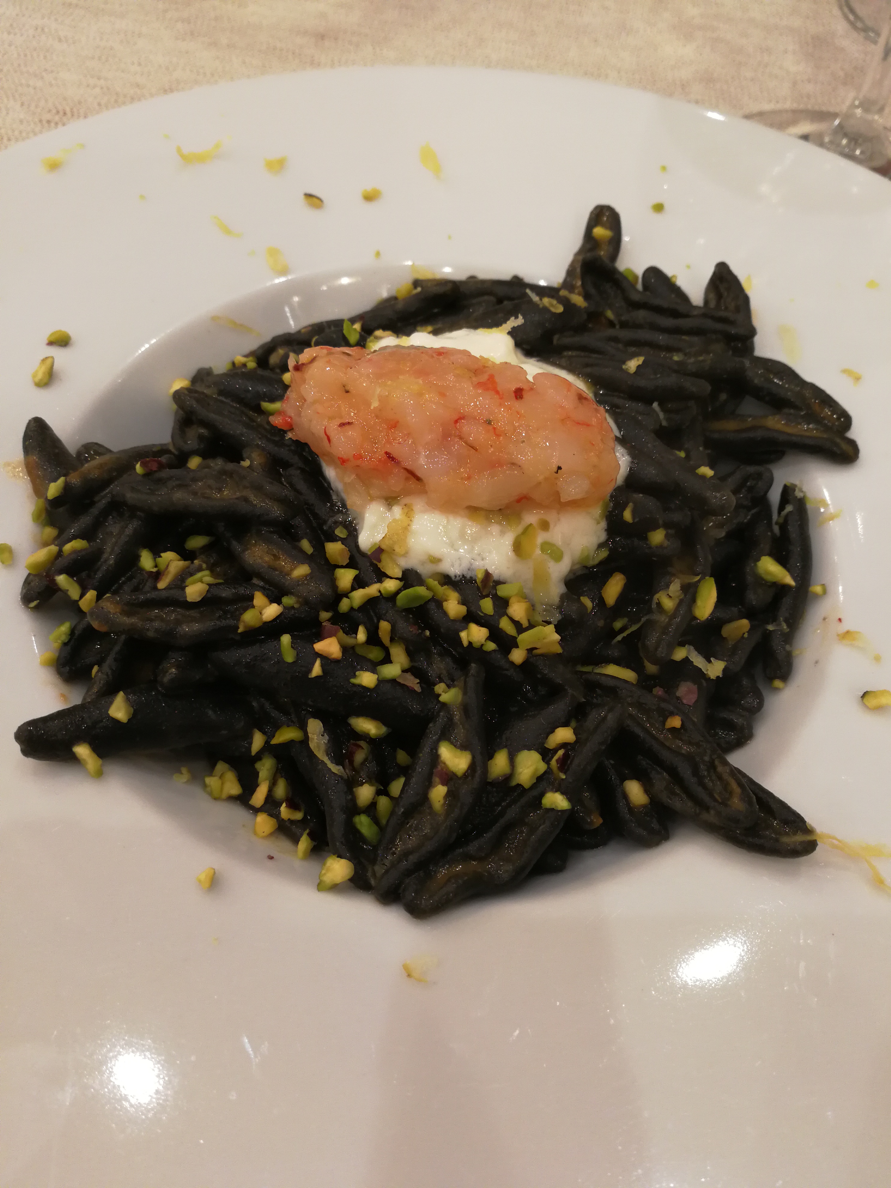 Même système que la boucherie-restaurant, mais ici pour une poissonnerie. Par contre, celle-ci est assez chic (tout en restant dans des prix très raisonnables). Nous avons d’abord partagé un antipasto misto, puis j’ai pris des pâtes à l’encre de seiche, à la burrata et au tartare de crevettes crues succulentes.
