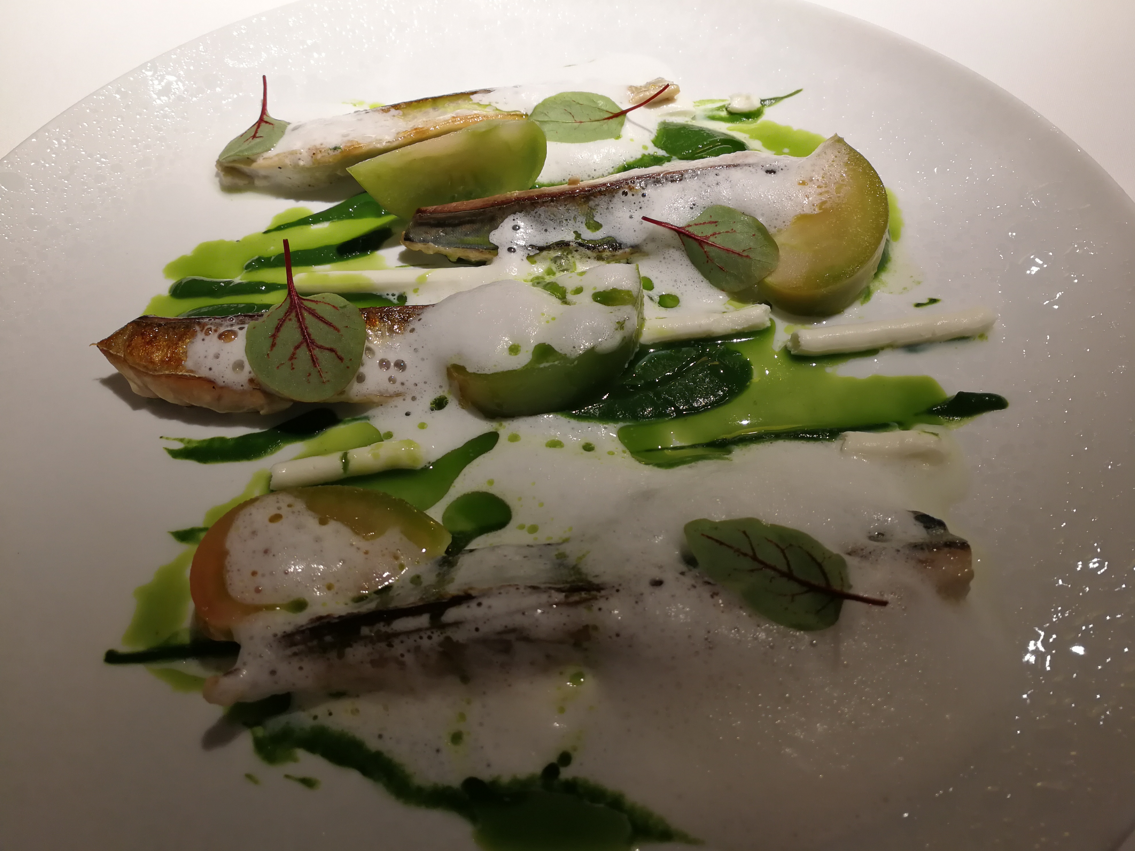 Le Guide du Routard l’indiquait comme « bon restaurant », quand nous sommes arrivés nous avons vu qu’il avait une étoile au Michelin… Qu’à cela ne tienne, nous en avons profité ! Superbe repas de cuisine italienne moderniste, sommelier passionné de son métier, nous n’avons pas regretté ! J’ai commencé par un ceviche de mérou aux agretti (légume acidulé appelé « soude » en français, aussi connu sous le nom de barba di frate) et au yuzu, puis j’ai pris un savoureux filet de maquereau à la tomate verte, au chèvre frais et au citron.