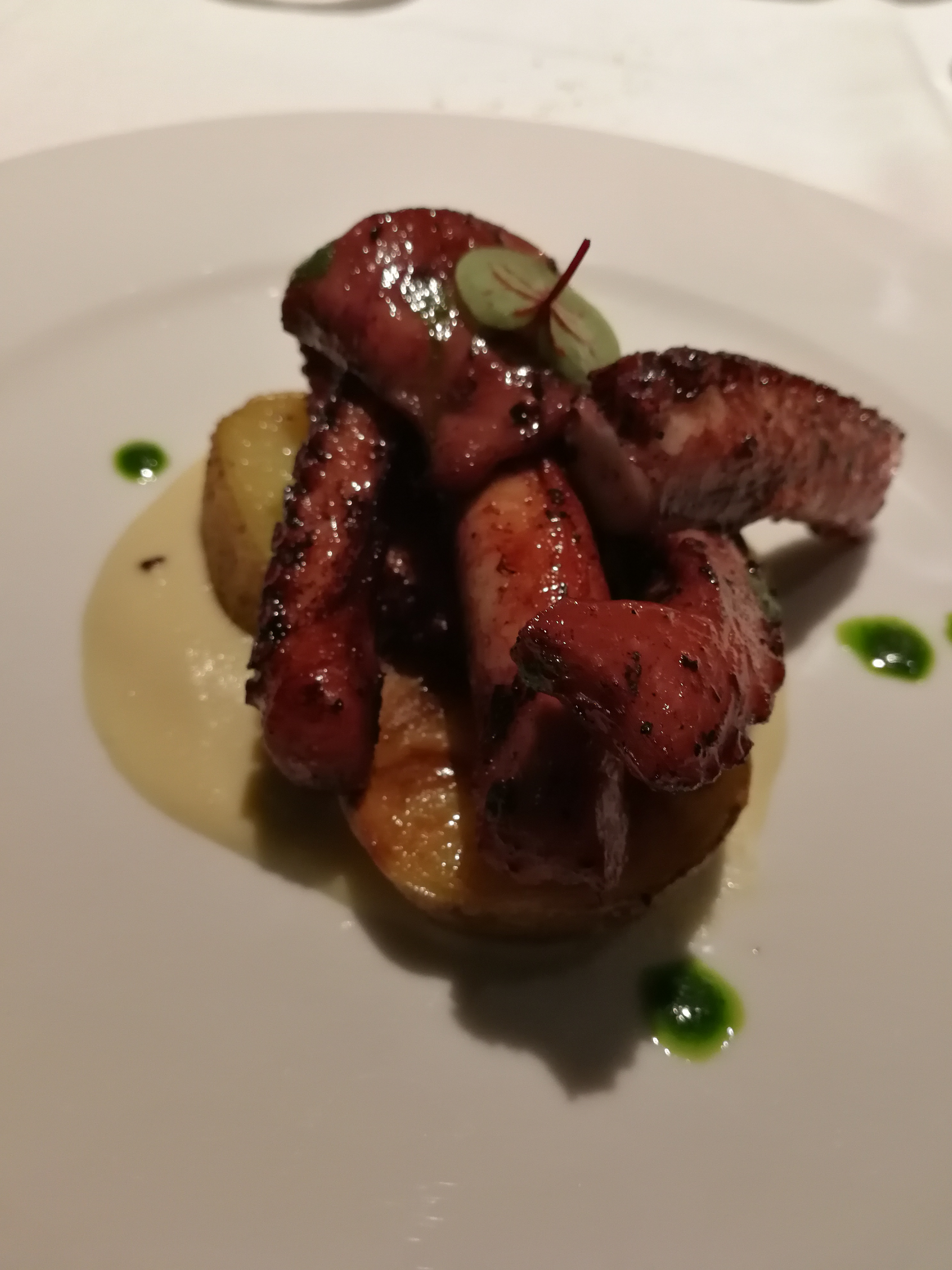 Restaurant d’hôtel assez excentré, qui a une très bonne réputation bien méritée. J’ai d’abord pris du poulpe cuisson lente très savoureux, puis un filet de poisson de mer (je ne me souviens plus lequel) très réussi.