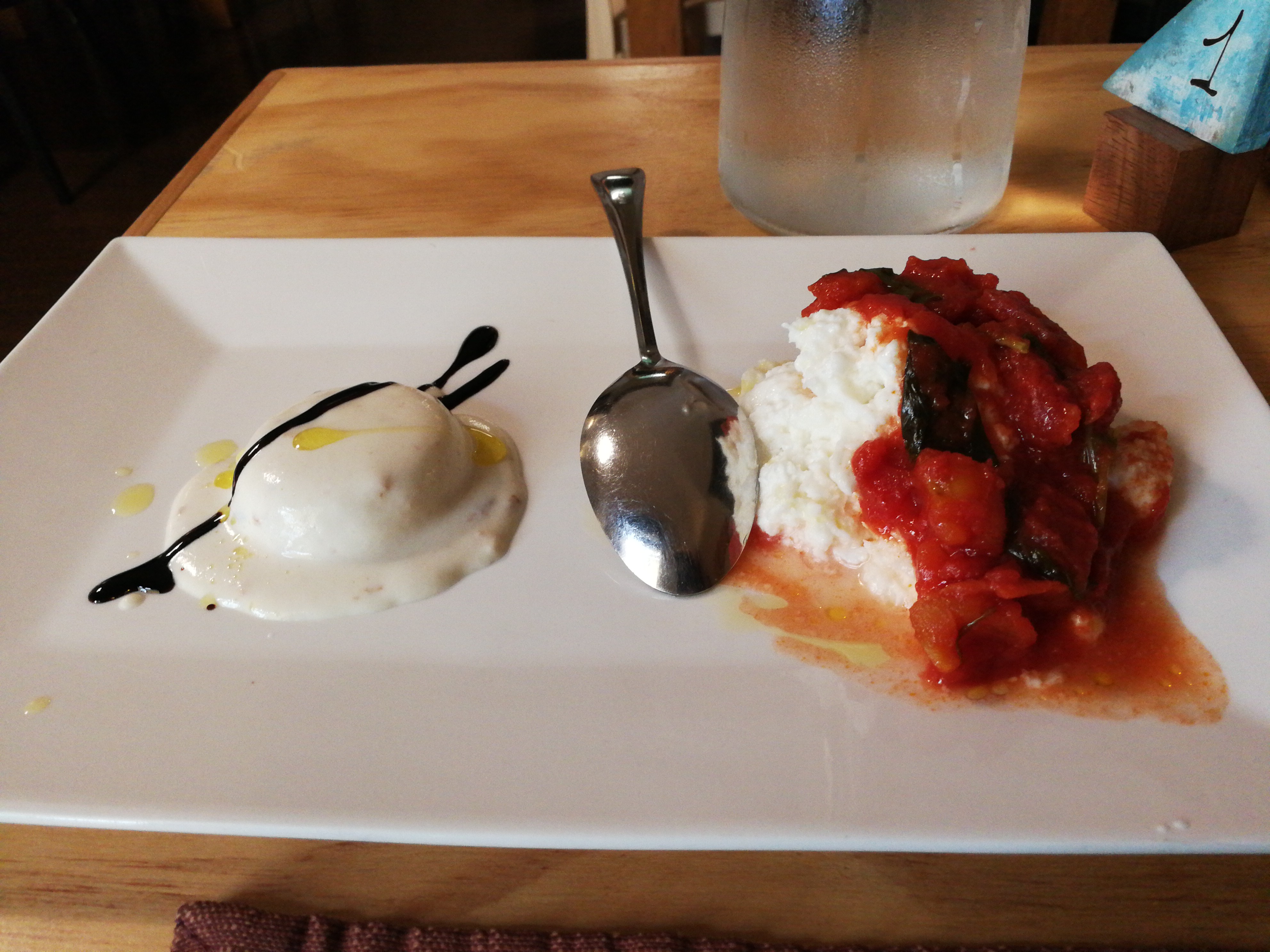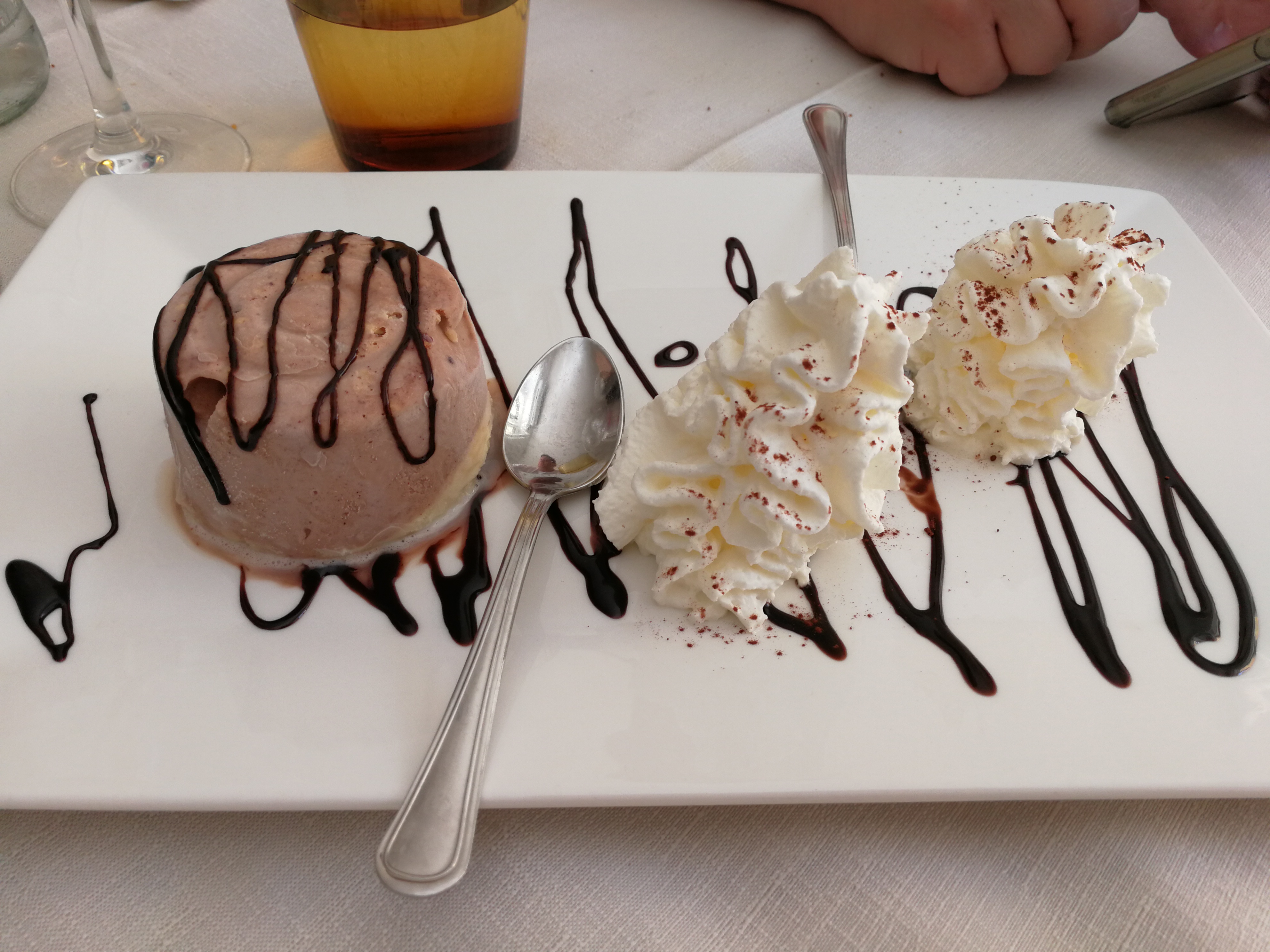Petit restaurant juste en dehors de la vieille ville, très bon. Nous avons d’abord partagé une entrée de flan au Parmesan et burrata, puis j’ai pris des pâtes tomate et burrata (comment ça, moi, aimer la burrata ? Quelle idée…).
