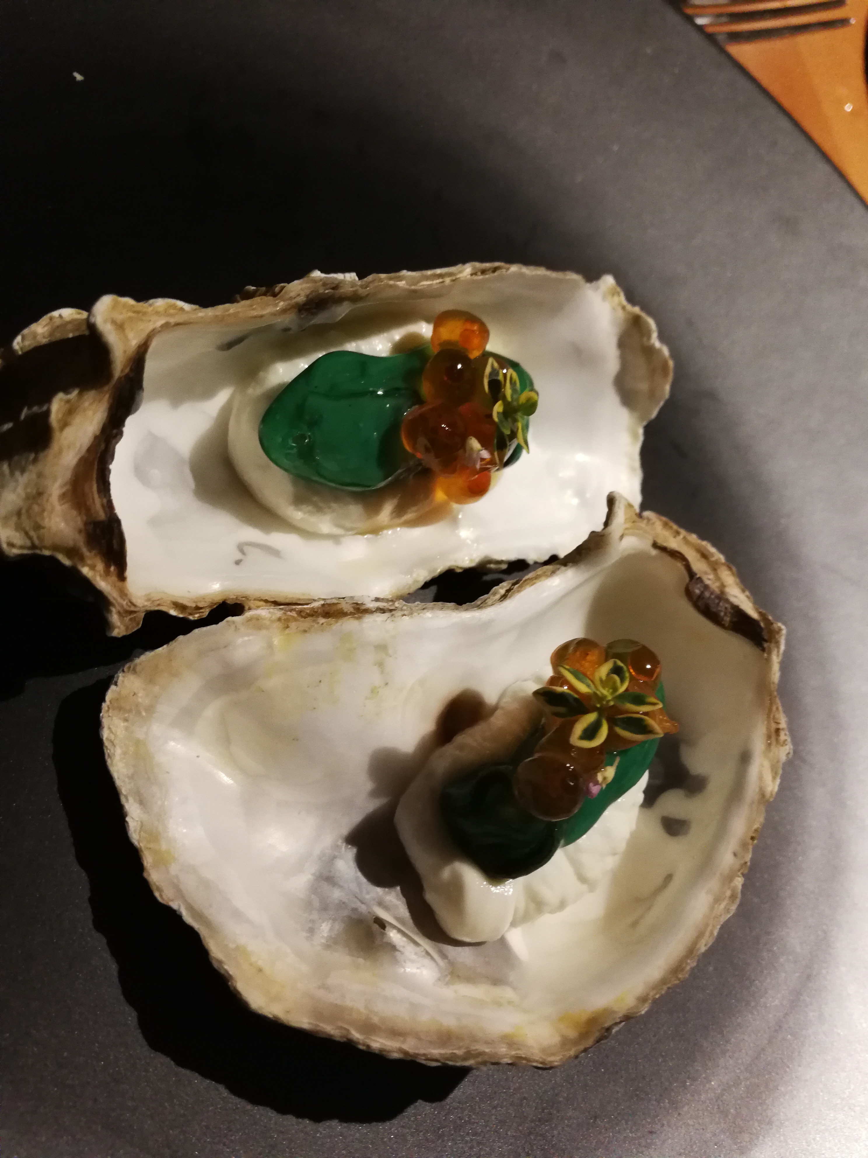 - Huître, gelée marine, caviar de saumon, oursins au pain et amandes