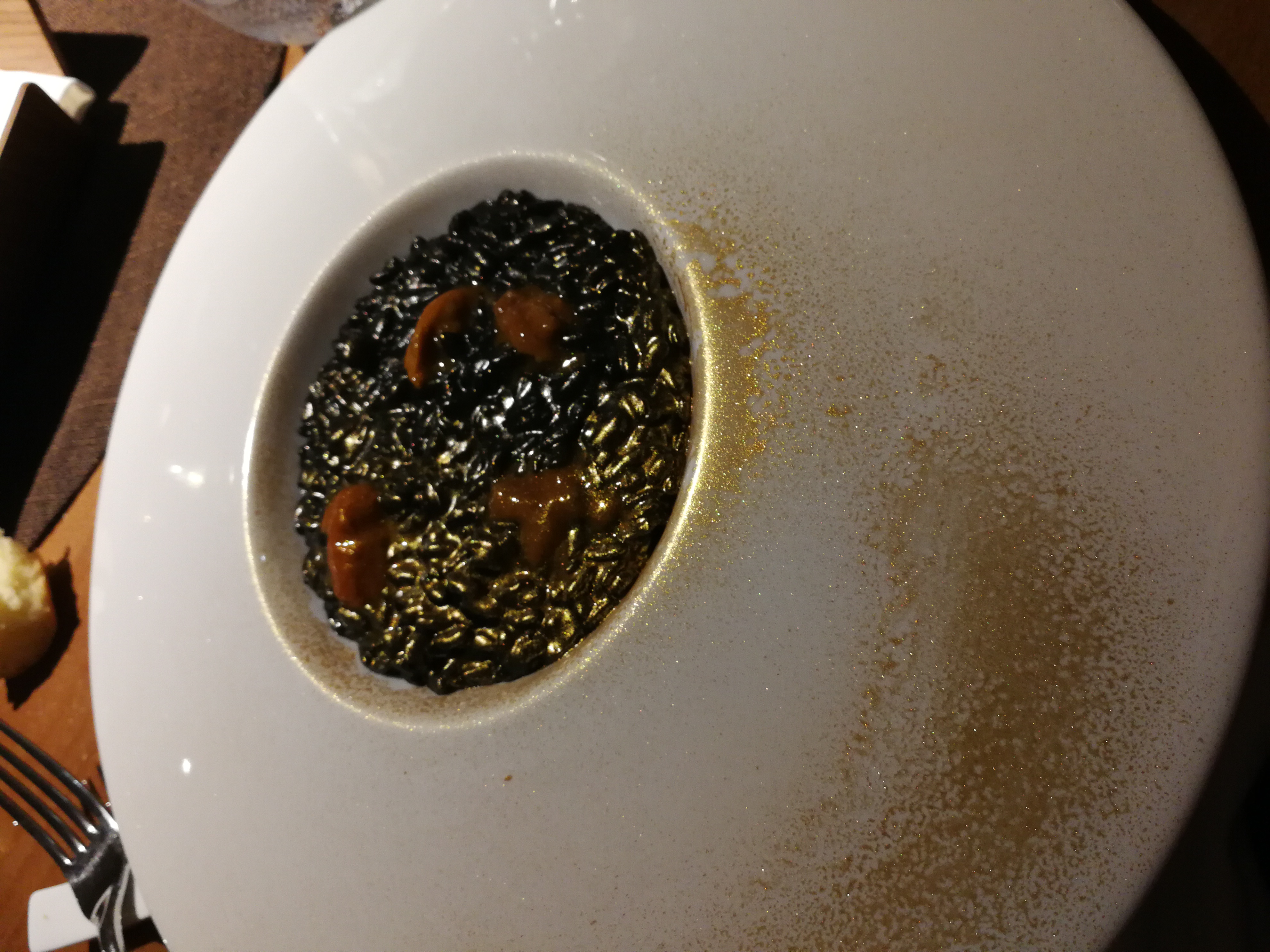 - Risotto aux calamars et encre de seiche, aux oursins et à l’or