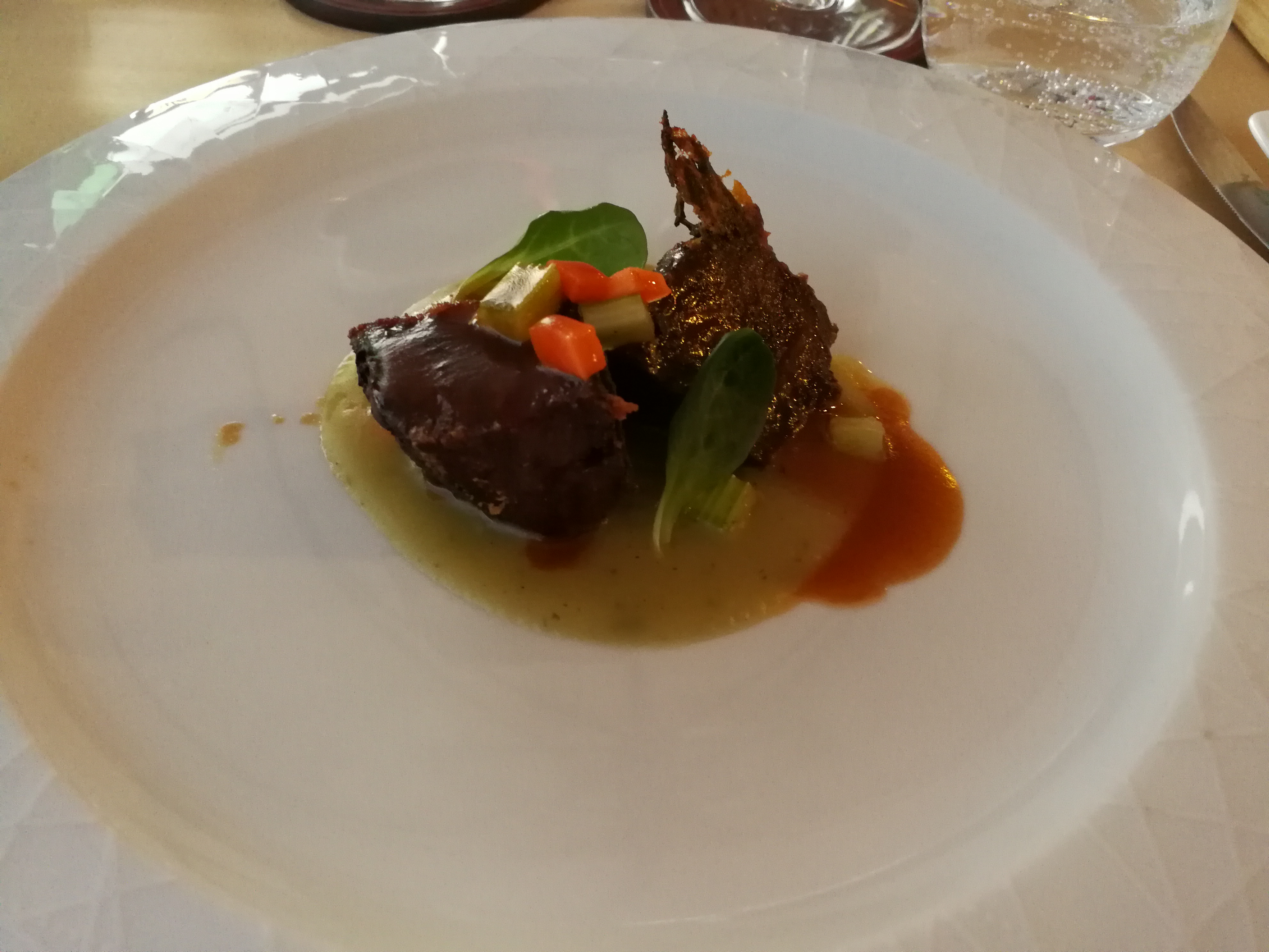 Osteria Fornelli : il s’agit là d’un restaurant bistronomique, endroit relax et nourriture de haut vol, avec en prime une vue splendide. Nous avons pris le menu en quatre plats. Normalement, il s’agirait d’une entrée, d’un primo, d’un plat et d’un dessert, mais à ma demande, nous avons pu remplacer le dessert par une deuxième entrée (servie en début de repas, évidemment). C’était délicieux, de la cuisine italienne moderne, superbement bien réalisée. Nous avons commencé avec un œuf parfait aux asperges et Pecorino, puis continué avec de la joue de veau à la crème de pommes de terre et aux légumes croquants, inoubliable (des morceaux de joue bien cuits et moelleux, avec un extérieur croustillant) :
