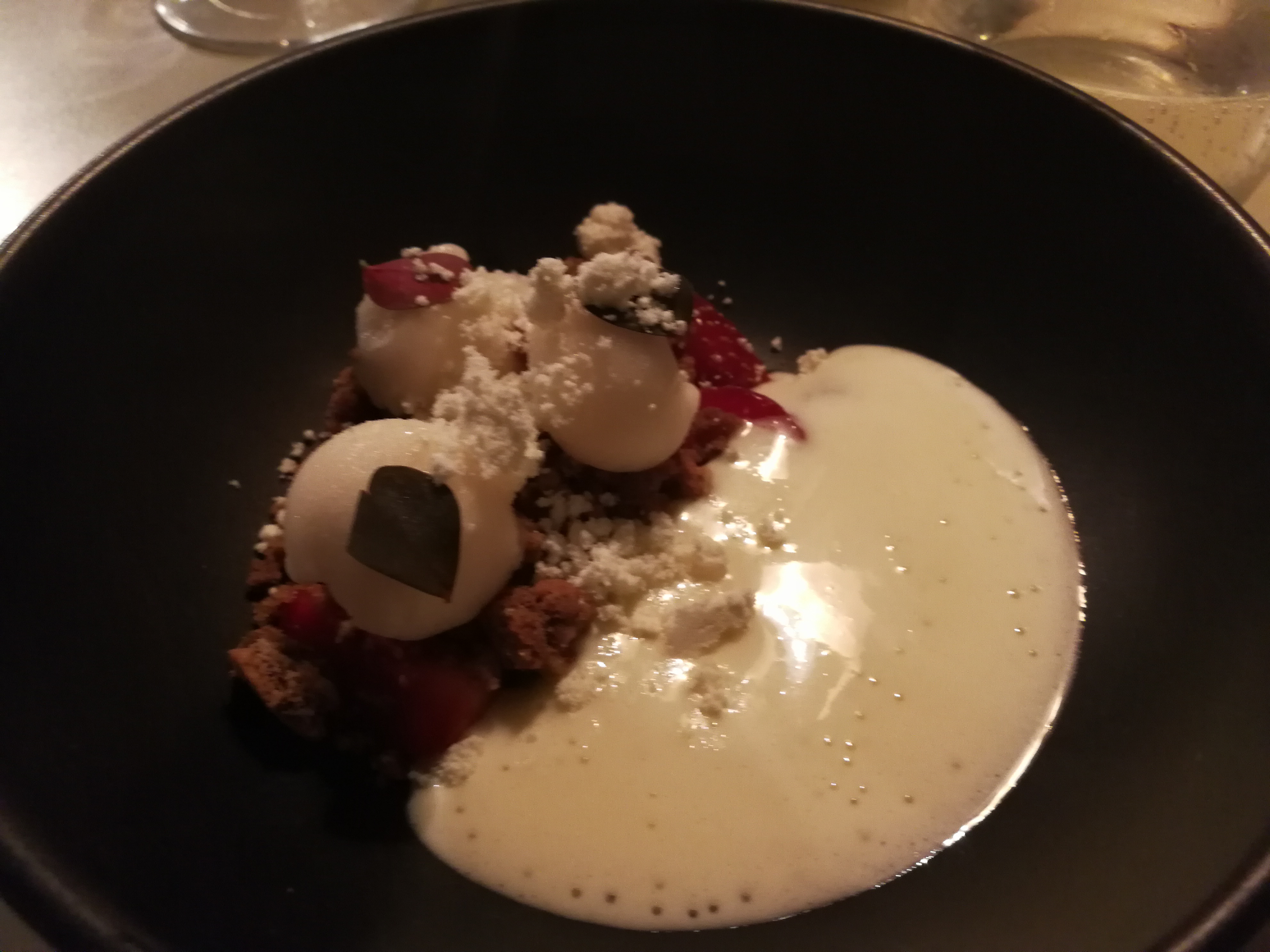 Bodil : c’est mon coup de cœur en Scandinavie, sans hésitation. Il s’agit d’un petit restaurant de nouvelle cuisine Danoise, situé dans un quartier calme non touristique, et qui propose un menu unique (deux choix de deuxième entrée, c’est tout). Nous avons pris le wine pairing, qui était parfait. En première entrée, il y avait du « Sandre, chou, blé noir ». Nous avions ensuite choisi le « Tartare de boeuf, cornichon, ciboulette, boudin ». Le plat était du « Gîte de boeuf, oignon, pomme de terre, chou », et le dessert « Fraise, chocolat blanc, fleur de sureau » :