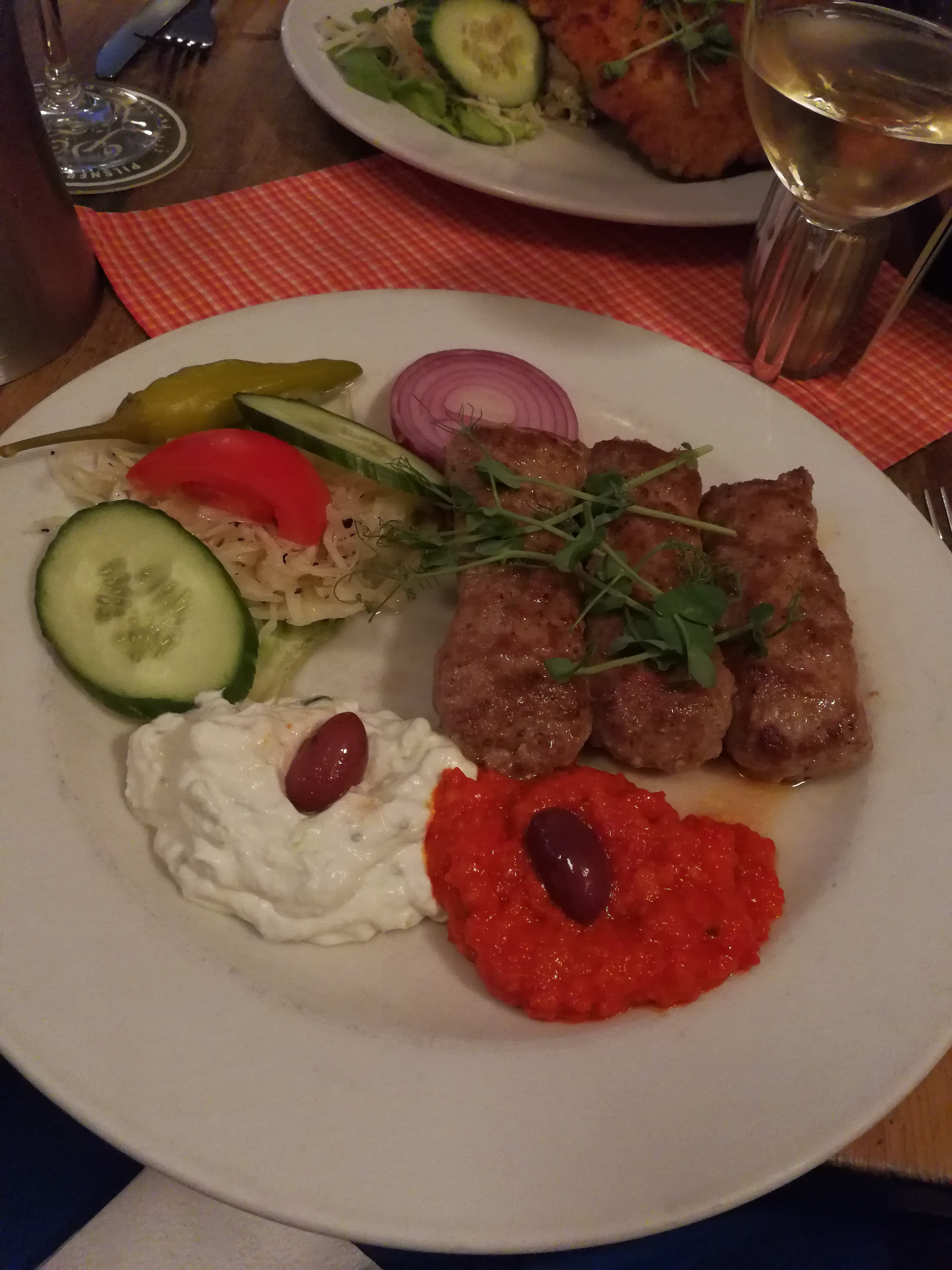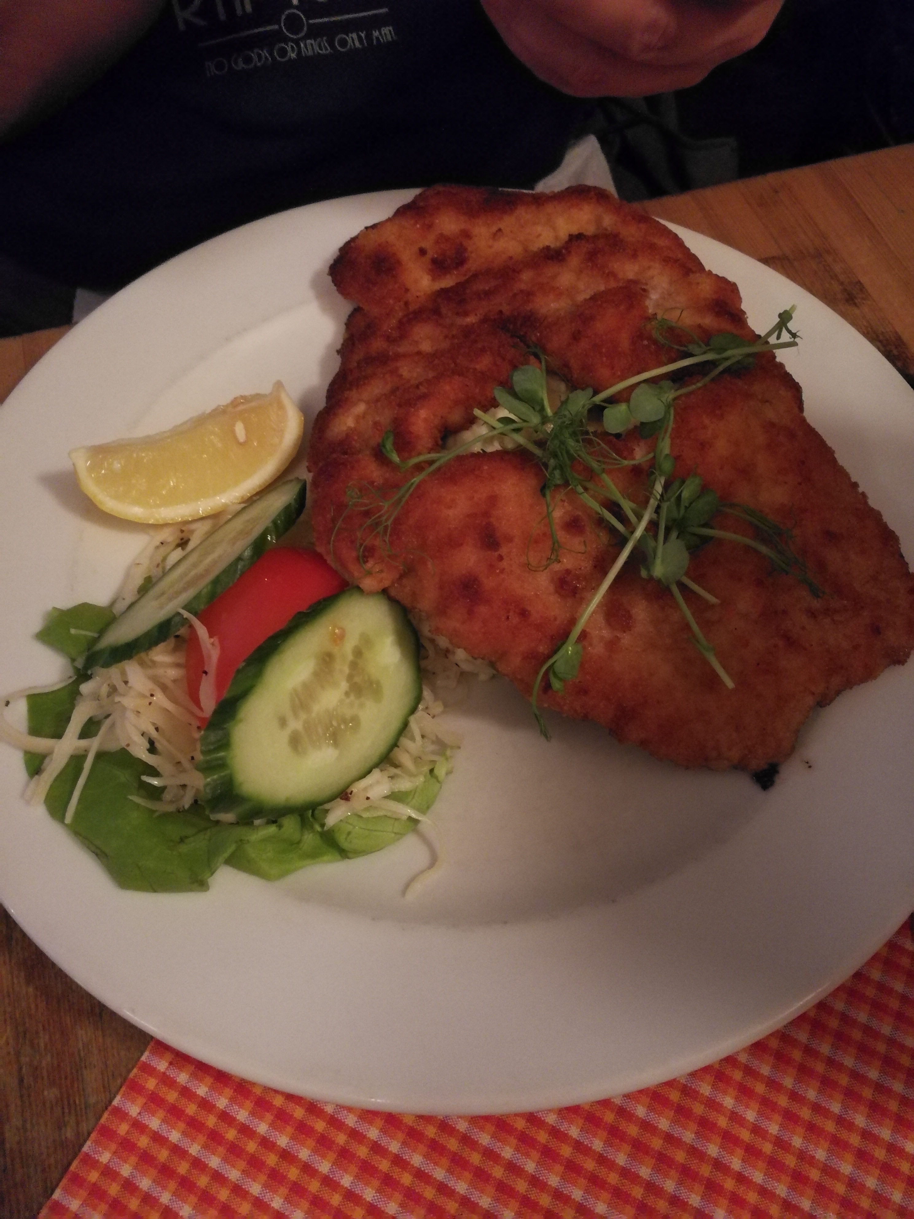 Soldaten Svejk : un excellent restaurant Tchèque découvert tout à fait par hasard en passant devant. Je devrais plutôt dire une vraie brasserie Tchèque, en entrant j’ai eu l’impression de me retrouver à Prague dans les années 80 tellement l’ambiance et la déco étaient les mêmes ! Nous nous sommes partagé une schnitzel à la Pragoise, servie avec de la salade de chou et de la salade de pomme de terre, et des Čevabčiči avec ajvar, pommes de terre rissolées et salade de chou :