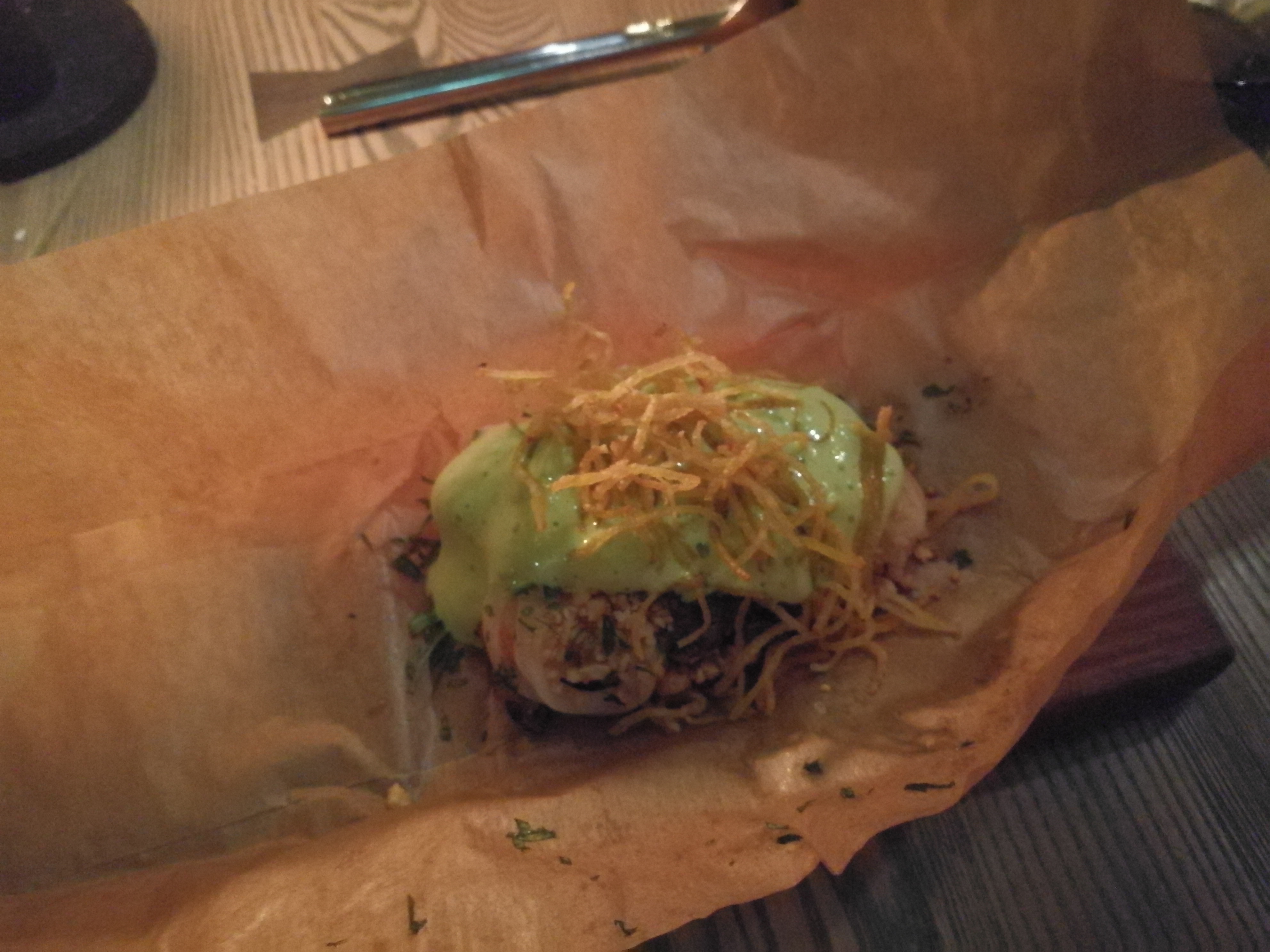 Bakfikan : un tout petit restaurant juste à côté de la place où se trouve le marché, très couru, qui ne sert que des produits de la mer, avec une carte très courte. En entrée, j’ai pris le très classique (et ici très bien exécuté) toast aux crevettes mayonnaise et aneth. En plat, j’ai choisi des crevettes fumées (une nouveauté pour moi, j’ai beaucoup aimé) avec de l’aïoli. Aucun accompagnement prévu, par contre (ni inclus, ni à commander), hormis le pain.