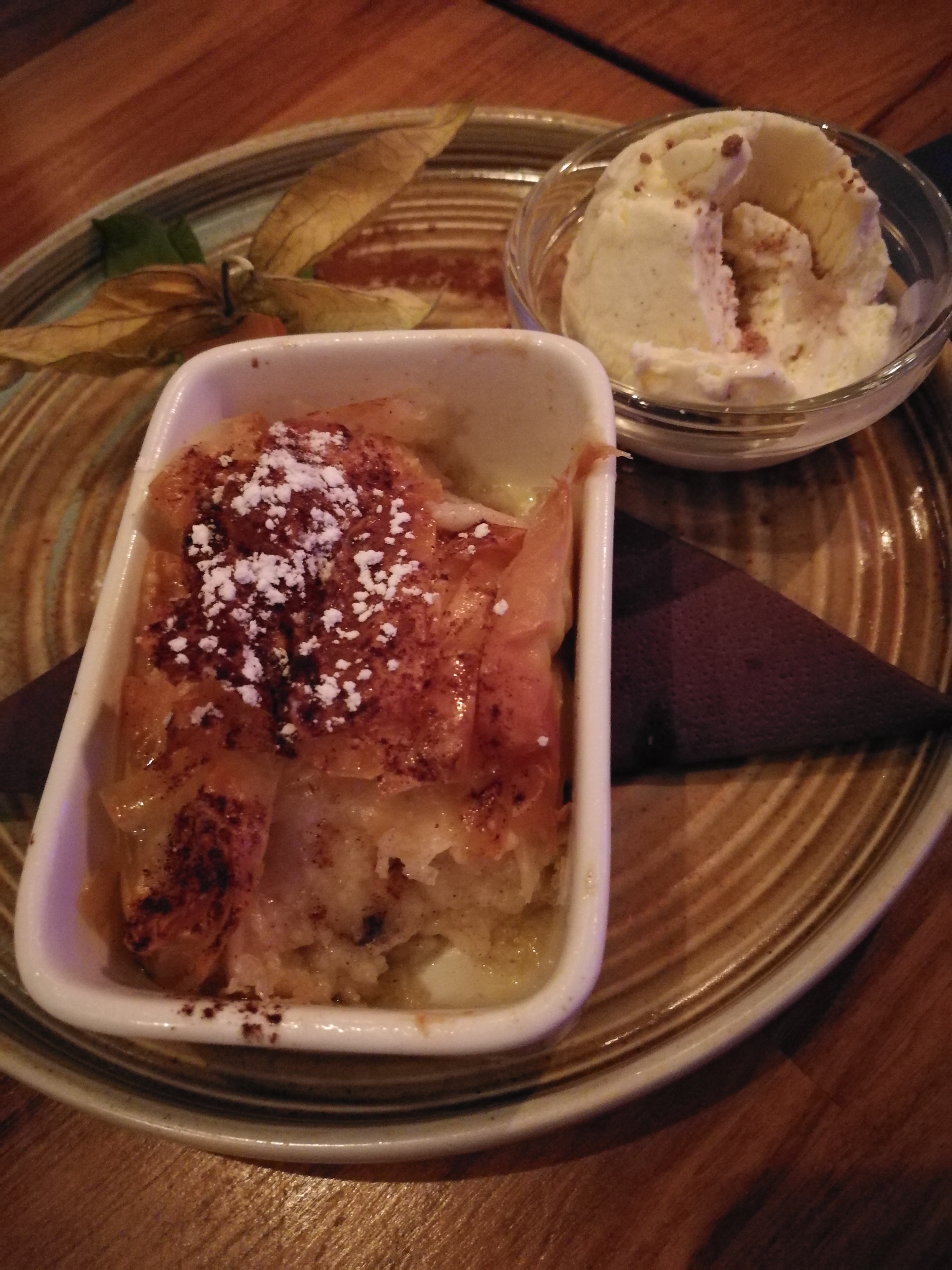 Väkst : un restaurant branché de nouvelle cuisine Danoise, près de l’église Sankt Peter. Nous avons fait un remarquable repas, dans un esprit locavore, avec une maîtrise impressionnante des associations de goûts et de textures. Nous avons succombé à la « formule complète », menu avec apéritif, vins, eau et café, et nous ne l’avons pas regretté. Nous avons tout d’abord dégusté des « Coquilles saint Jacques, peau de poulet croustillante et pomme de terre », puis du « Porc de Grambogaard, moutarde et couenne croustillante », et enfin un « Pudding Danois, glace salée au sucre brun » :