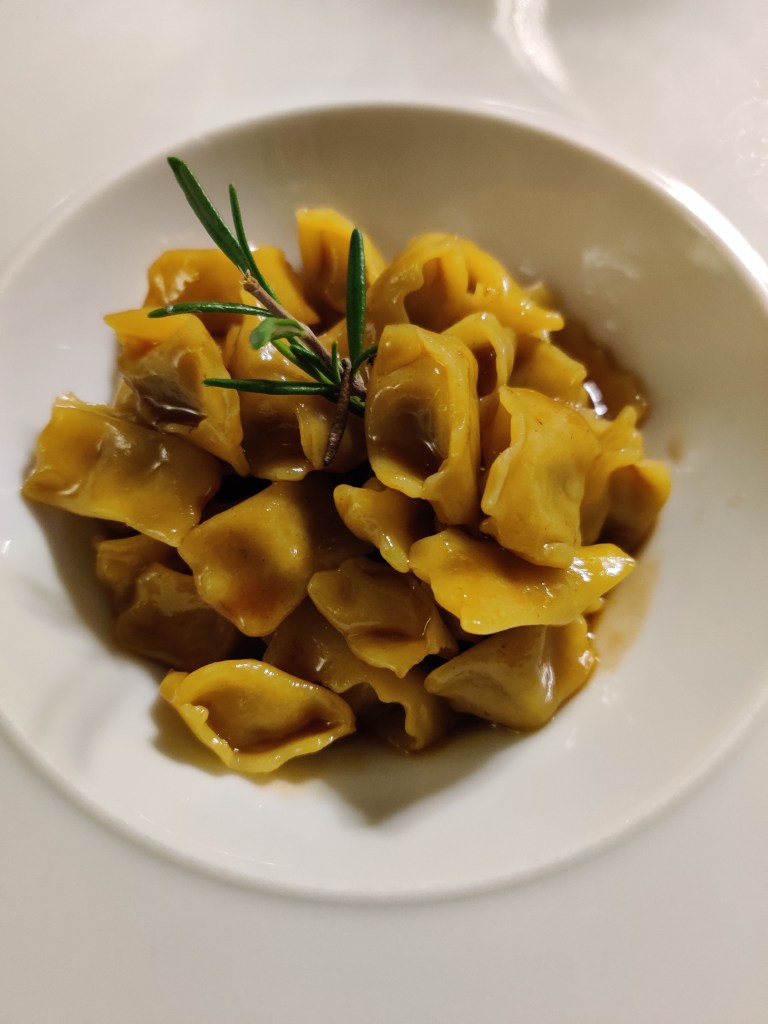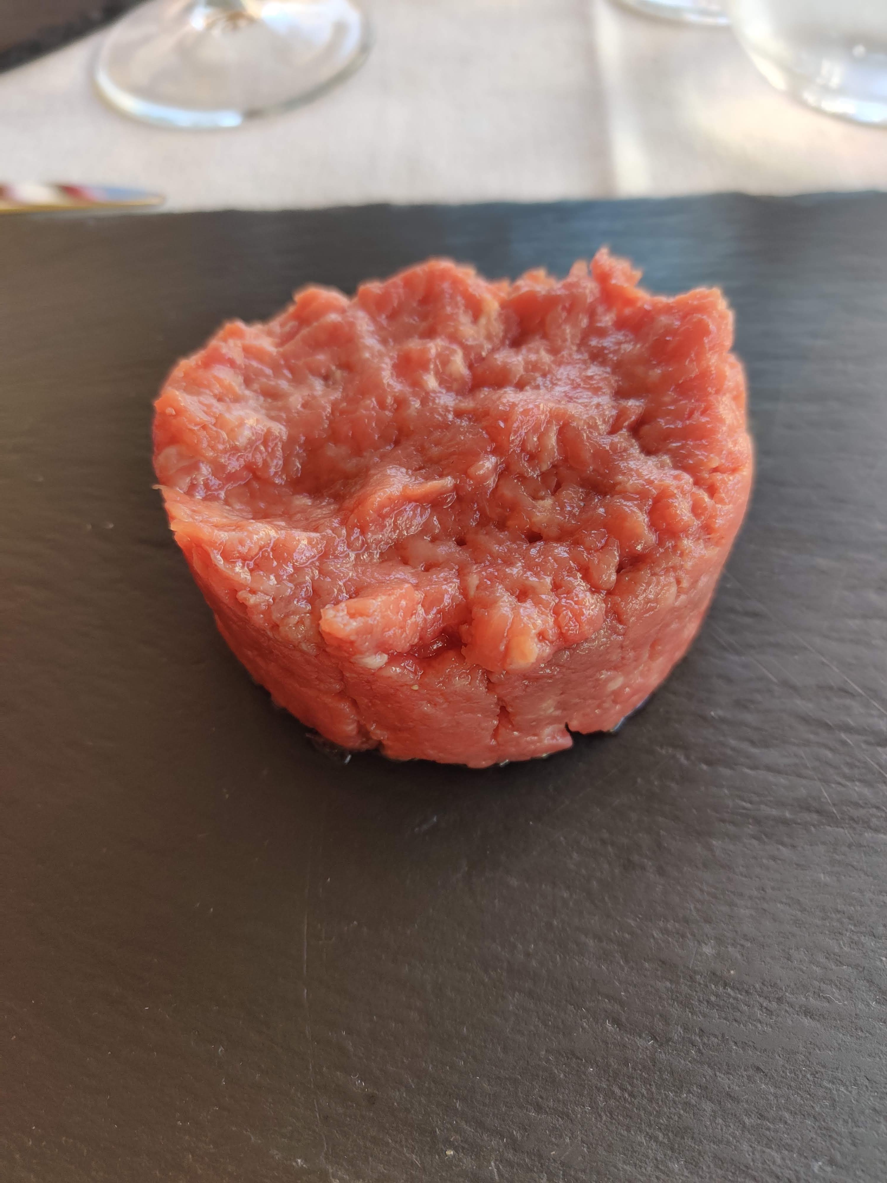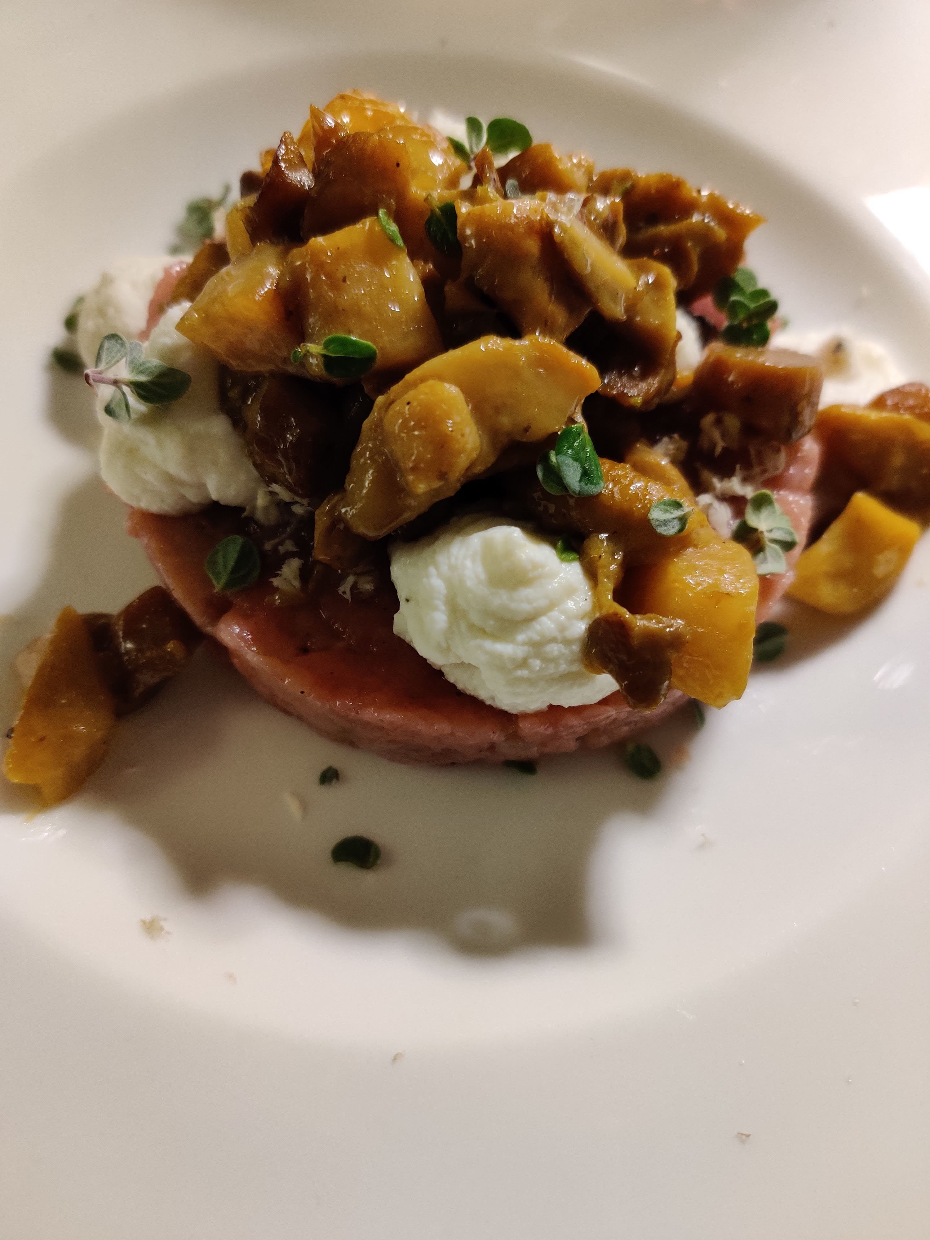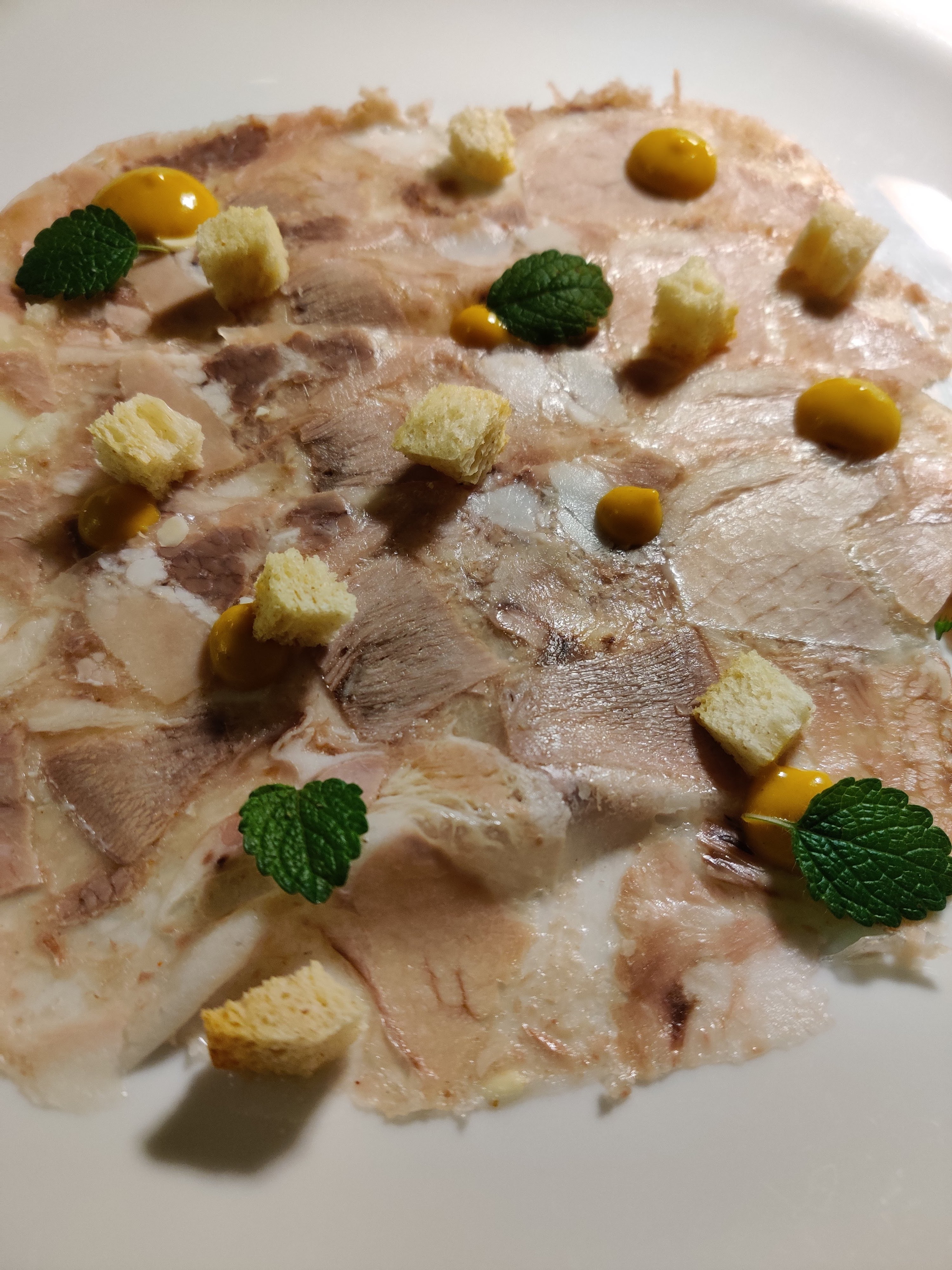 Samedi soir, nous avons profité du restaurant de la Locanda La Raia (où nous résidions pour le weekend, tout près de Gavi, dans la partie du Piémont attenante à la Ligurie). Ce fut un très bon repas de cuisine traditionnelle locale modernisée. J’ai débuté par une assiette de sublime testa in cassetta (spécialité de Gavi, une sorte de jambon persillé aromatisé aux épices et coupé très fin), après quoi j’ai succombé à mon péché mignon, le tartare piémontais, ici agrémenté de bolets et de ricotta. J’ai fini par des très classiques et délicieux ravioli dell plin.