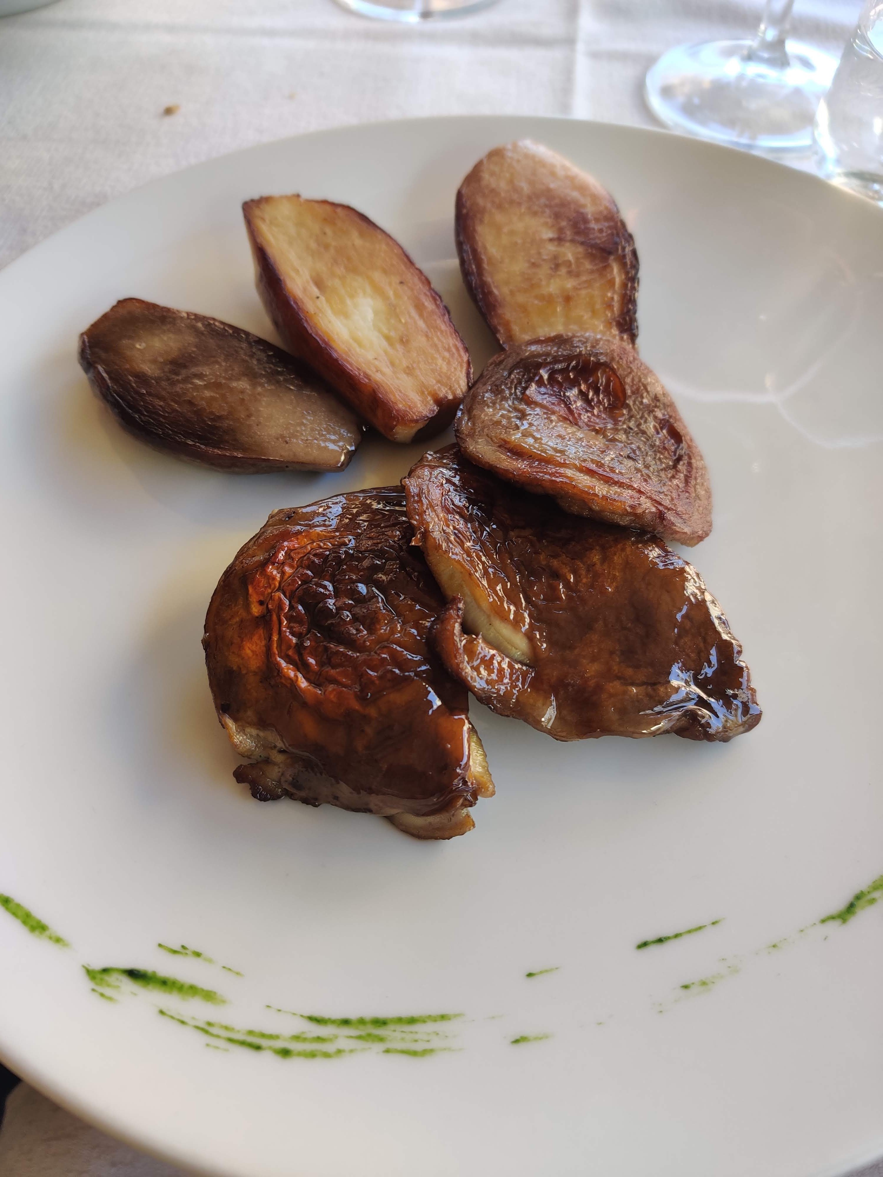 Vendredi soir, nous avons mangé à la Table du Valrose. On nous en avait dit beaucoup de bien, mais c’était encore mieux que ce que nous espérions ! Nous avons fait un repas fantastique. Les deux plats qui m’ont le plus marquée furent les asperges blanches, croquantes (c’est la première fois que je mange des asperges blanches croquantes réussies) et savoureuses, et le terre et mer de morilles et ormeaux – je n’ai jamais mangé des morilles pareilles, moelleuses et au goût intense, une tuerie !
