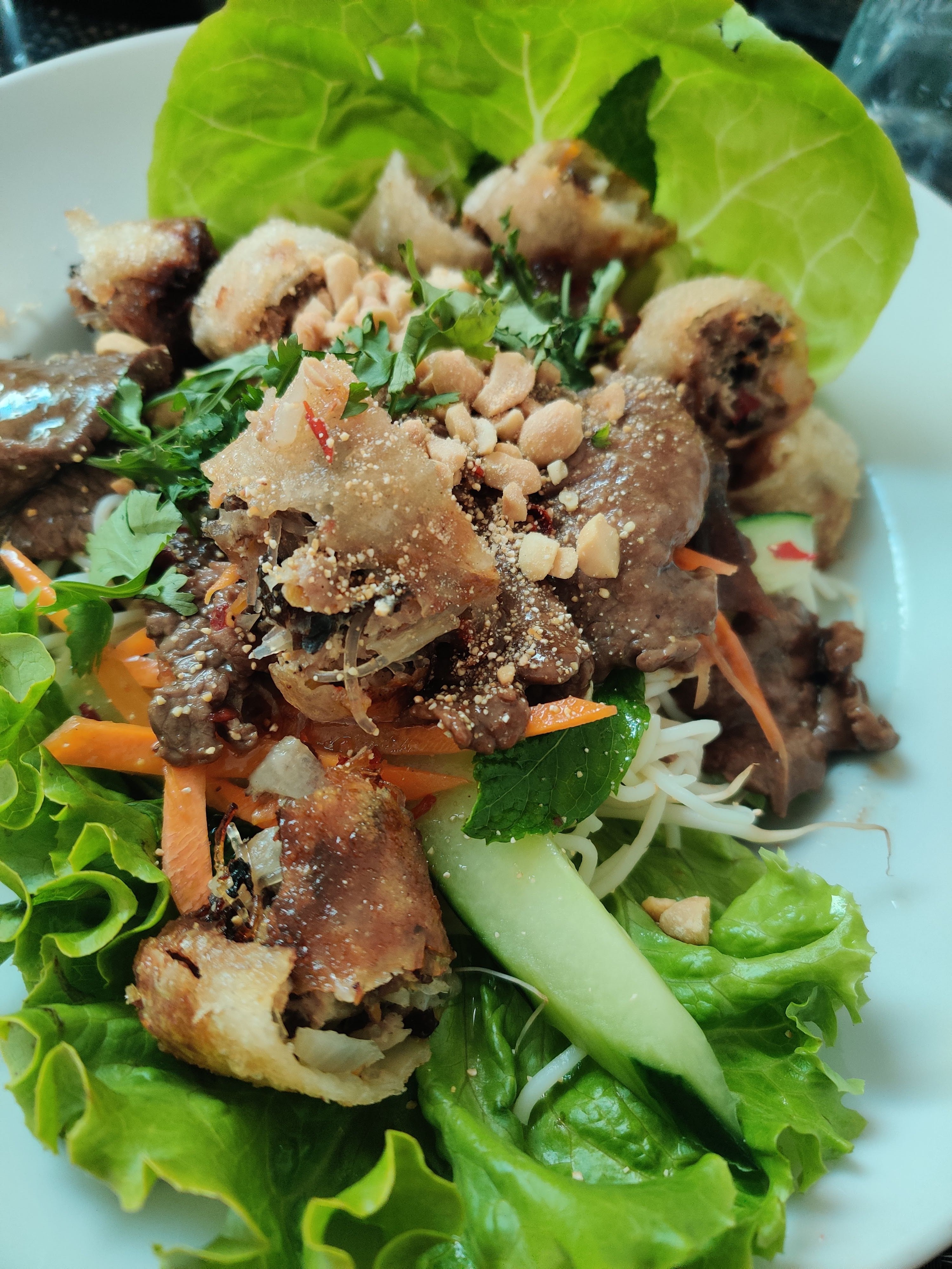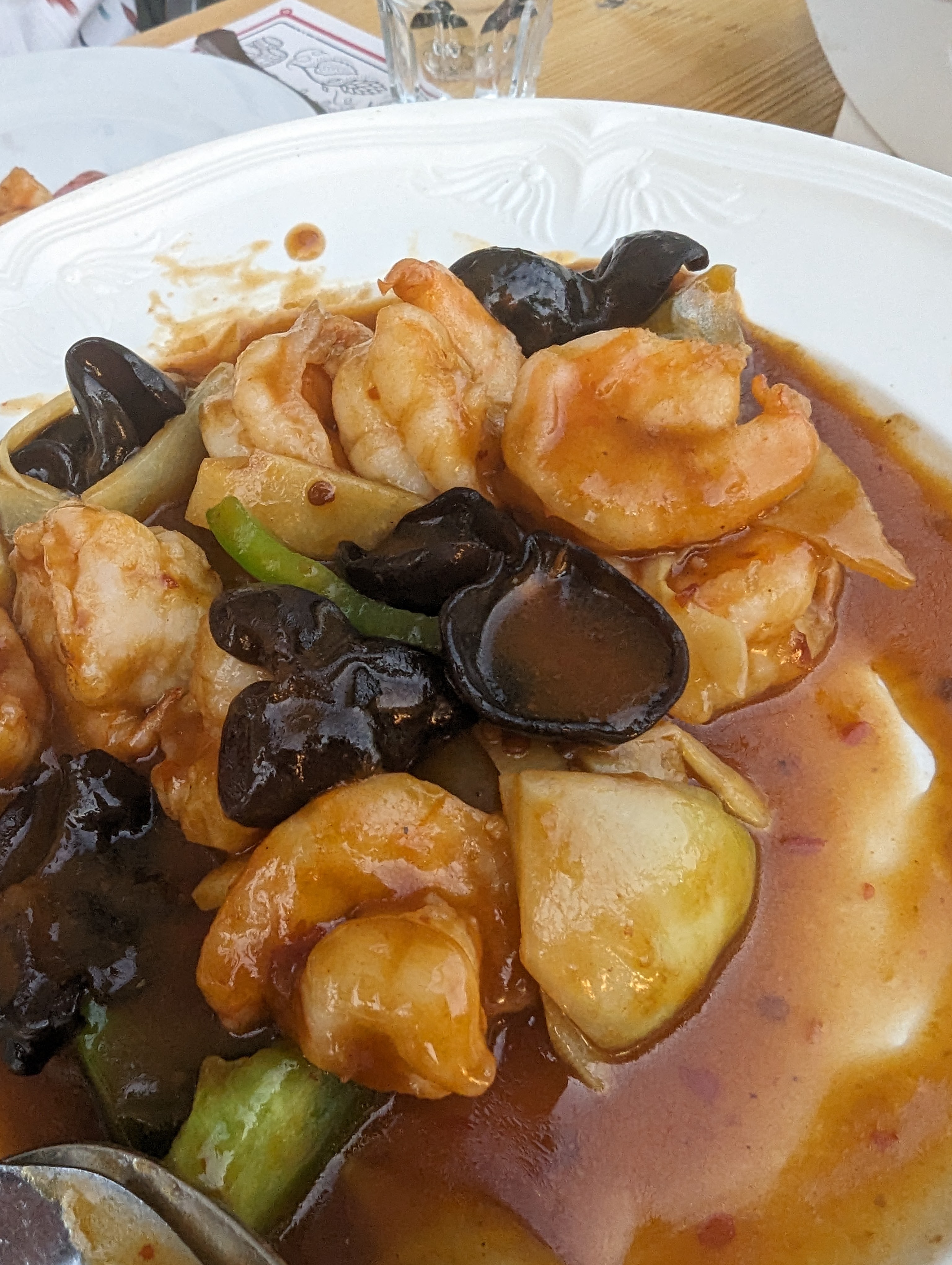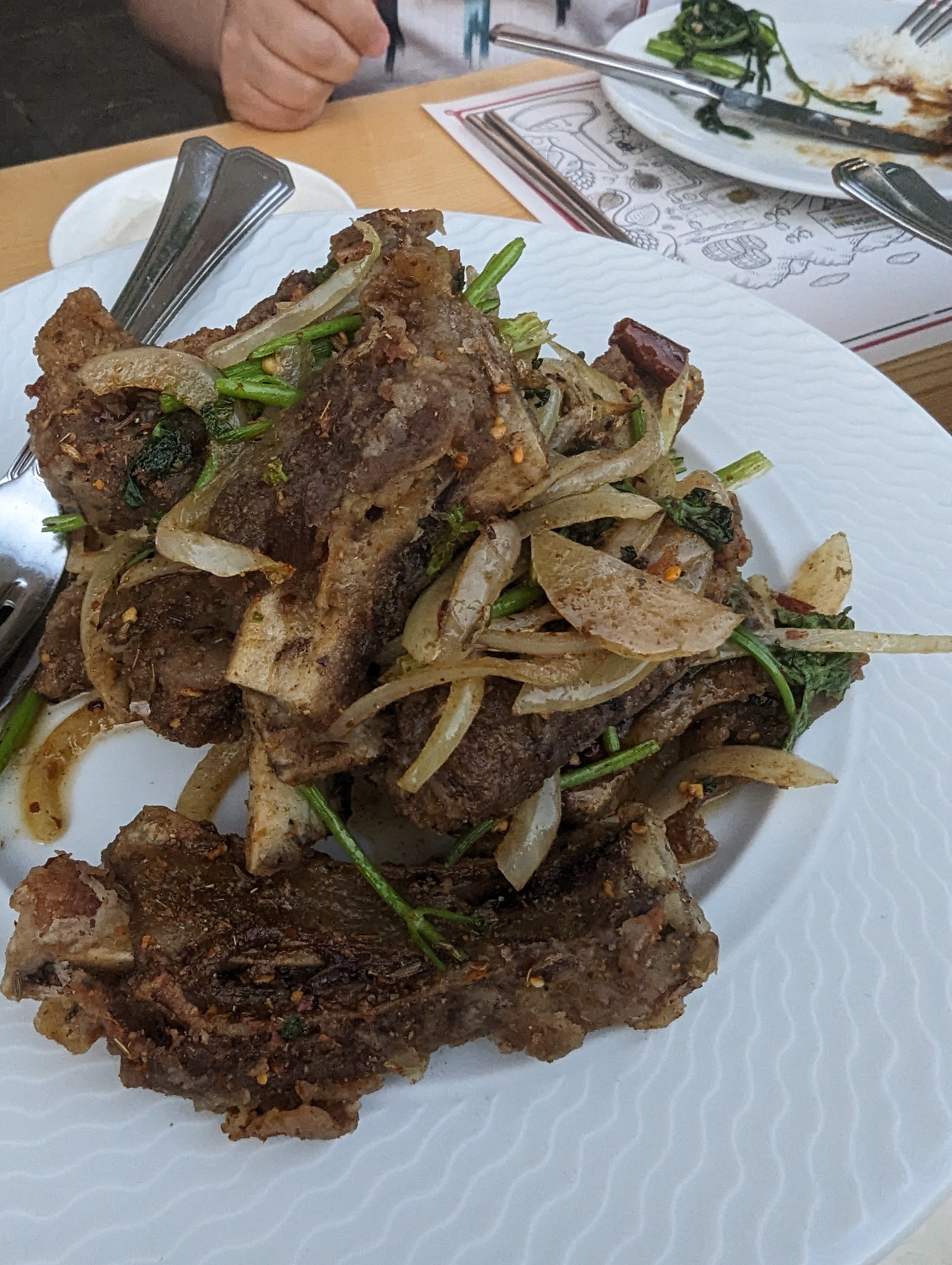Lundi soir, nous avons changé de style et fait un excellent repas thaïlandais chez Dusit. Nous avons d’abord partagé une salade de boeuf « Tigre qui pleure » et un « loving couple », à savoir des crevettes et coquilles saint-Jacques grillées avec une sauce à réveiller un mort, puis un Kua Kling (poulet au curry sec bien pimenté) et un « canard Bangkok » (noix de cajou et sauce soja) accompagnés d’un riz parfumé au lait de coco (désolée pour les photos bleuâtres, la lumière du restaurant a provoqué cet effet…).