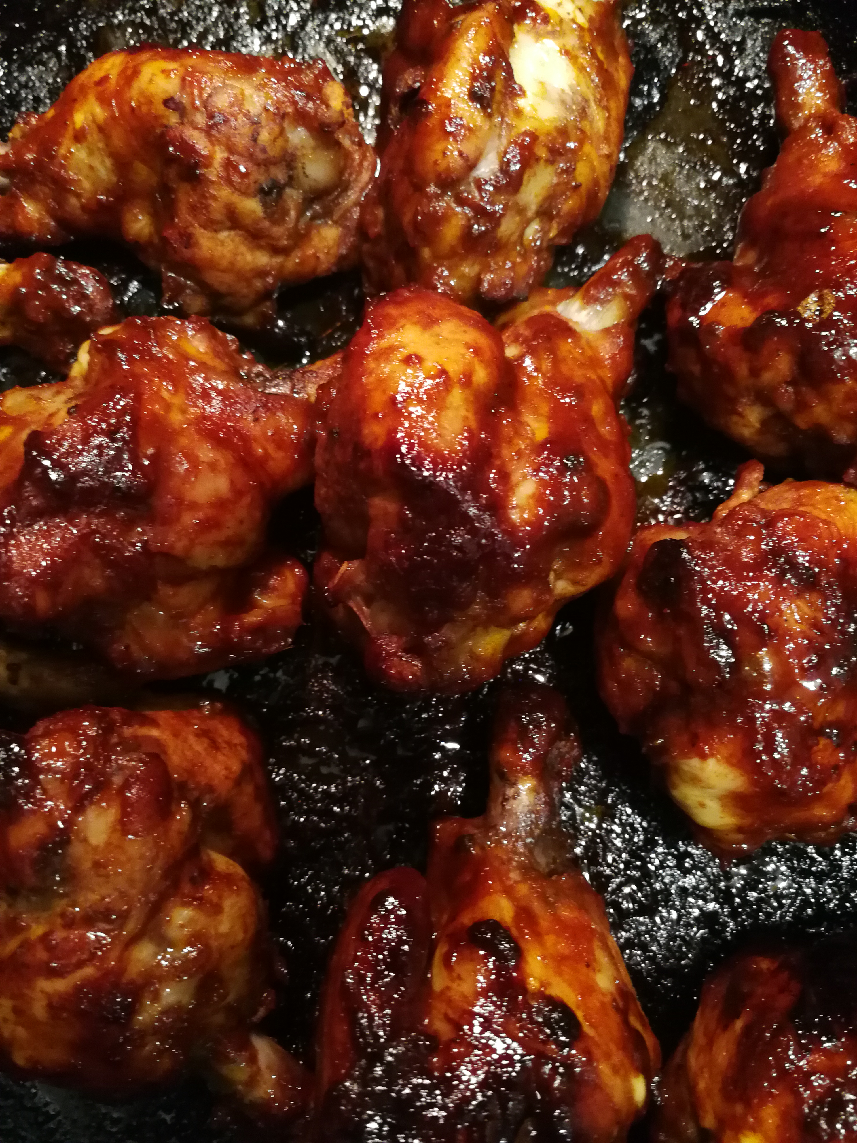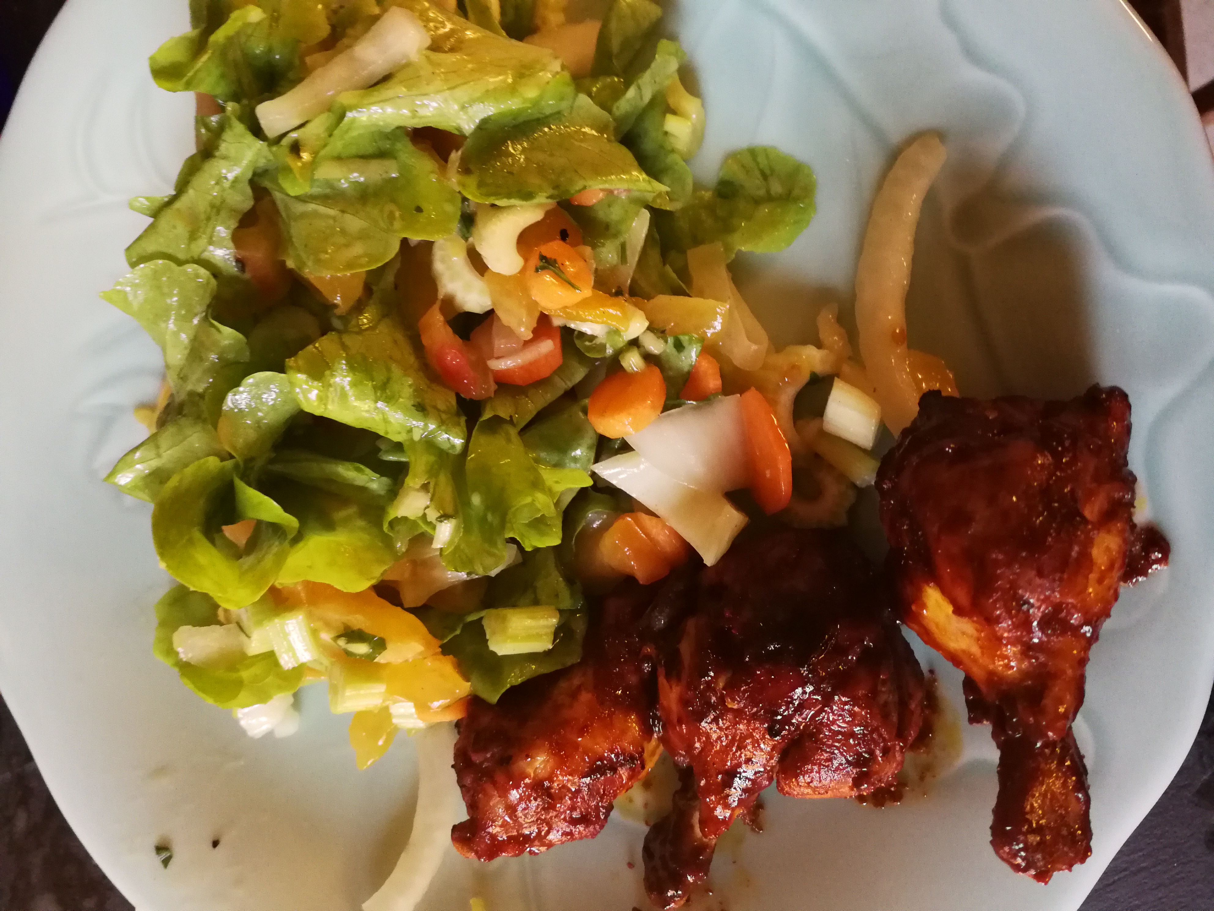 Mardi soir, j’ai fait des mini-pilons de poulet tandoori, avec du tzatziki aux poivrons (même recette que le tzatziki classique, mais avec du poivron grillé haché en lieu et place du concombre) et une salade verte.