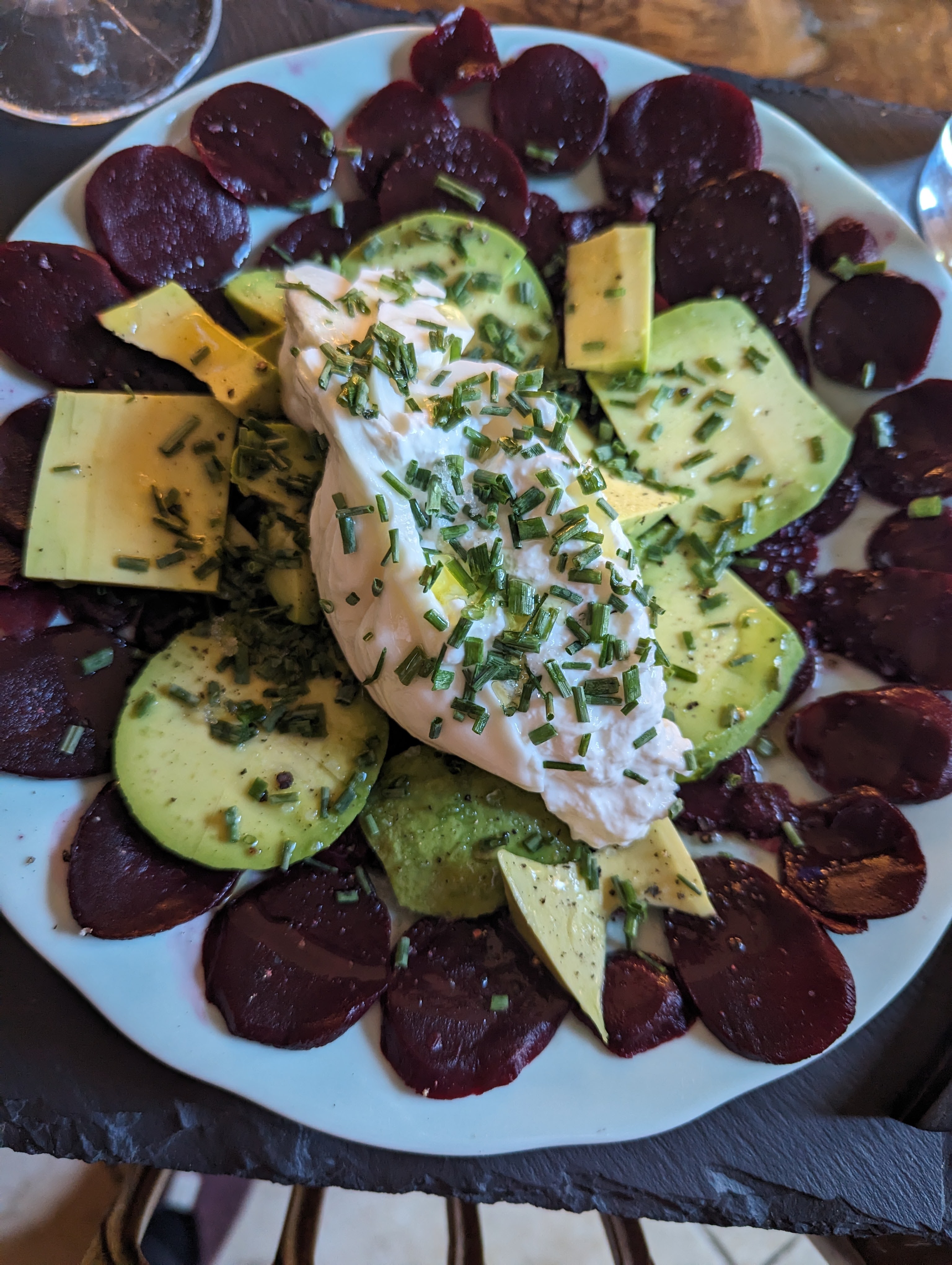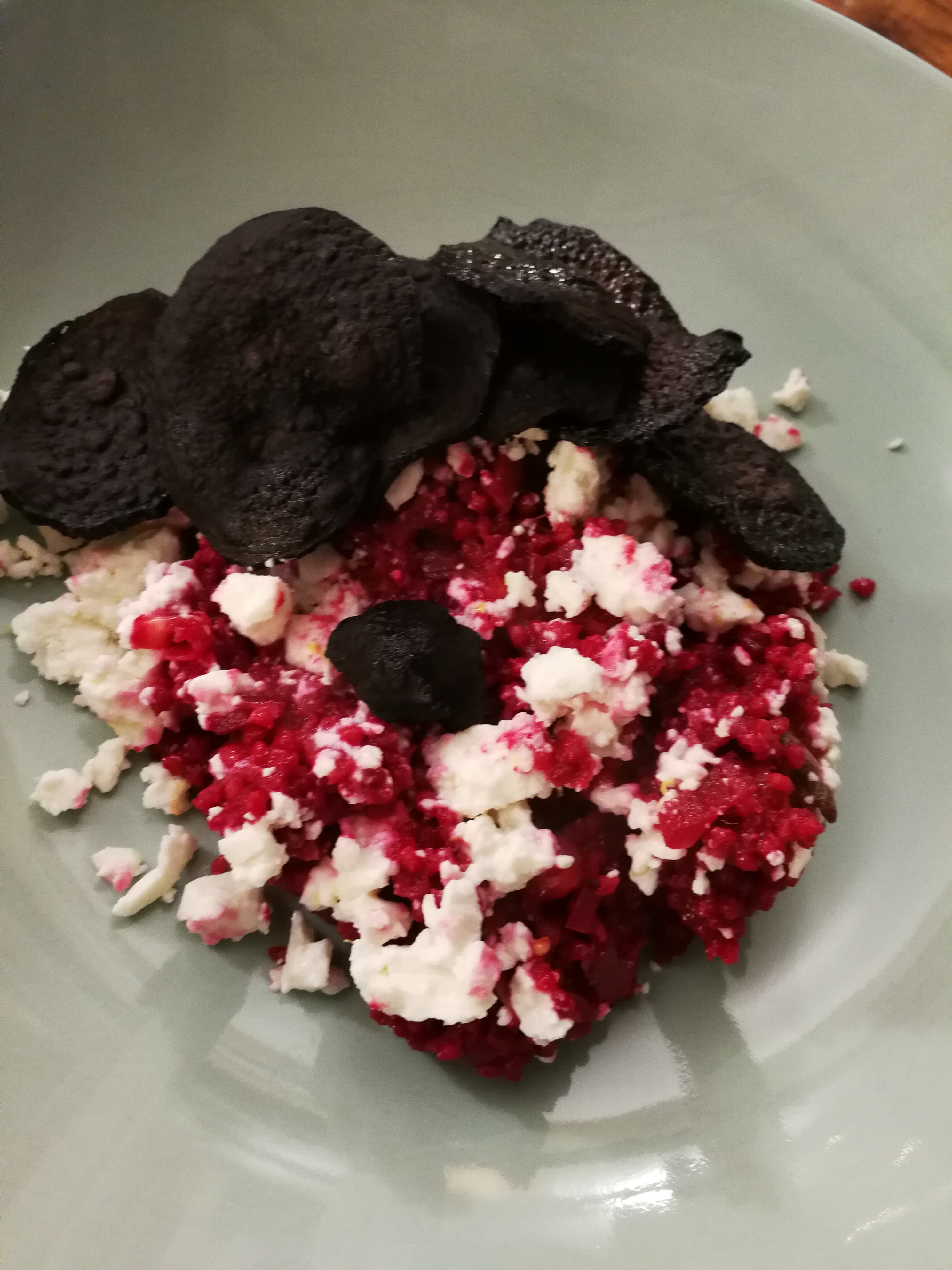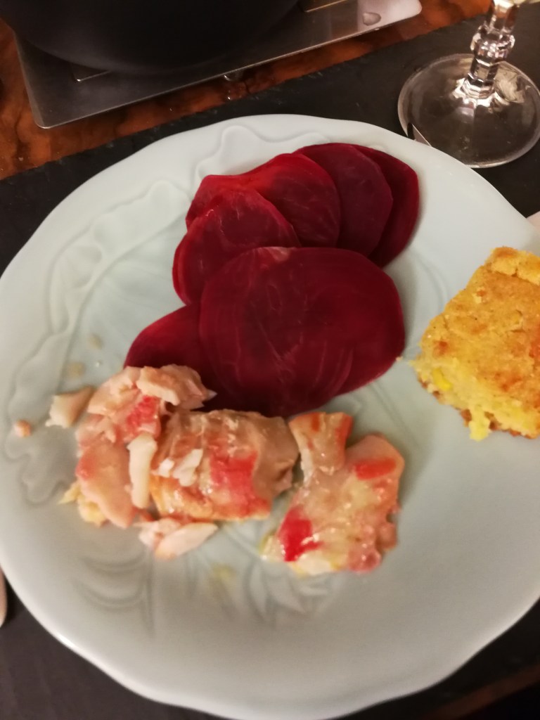 Jeudi soir, nous étions six à table. En entrée, j’ai servi des verrines de betterave et de chèvre frais (inspirées de cette recette). J’ai fait un plat principal coréen : du porc épicé au kimchi (Jaeyook kimchi bokum), servi avec du kimchi de chou et du kimchi de feuilles de moutarde (tous deux faits maison) et du riz. Nos invités ont apporté le dessert. Pas de photos : comme d’habitude, quand j’ai des invités, je m’occupe de les nourrir et j’oublie complètement de prendre les photos !