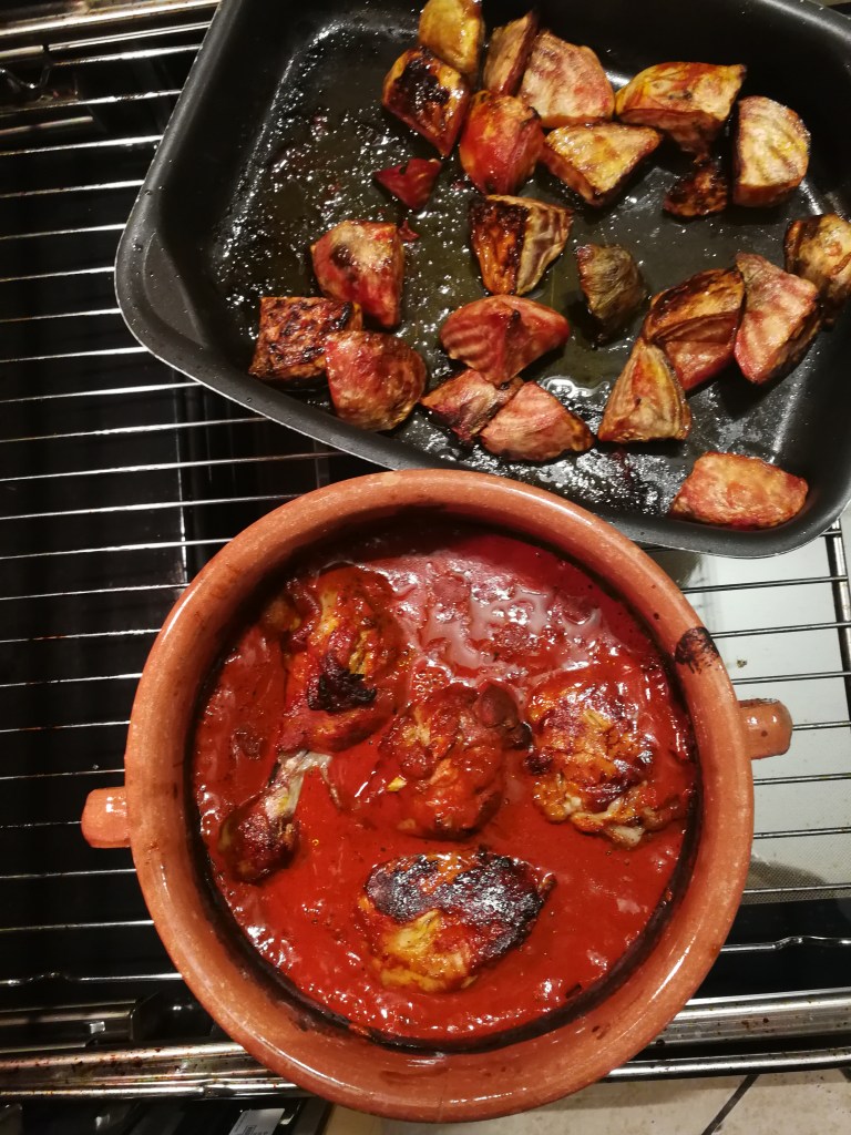 Dimanche soir, j’ai fait une recette qui semble être un classique de la cuisine italo-américaine, du poulet scarpariello. C’est vraiment délicieux, je ne peux que recommander la recette (que j’ai faite en grande quantité, histoire d’avoir des restes pour midi). Comme d’habitude, je n’ai pas mis le sucre… Je l’ai servi avec des haricots borlotti à la sauge.