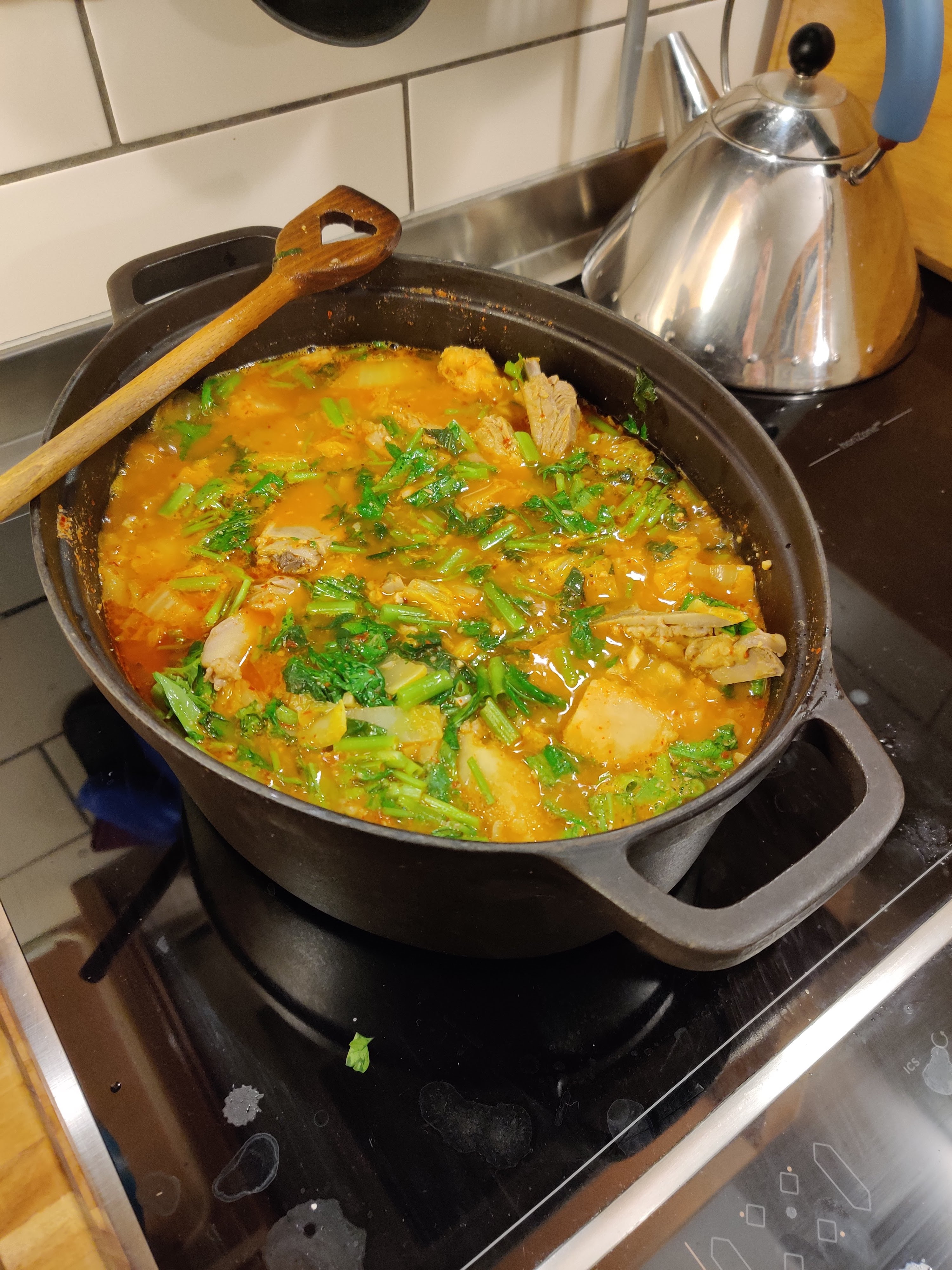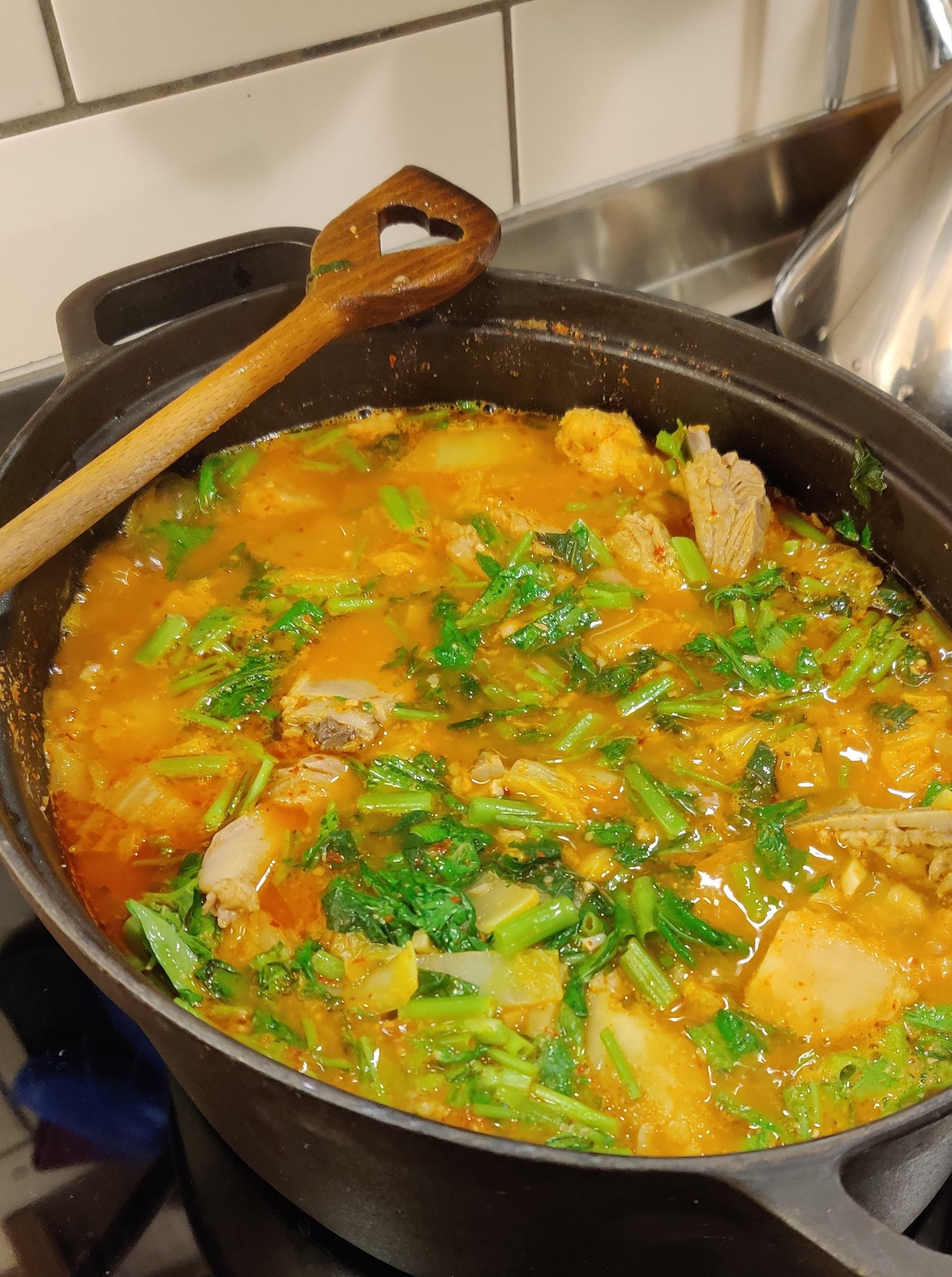 Vendredi soir, nous avions des invités. J’ai préparé un repas coréen : en apéro, un cocktail makgeolli-soju. En entrée, des crêpes à la ciboule chinoise. En plat principal, des short ribs de boeuf (excellente recette, je recommande tout particulièrement). J’ai accompagné le plat principal de riz, d’épinards à la coréenne (pour lesquels j’utilise des épinards surgelés), de pickles de carottes et radis blanc, de kimchi de chou et de kimchi de feuilles de moutarde. En dessert, j’ai servi un panettone aux marrons glacés (acheté, je ne suis pas une grande pâtissière). Et pour une fois, je n’ai pas oublié les photos !