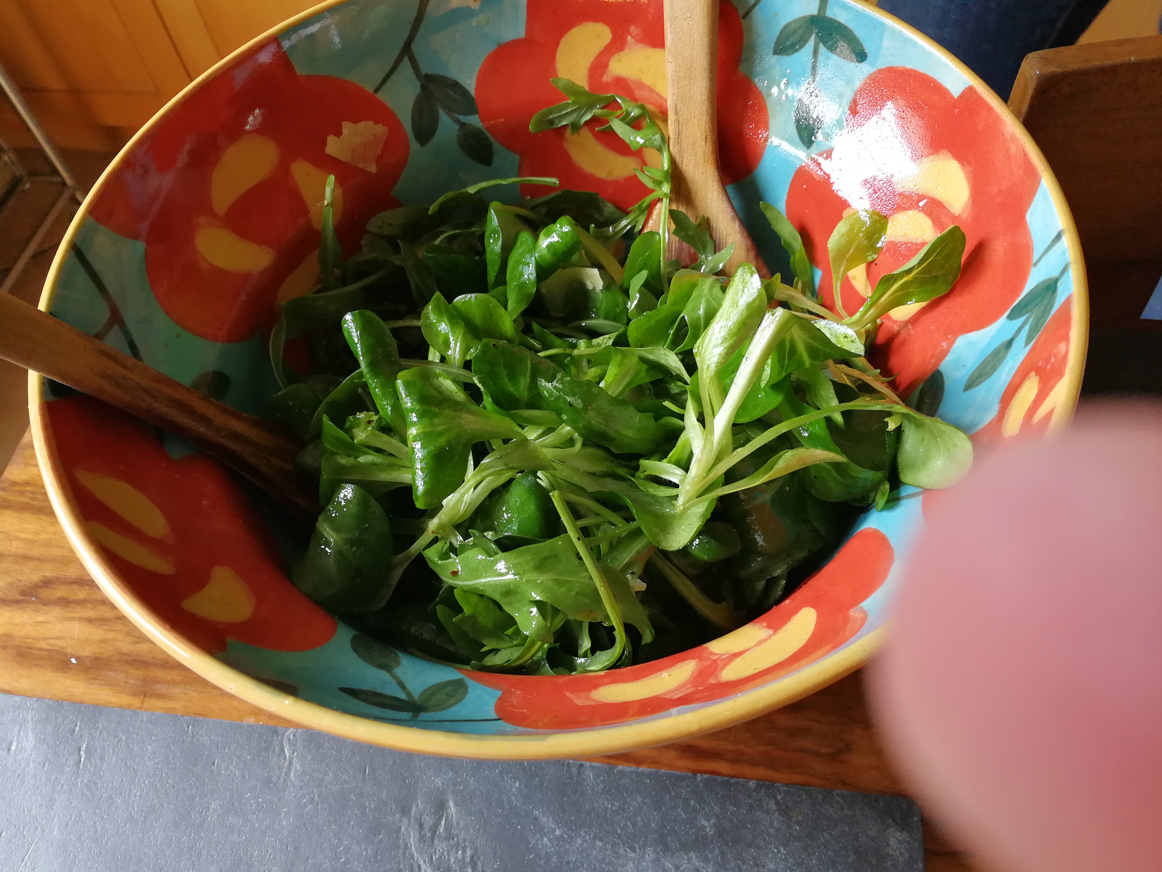 Lundi soir, j’ai préparé une salade de poulet au maïs, à l’avocat et au miso (dans laquelle j’ai ajouté des feuilles de sucrine) très goûteuse. J’étais super-pressée, donc je n’ai pas cuit le poulet comme indiqué. J’ai cuit mes deux blancs de poulet à l’eau additionnée de gingembre et de jus de citron, et c’était impeccable.