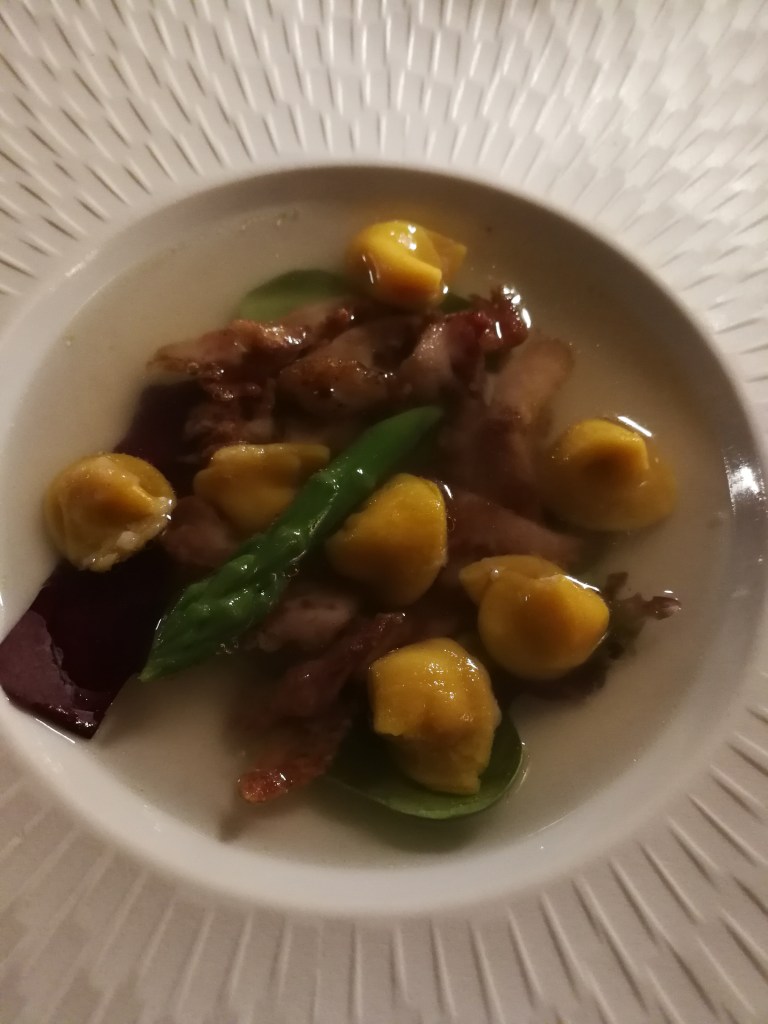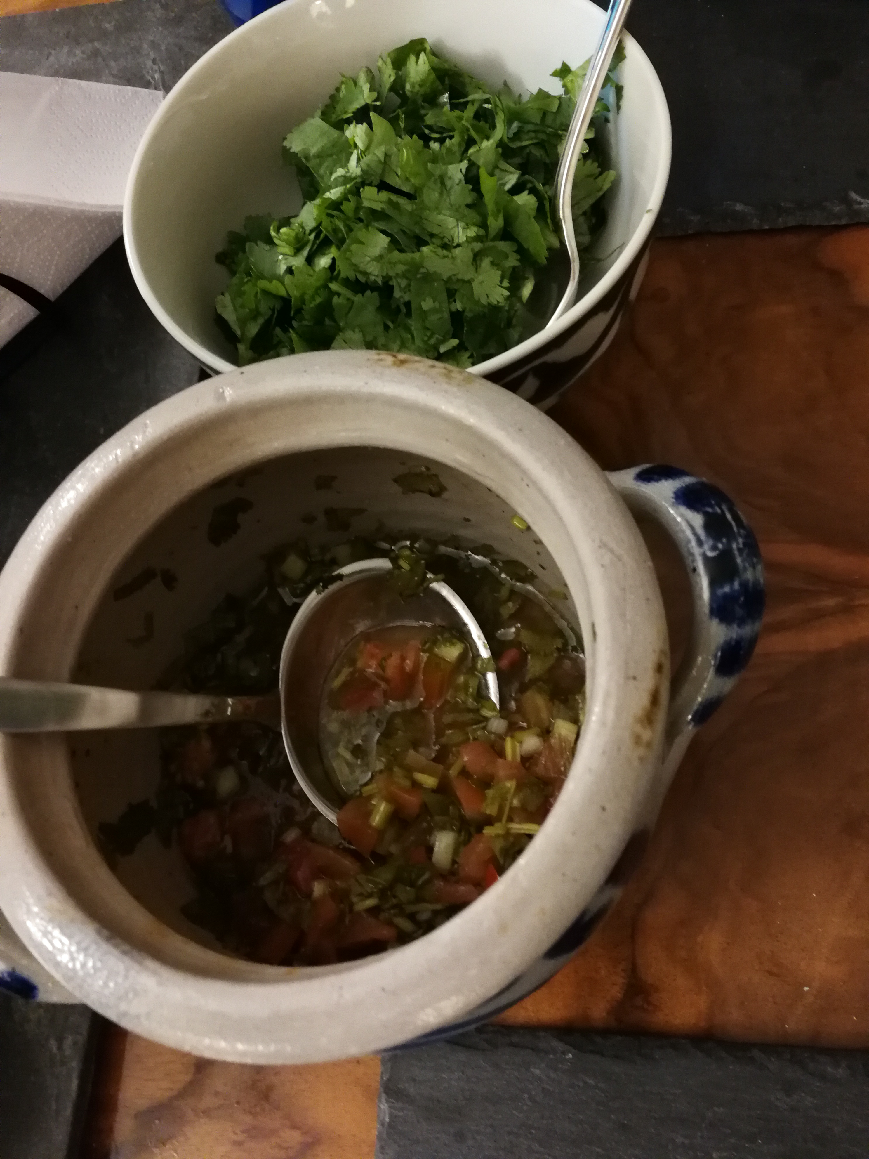 - Entrées : empanadas avec sauce LLajua (viande de boeuf, poivrons, oignons et olives vertes, et Humita, c’est à dire maïs râpé, oignons nouveaux et tomme), et ceviche de dorade, leche de tigre, oignons rouges, patates douces, chili, coriandre.