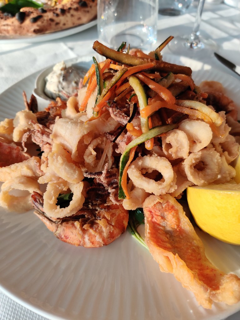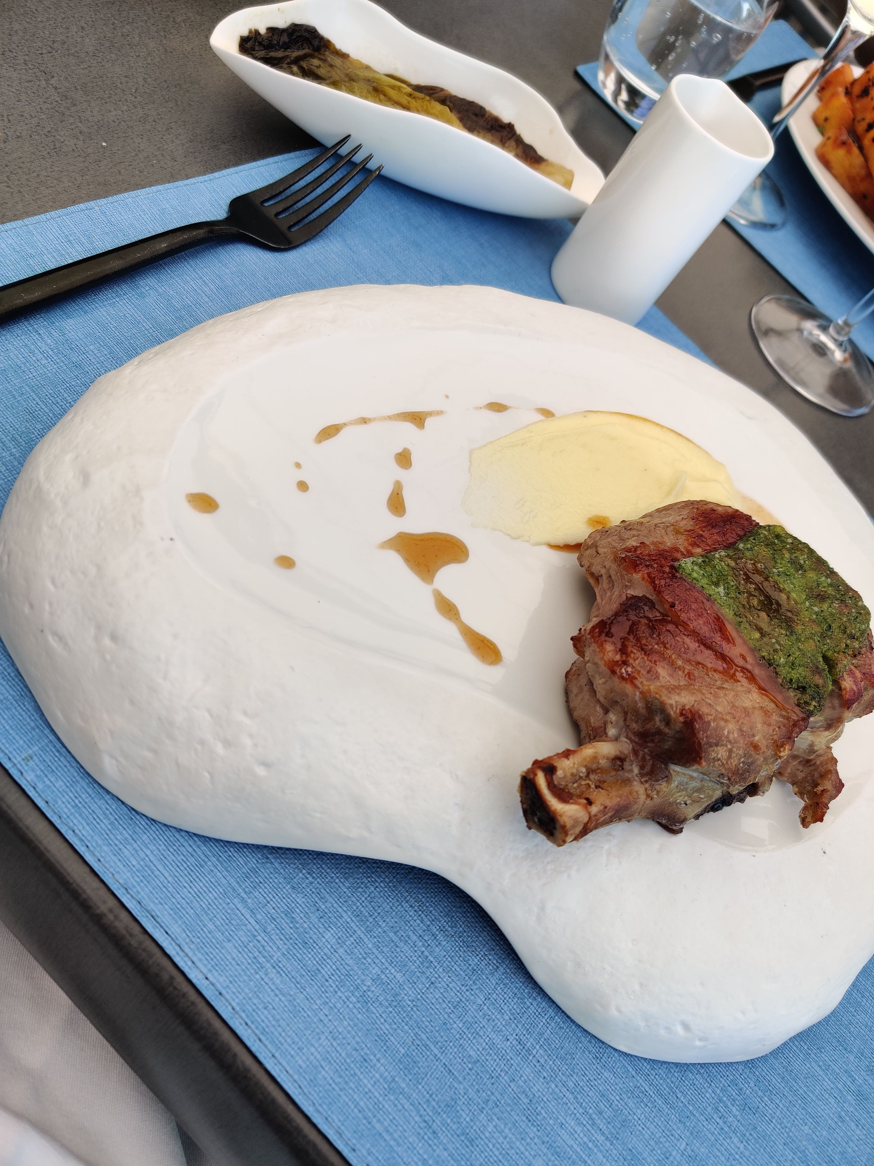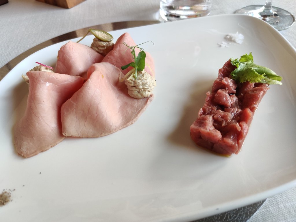 En entrée, nous nous sommes partagé une terrine de gibier et foie gras et un duo de foie gras. Ensuite, j’ai pris une poêlée de saint-jacques et gambas avec risotto aux poireaux.