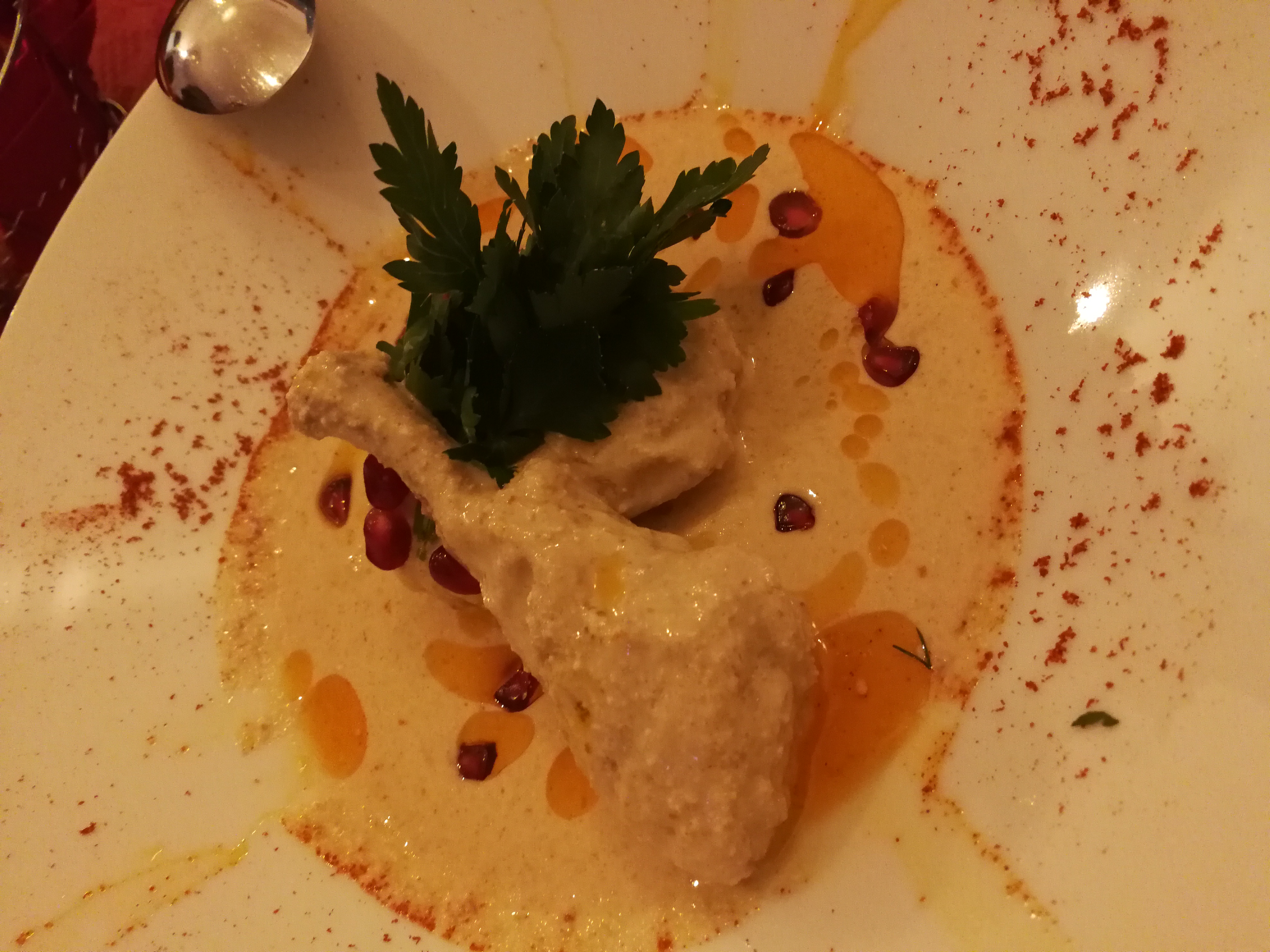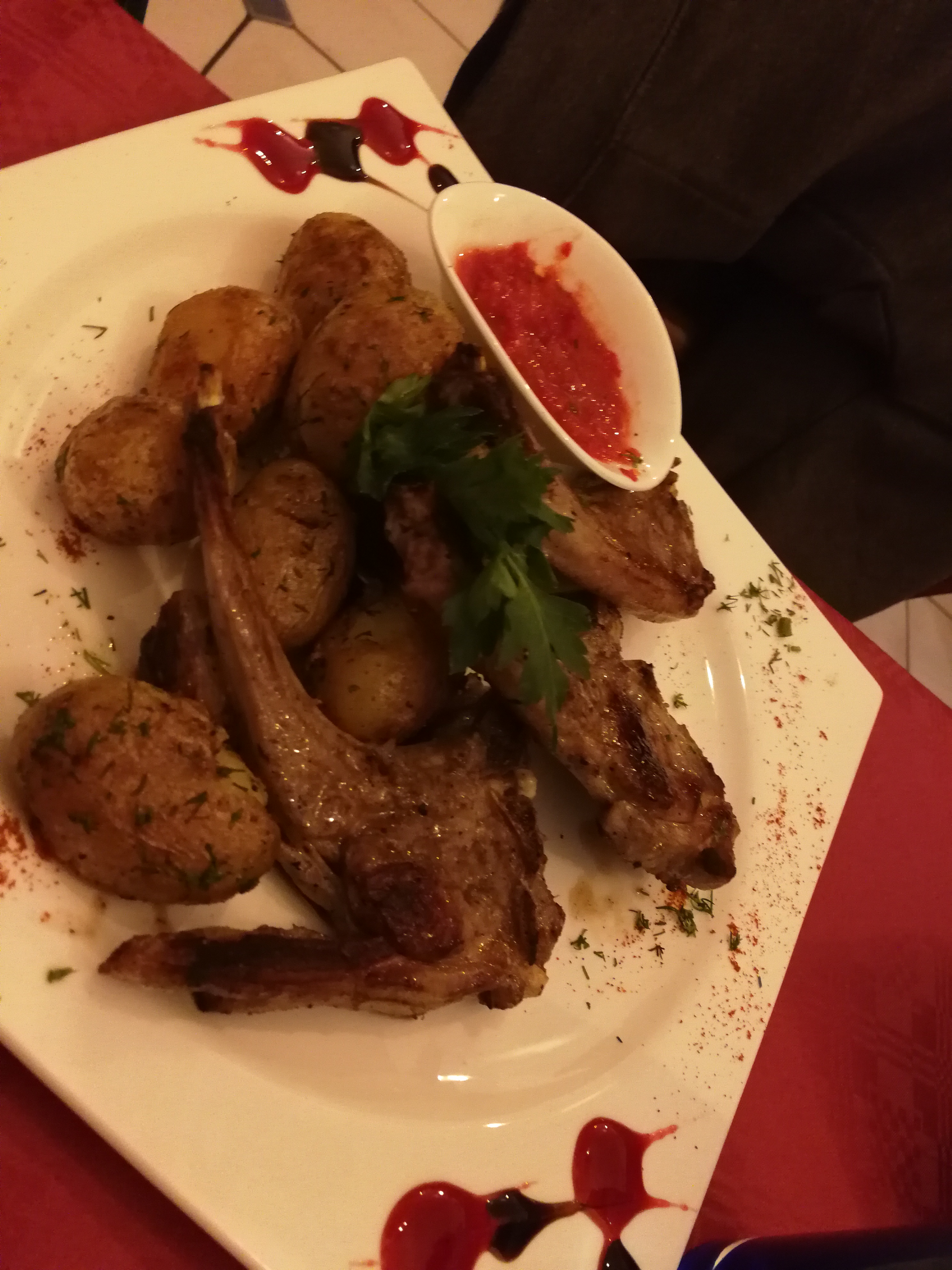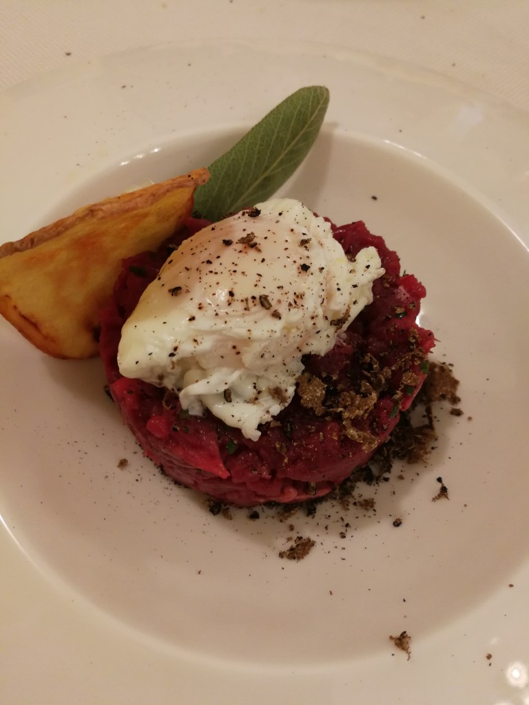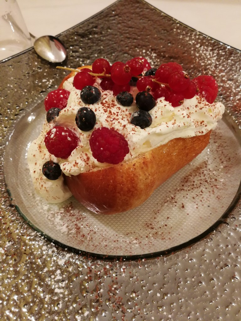 Nous avons d’abord eu un amuse bouche surprenant et délicieux, à base de chou-fleur et de… chocolat blanc ! Ensuite, du foie gras escorté de betteraves confites, suivi par une grosse crevette carabinero à la courge. En plat principal, du filet de bœuf, très tendre et goûteux, accompagné de légumes. Une jolie assiette de fromages pour suivre, et pour conclure, un dessert léger et savoureux à la pomme.