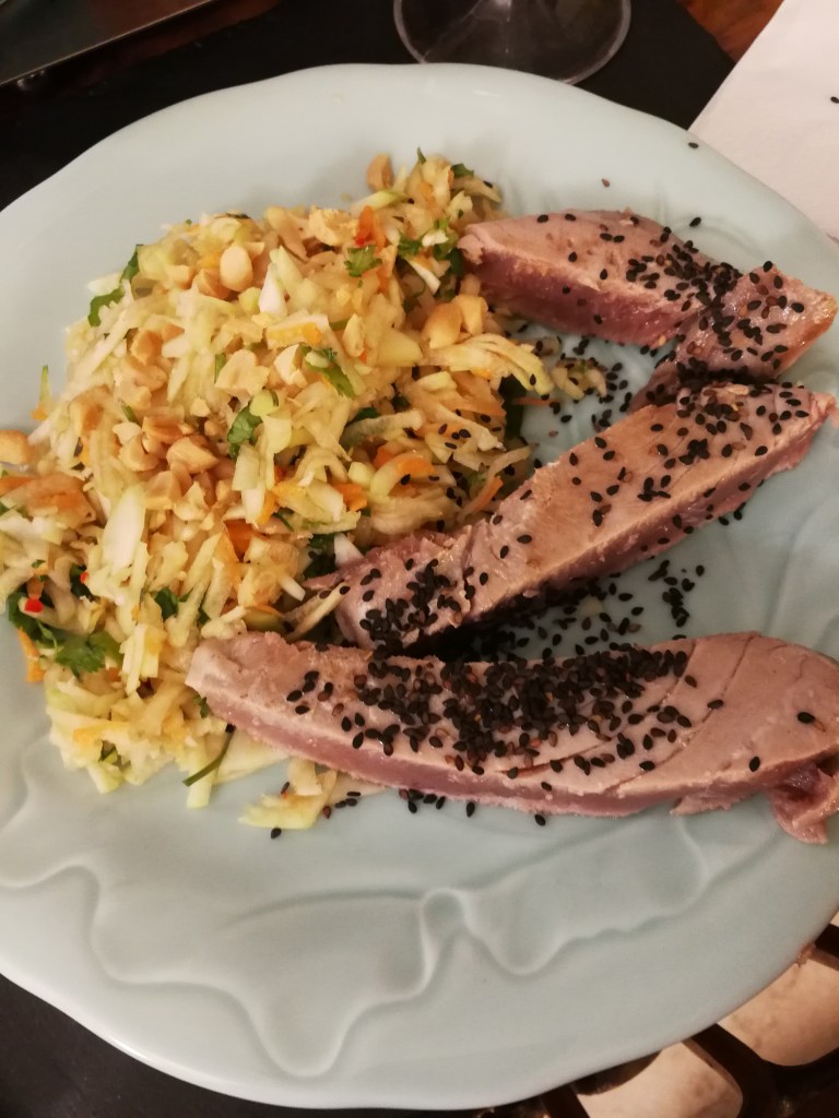 Jeudi soir, j’ai préparé du canard fumé à la cannelle (encore une recette non dispo online) : un magret de canard grillé, fumé/cuit à la cannelle et au riz, arrosé de sauce soja et huile de sésame et servi avec des petits choux pak choi. Très agréable, sans être immortel.