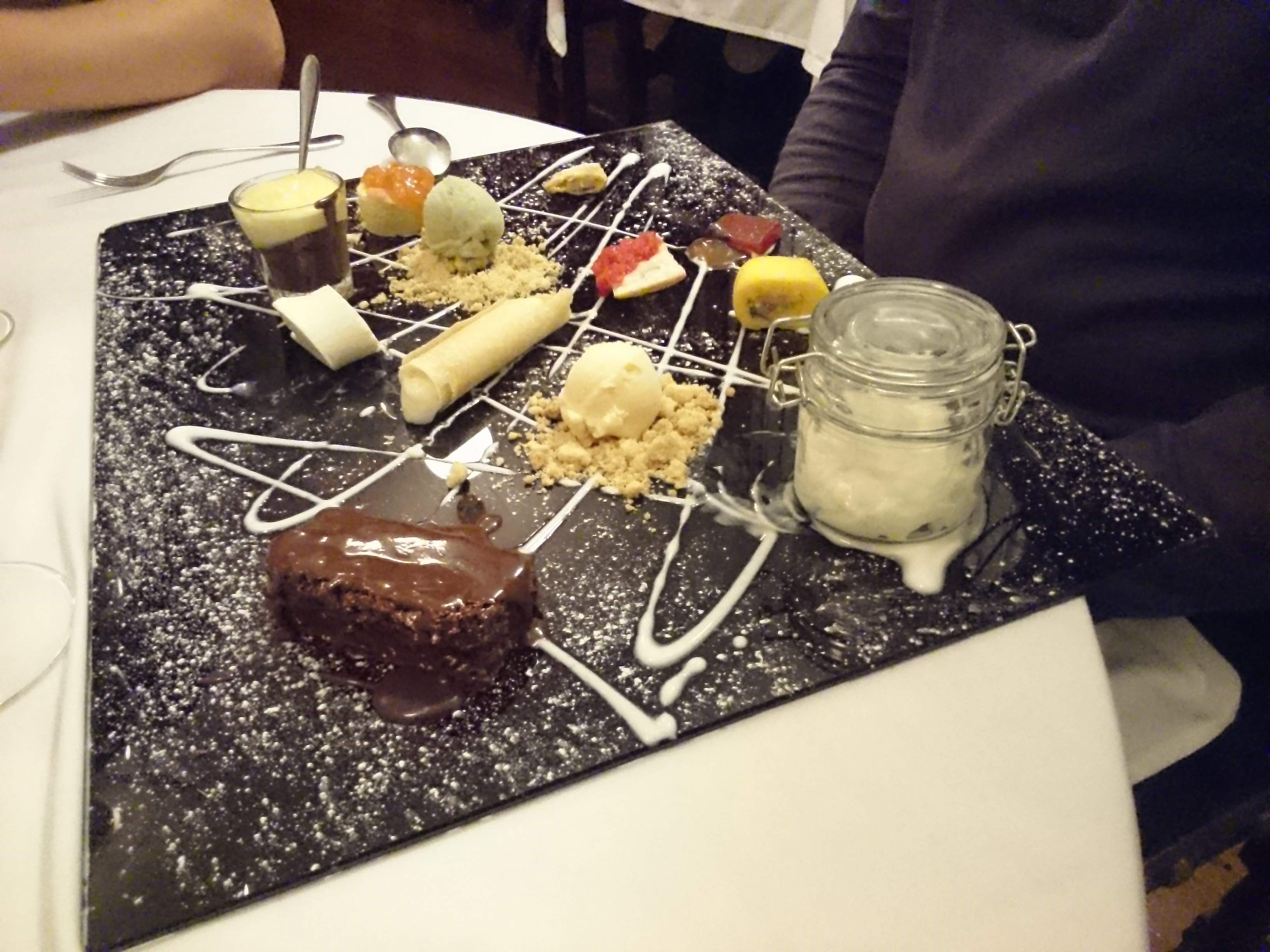 Clube de Jornalistas : Il s’agit là d’un restaurant gastronomique aux prix relativement élevés pour la capitale portugaise (mais très raisonnables pour nous petits Suisses). Le cadre est très classique lisboète, avec des meubles sombres et des superbes azulejos aux parois. La cuisine est, elle, légère et délicieuse, revisitant les ingrédients classiques de la cuisine portugaise de manière très inventive. J’y ai mangé une entrée de ceviche de maquereau, maïs soufflé épicé, vinaigrette à la mangue et aux œufs, puis un plat de cou de porc noir cuit lentement au four, haricots rouges et algues, et enfin un dessert de papaye mûre et verte, glace au fromage frais. Et pour vous allécher, voici leur dessert « choses douces » (ou, si vous préférez, « un petit peu de tout »)