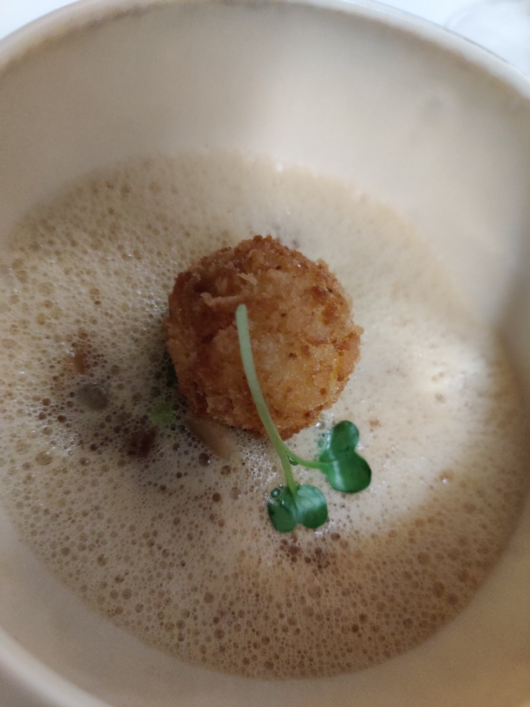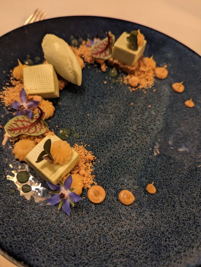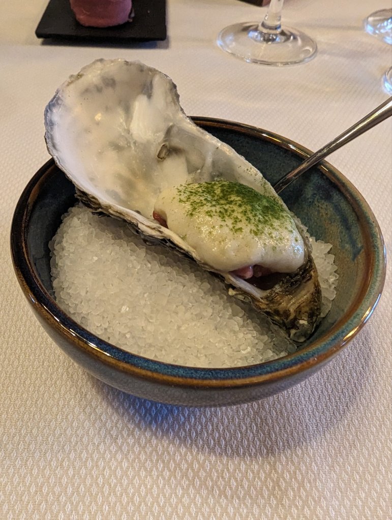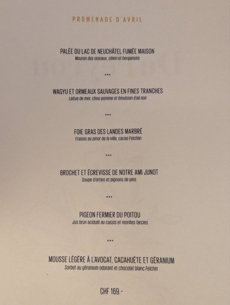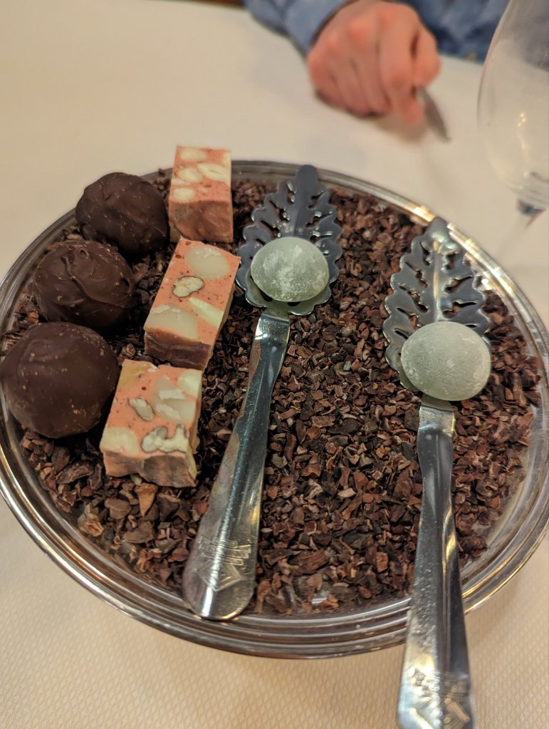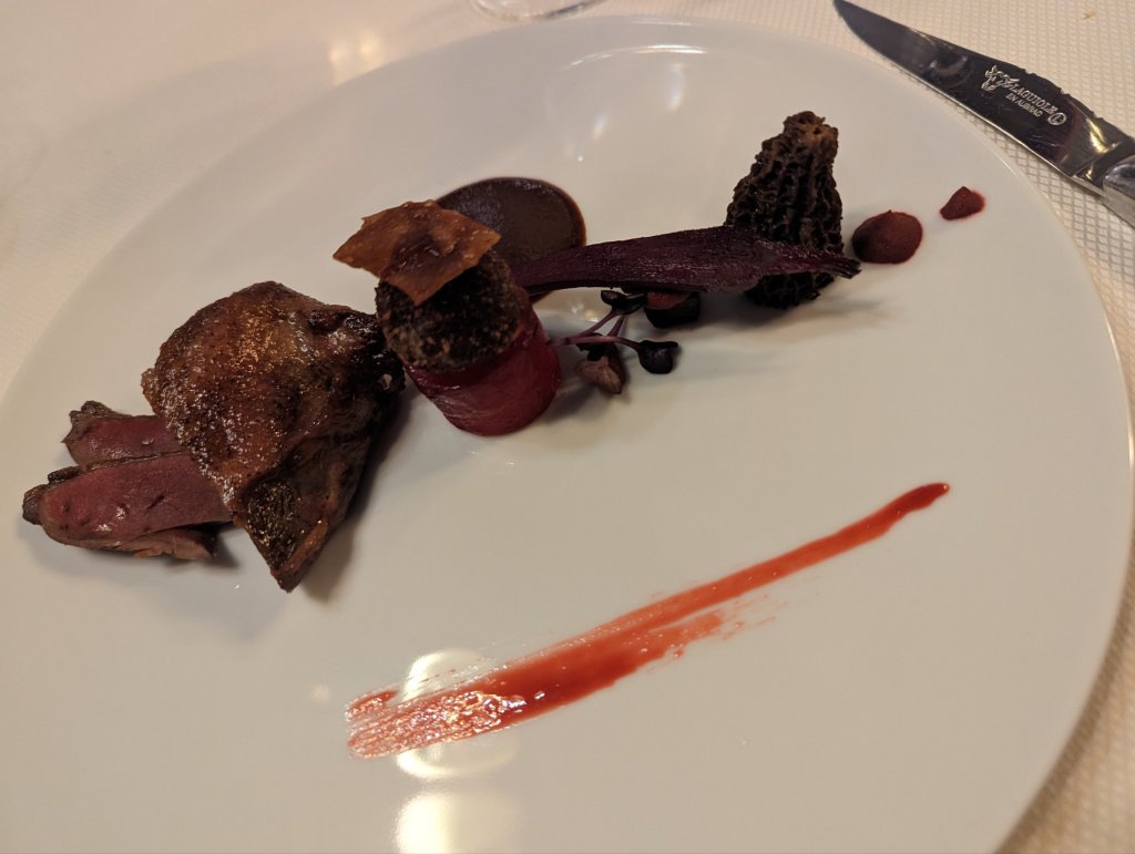 Samedi soir, nous avions un bon Qoqa pour la Brasserie Notre-Dame à Payerne. Nous avons fait un excellent repas. Nous avons d’abord pris l’apéritif avec le cocktail du chef (qui est un barman littéralement de compétition, il a gagné un concours avec ce cocktail). Ensuite nous avons eu un menu complet : en entrée un oeuf parfait aux herbes et à la truffe blanche fondant et parfumé, puis un médaillon de veau accompagné d’un mille-feuille de légumes et d’un étonnant panier d’amandes farci à la mousseline de topinambours, croustillant à l’extérieur et mousseux à l’intérieur. Ensuite nous avons dégusté une belle et goûteuse assiette de fromages. Pour finir, un pré-dessert surprenant et délicieux composé d’une boule de chocolat blanc farci à la mousse de betteraves, et ensuite le dessert, une savoureuse assiette très légère dont le nom énonce la composition : « Irish Stout en glace et gel : crème d’orange / meringue au romarin fumé crème / tuile de betterave / gel myrtille / marshmallow betterave ».