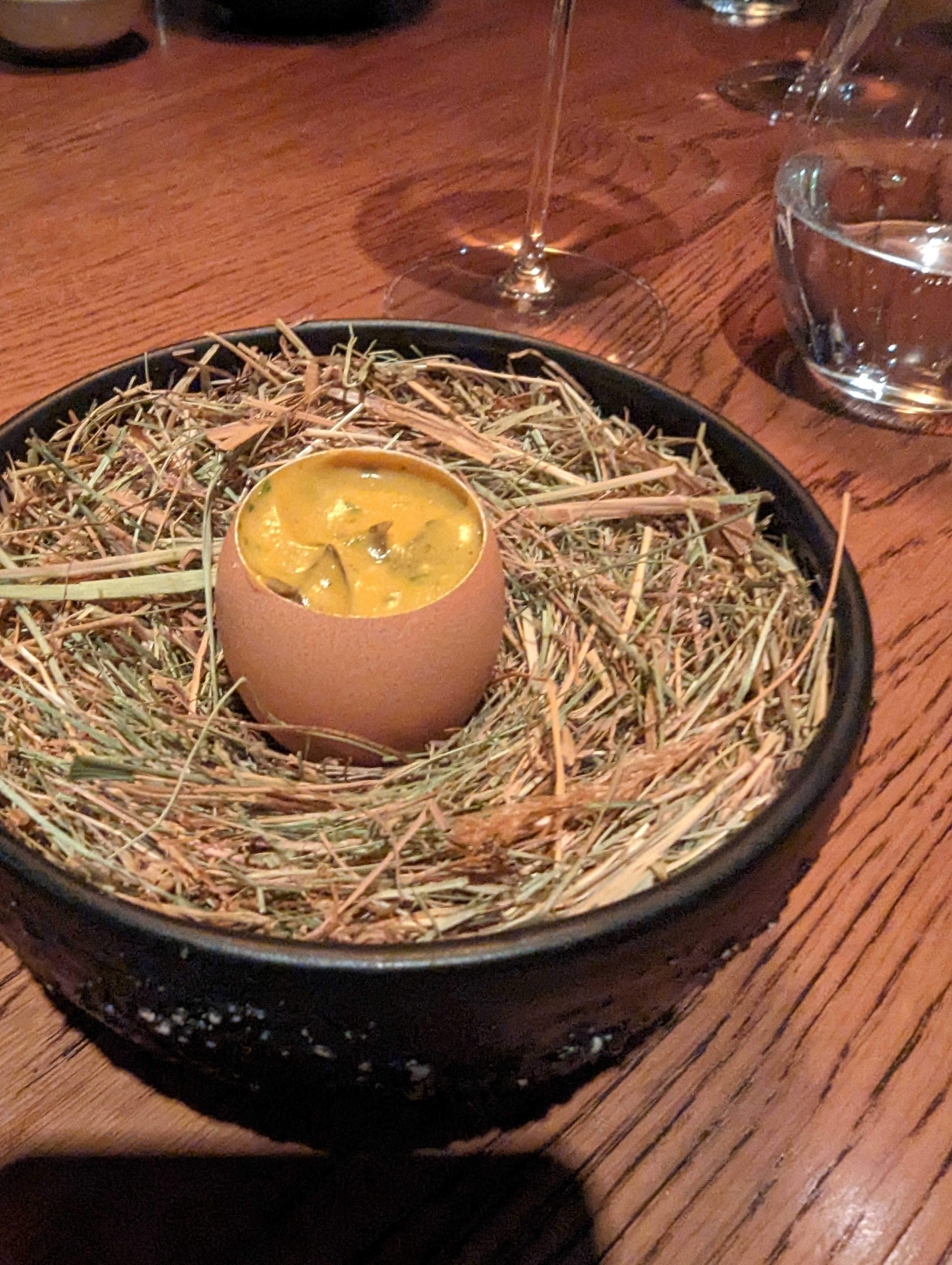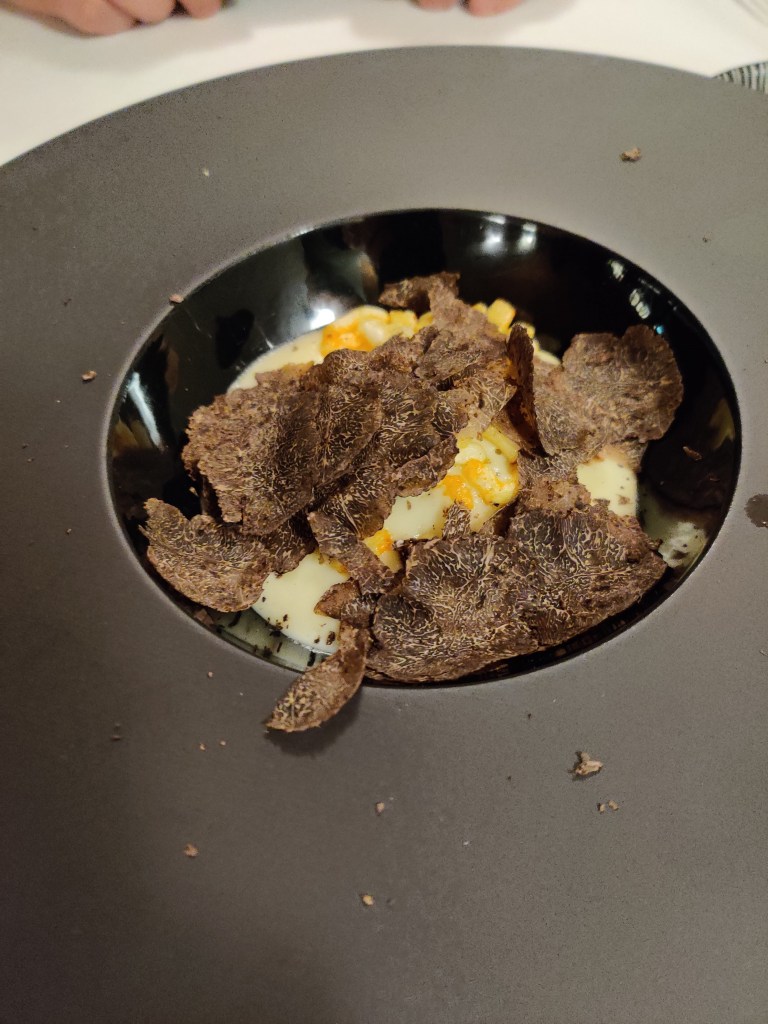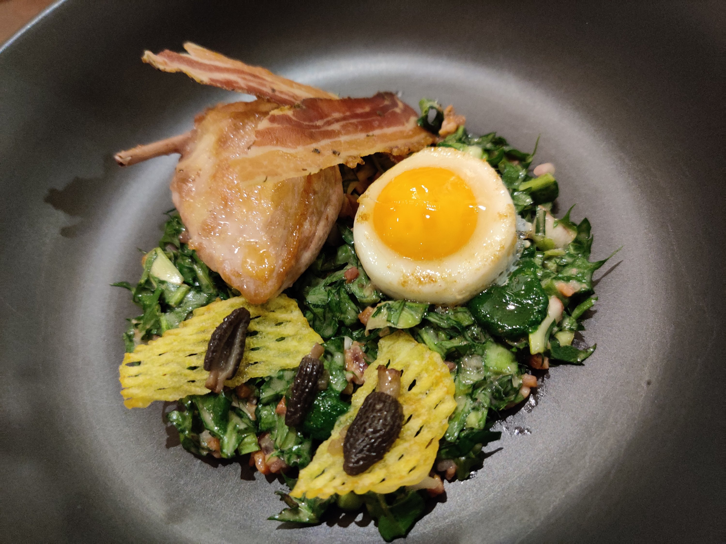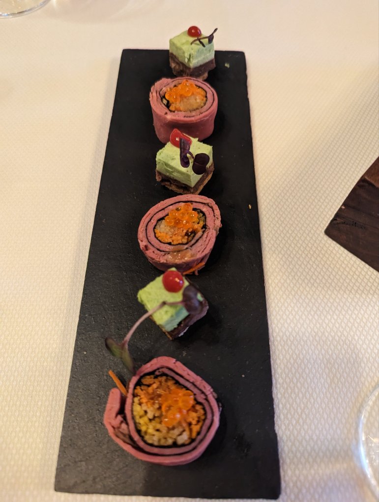 Samedi soir, nous avions un bon Qoqa pour la Brasserie Notre-Dame à Payerne. Nous avons fait un excellent repas. Nous avons d’abord pris l’apéritif avec le cocktail du chef (qui est un barman littéralement de compétition, il a gagné un concours avec ce cocktail). Ensuite nous avons eu un menu complet : en entrée un oeuf parfait aux herbes et à la truffe blanche fondant et parfumé, puis un médaillon de veau accompagné d’un mille-feuille de légumes et d’un étonnant panier d’amandes farci à la mousseline de topinambours, croustillant à l’extérieur et mousseux à l’intérieur. Ensuite nous avons dégusté une belle et goûteuse assiette de fromages. Pour finir, un pré-dessert surprenant et délicieux composé d’une boule de chocolat blanc farci à la mousse de betteraves, et ensuite le dessert, une savoureuse assiette très légère dont le nom énonce la composition : « Irish Stout en glace et gel : crème d’orange / meringue au romarin fumé crème / tuile de betterave / gel myrtille / marshmallow betterave ».