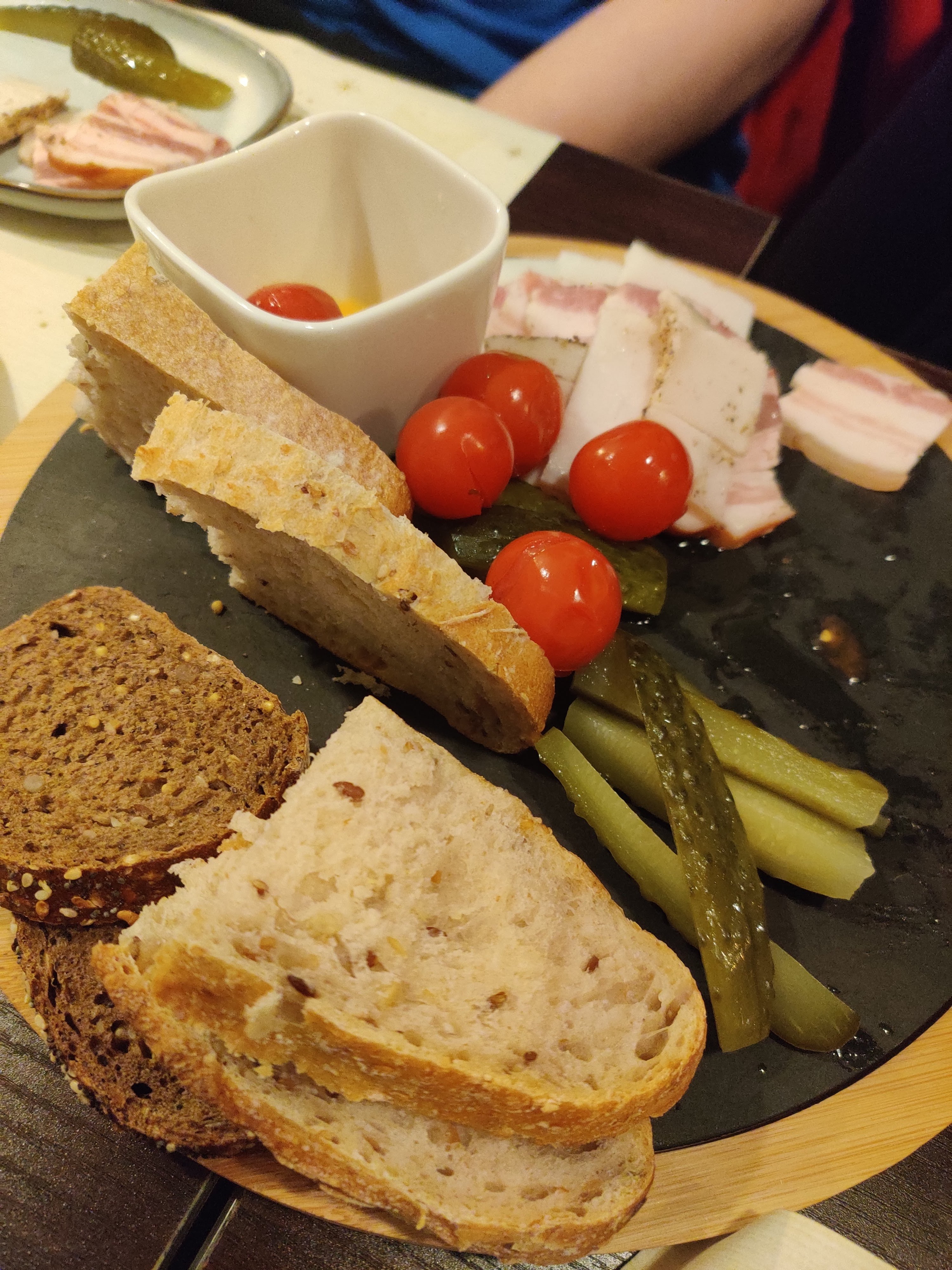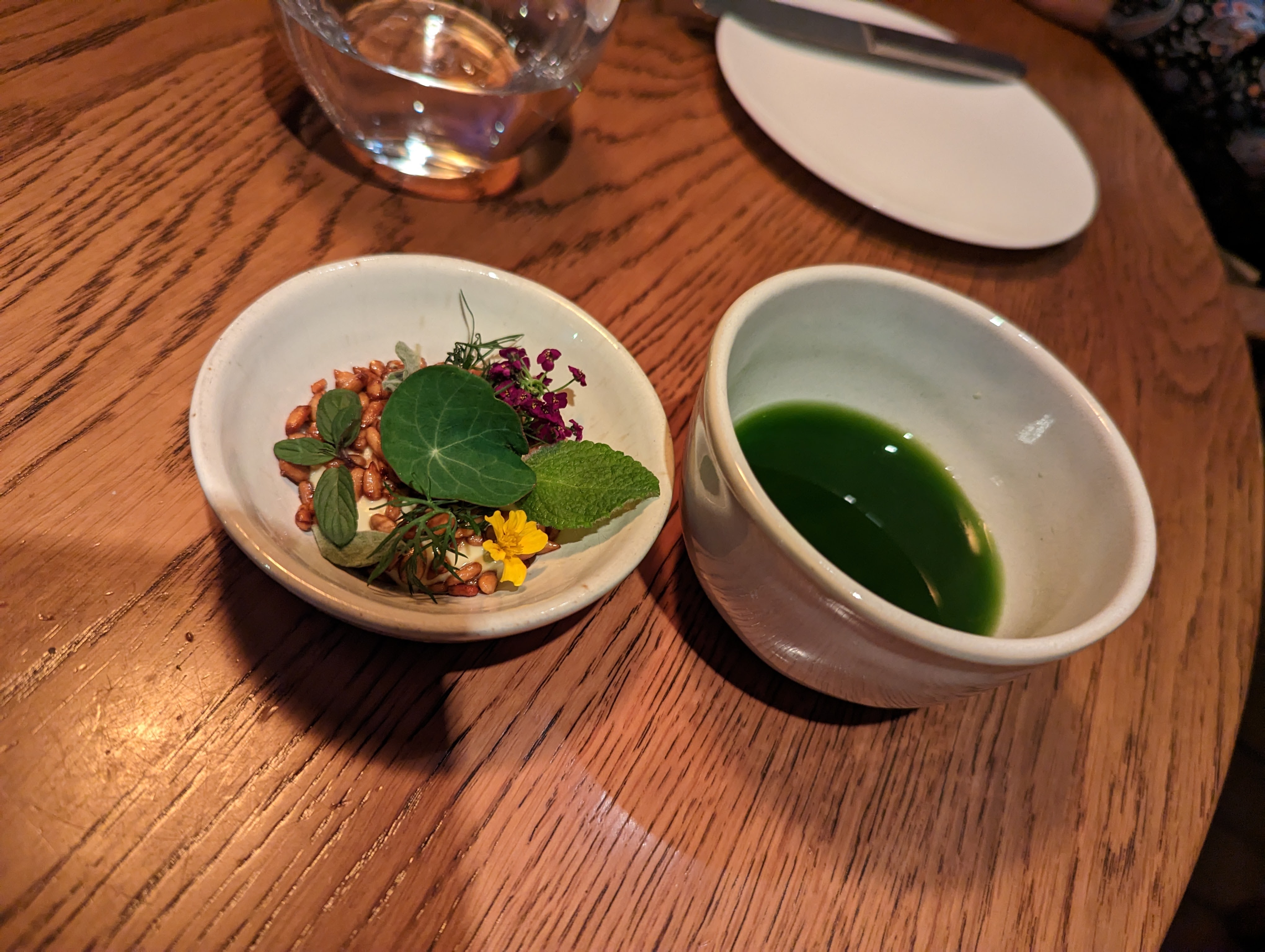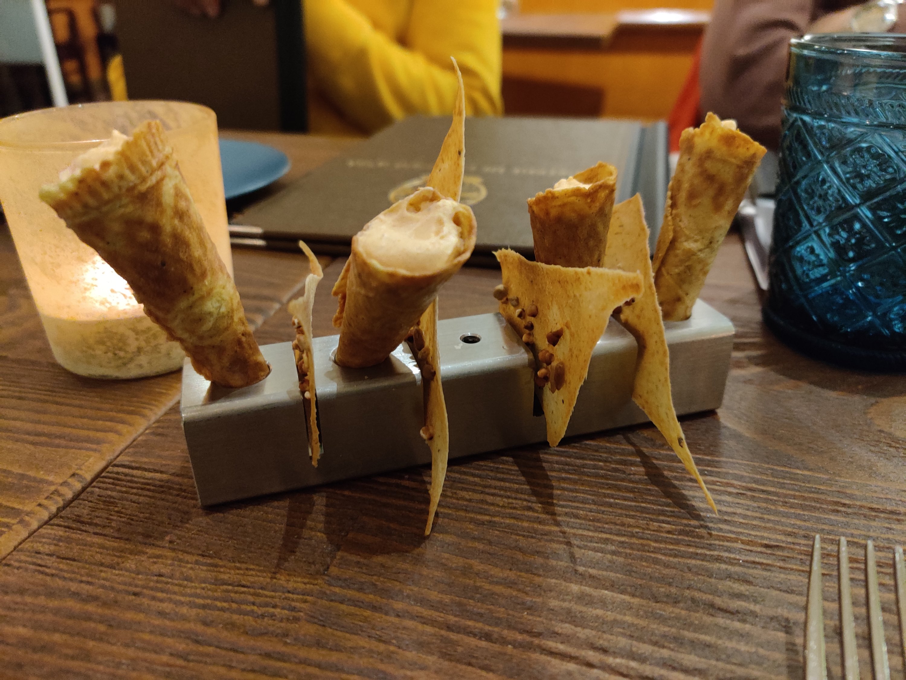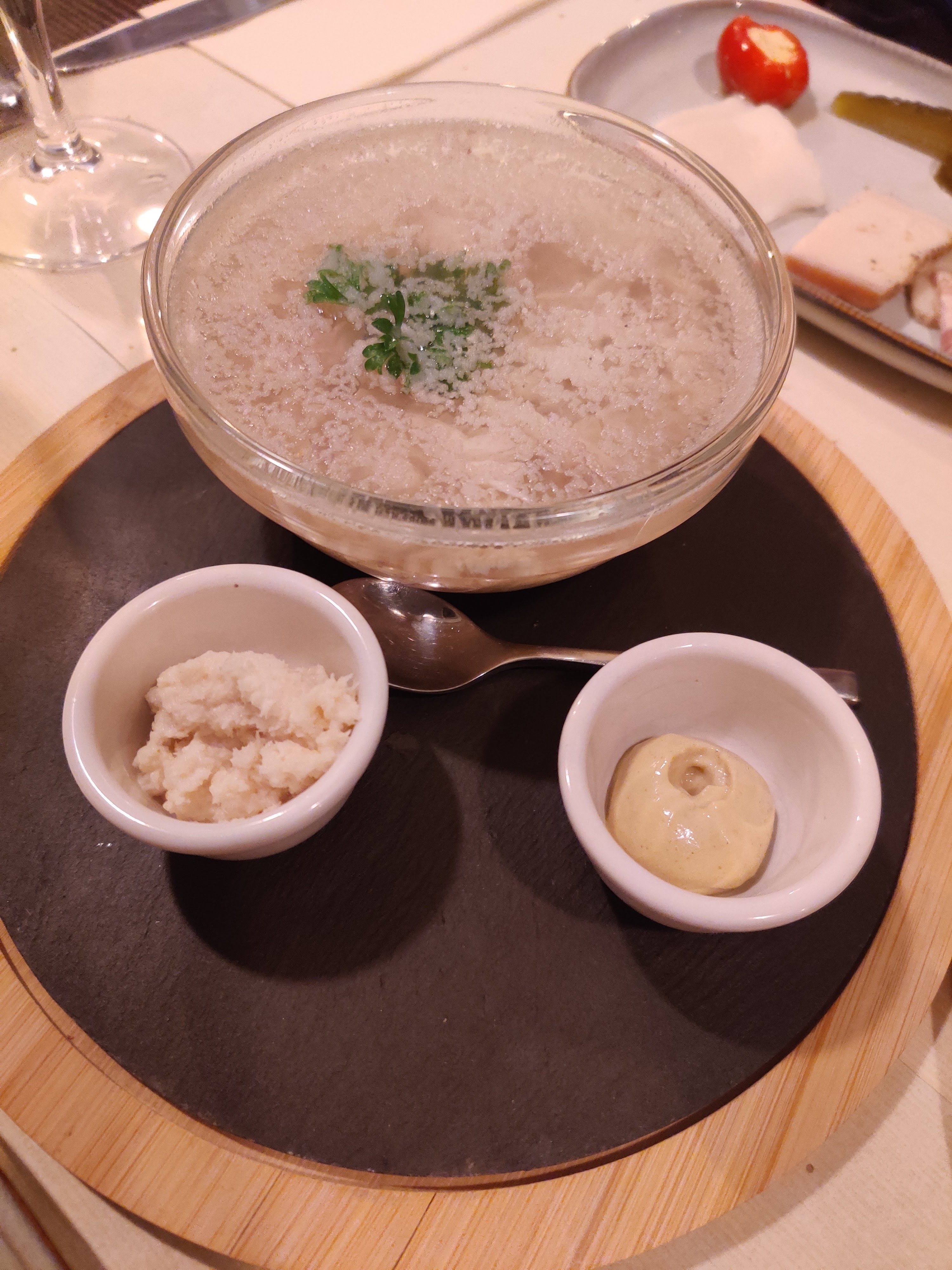 Samedi soir, nous avions un bon Qoqa pour la Brasserie Notre-Dame à Payerne. Nous avons fait un excellent repas. Nous avons d’abord pris l’apéritif avec le cocktail du chef (qui est un barman littéralement de compétition, il a gagné un concours avec ce cocktail). Ensuite nous avons eu un menu complet : en entrée un oeuf parfait aux herbes et à la truffe blanche fondant et parfumé, puis un médaillon de veau accompagné d’un mille-feuille de légumes et d’un étonnant panier d’amandes farci à la mousseline de topinambours, croustillant à l’extérieur et mousseux à l’intérieur. Ensuite nous avons dégusté une belle et goûteuse assiette de fromages. Pour finir, un pré-dessert surprenant et délicieux composé d’une boule de chocolat blanc farci à la mousse de betteraves, et ensuite le dessert, une savoureuse assiette très légère dont le nom énonce la composition : « Irish Stout en glace et gel : crème d’orange / meringue au romarin fumé crème / tuile de betterave / gel myrtille / marshmallow betterave ».