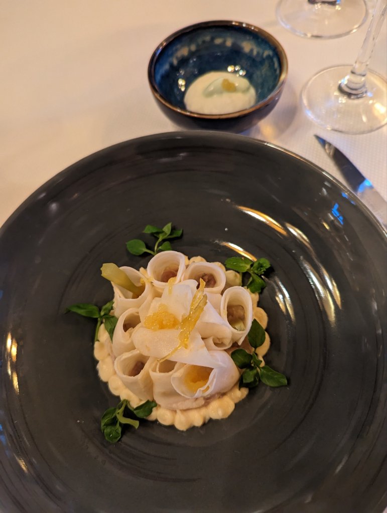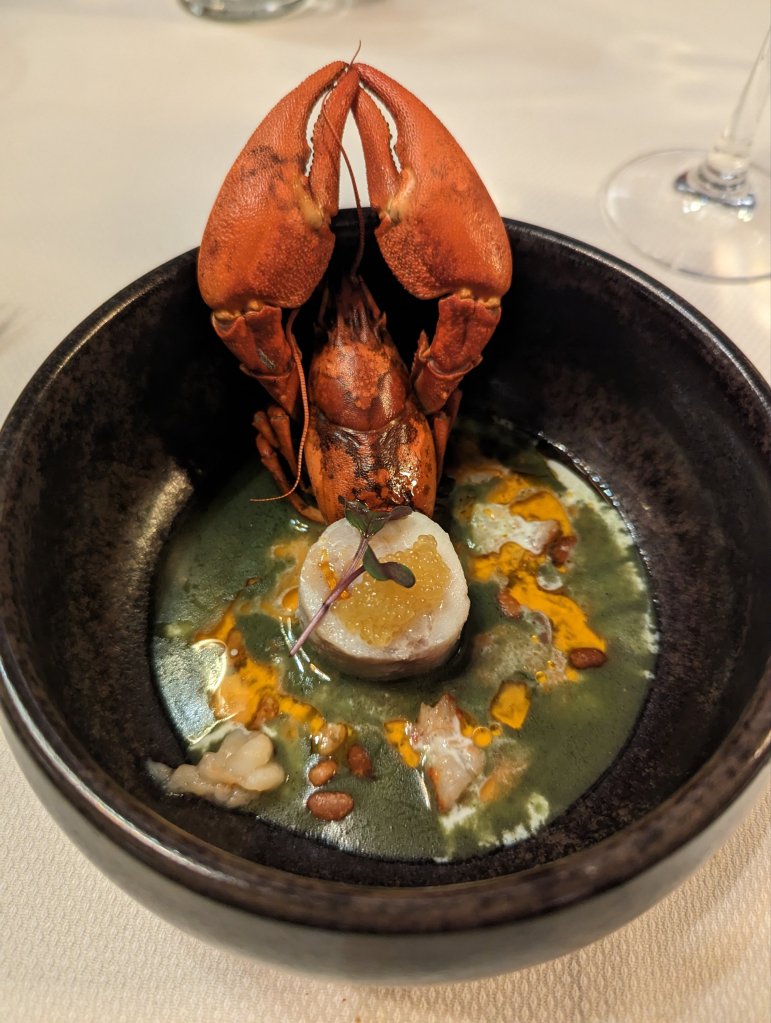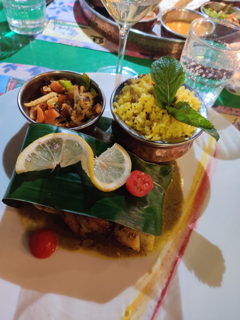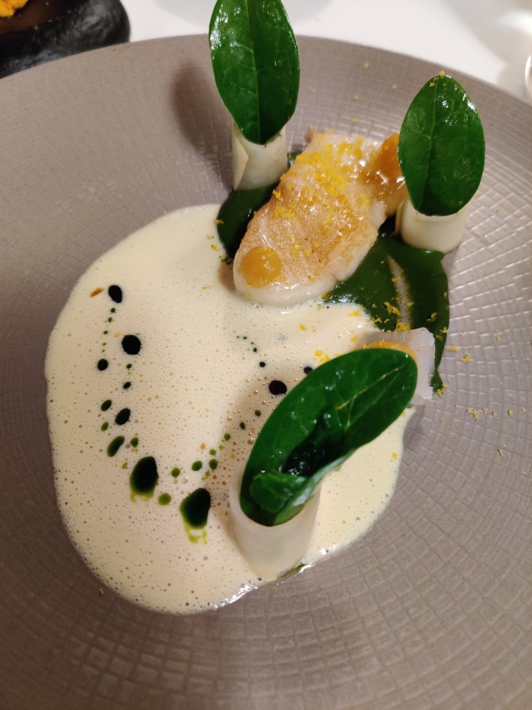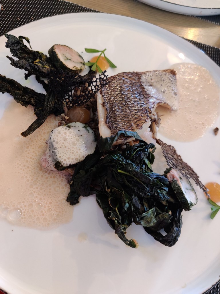 Nous avons débuté avec des noix de saint-jacques (bien cachées par une jolie et savoureuse tuile sur la photo) dont la sauce était à damner un saint, puis une raie à la grenobloise, suivie par du veau en croûte à l’artichaut et par un baba « façon mojito ». Ce qui m’a frappée, c’est que les goûts étaient à la fois subtils et affirmés, aucune fadeur (par exemple, souvent les très jolies tuiles qui décorent un plat n’ont que très peu de goût, or celle-là était très savoureuse), un parfait équilibre, bref, chapeau bas !