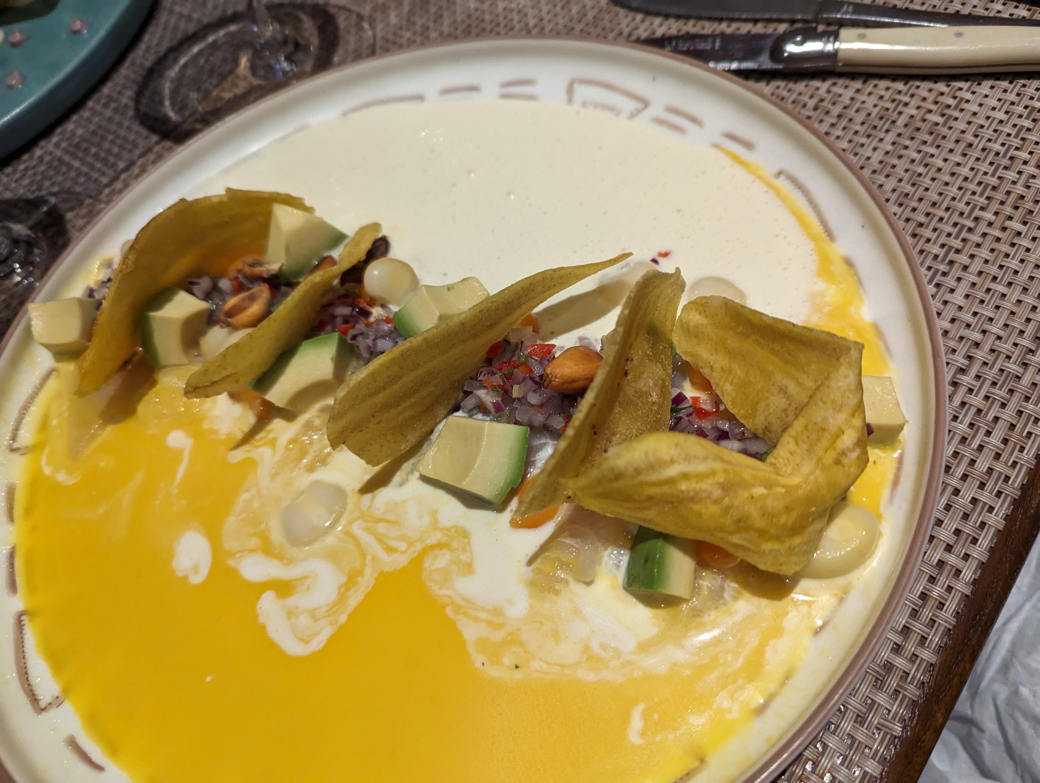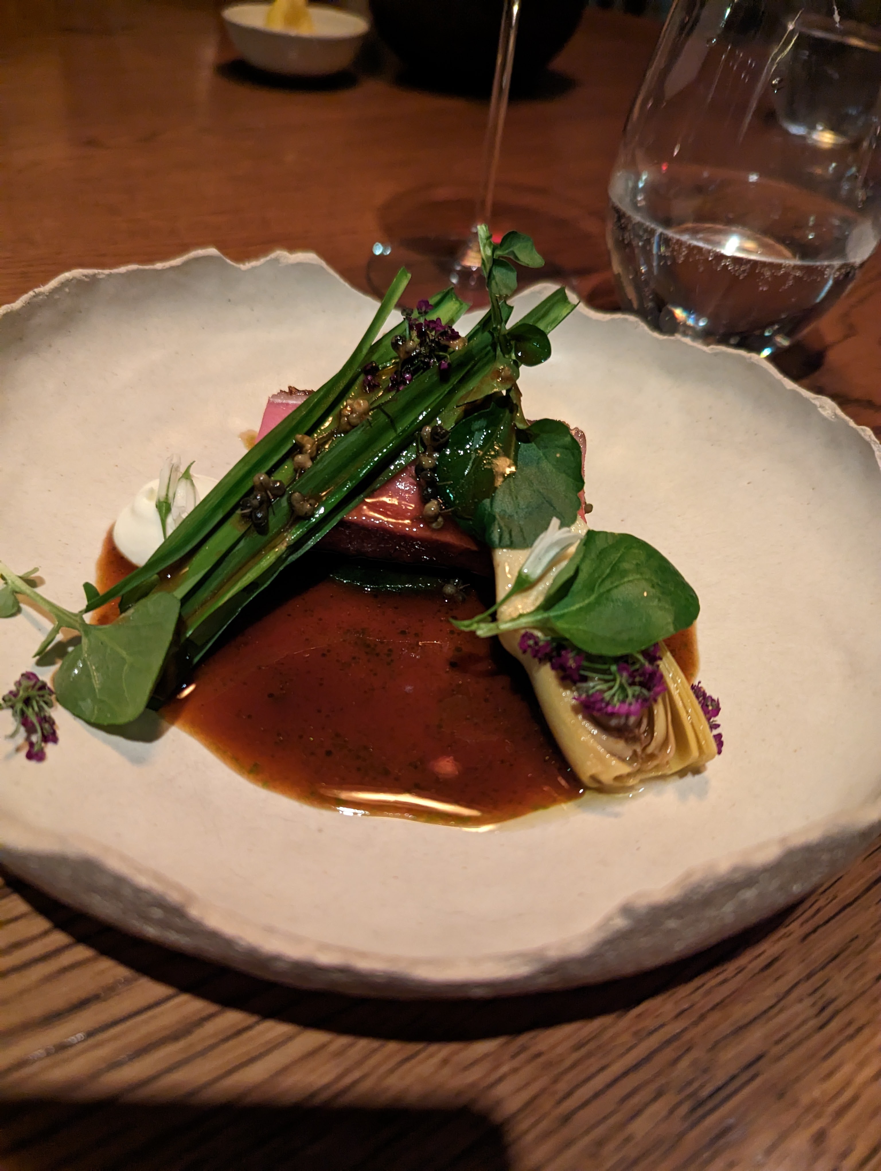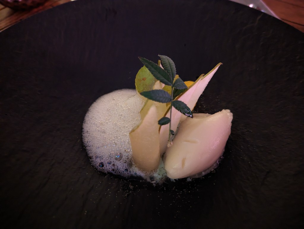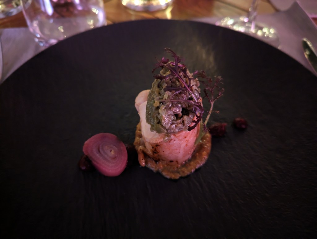 Nous avons débuté avec des noix de saint-jacques (bien cachées par une jolie et savoureuse tuile sur la photo) dont la sauce était à damner un saint, puis une raie à la grenobloise, suivie par du veau en croûte à l’artichaut et par un baba « façon mojito ». Ce qui m’a frappée, c’est que les goûts étaient à la fois subtils et affirmés, aucune fadeur (par exemple, souvent les très jolies tuiles qui décorent un plat n’ont que très peu de goût, or celle-là était très savoureuse), un parfait équilibre, bref, chapeau bas !