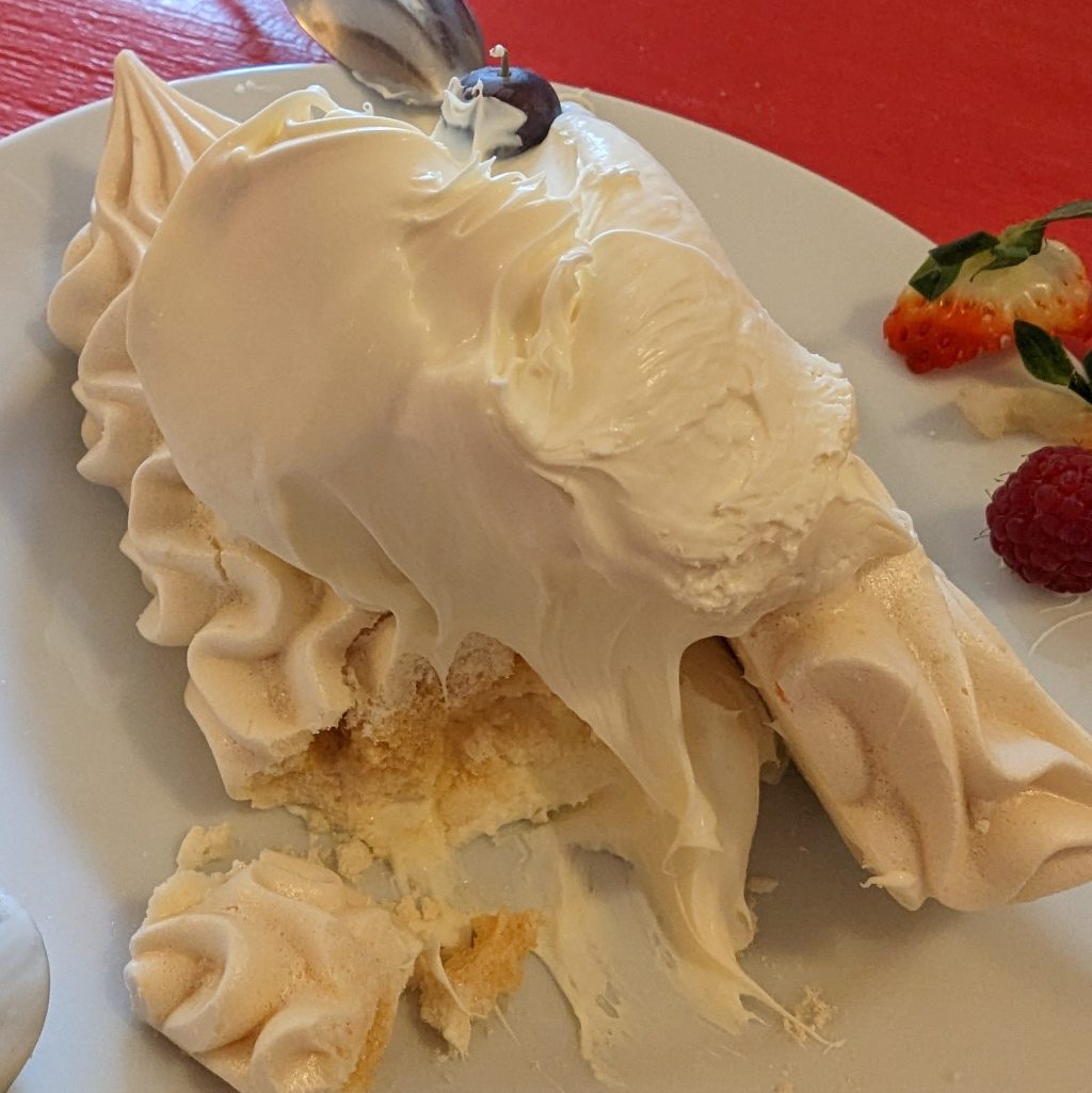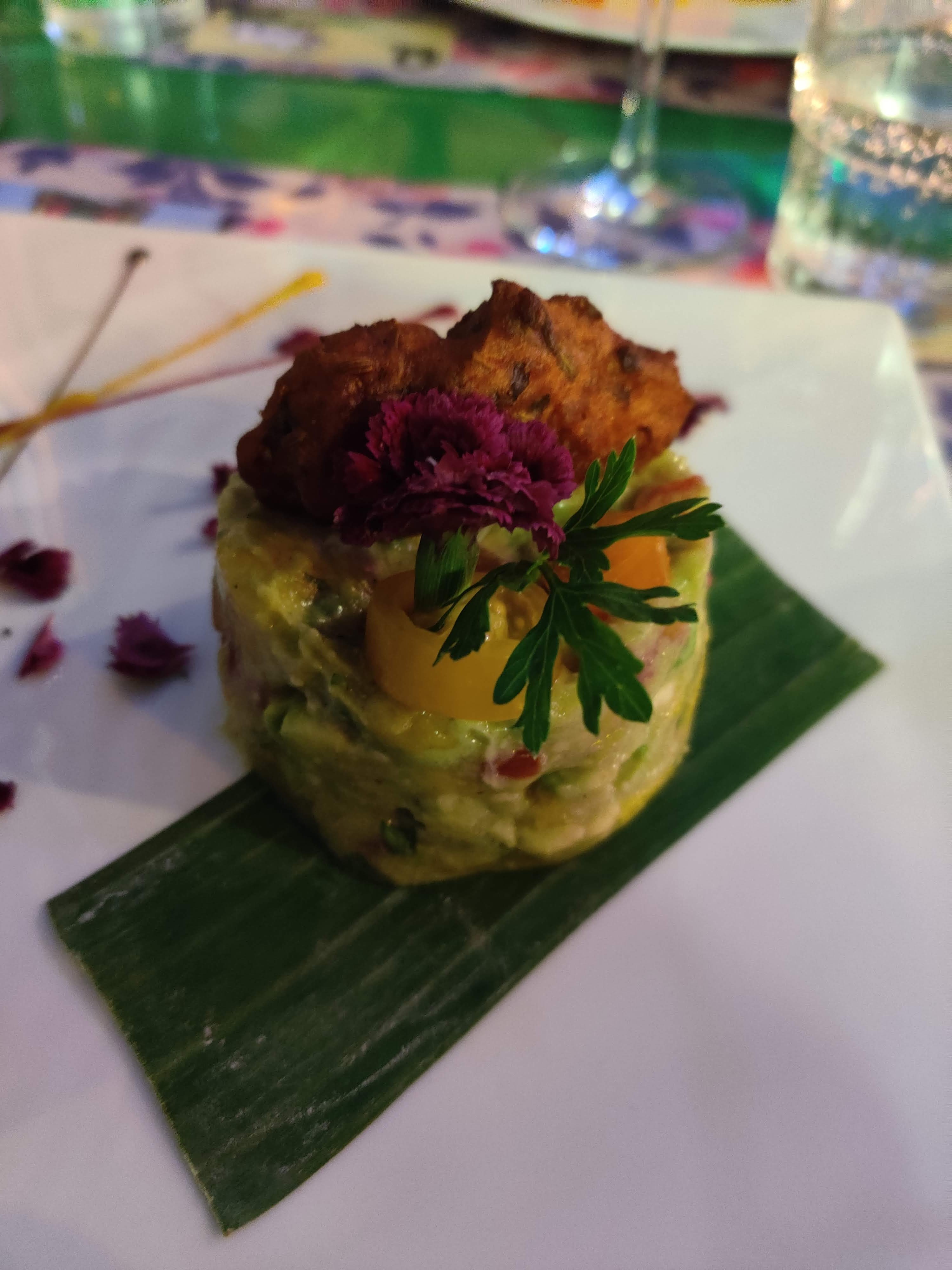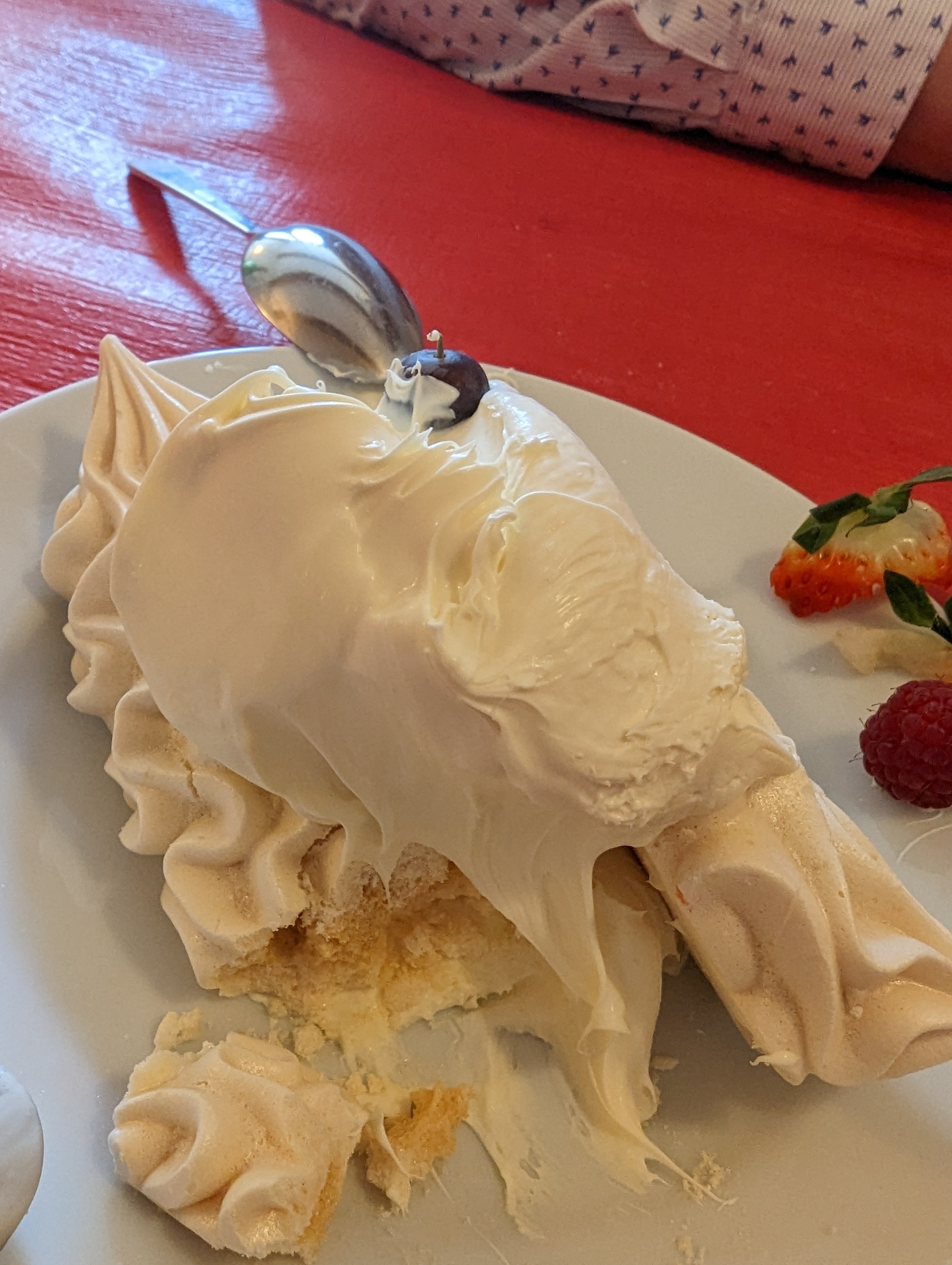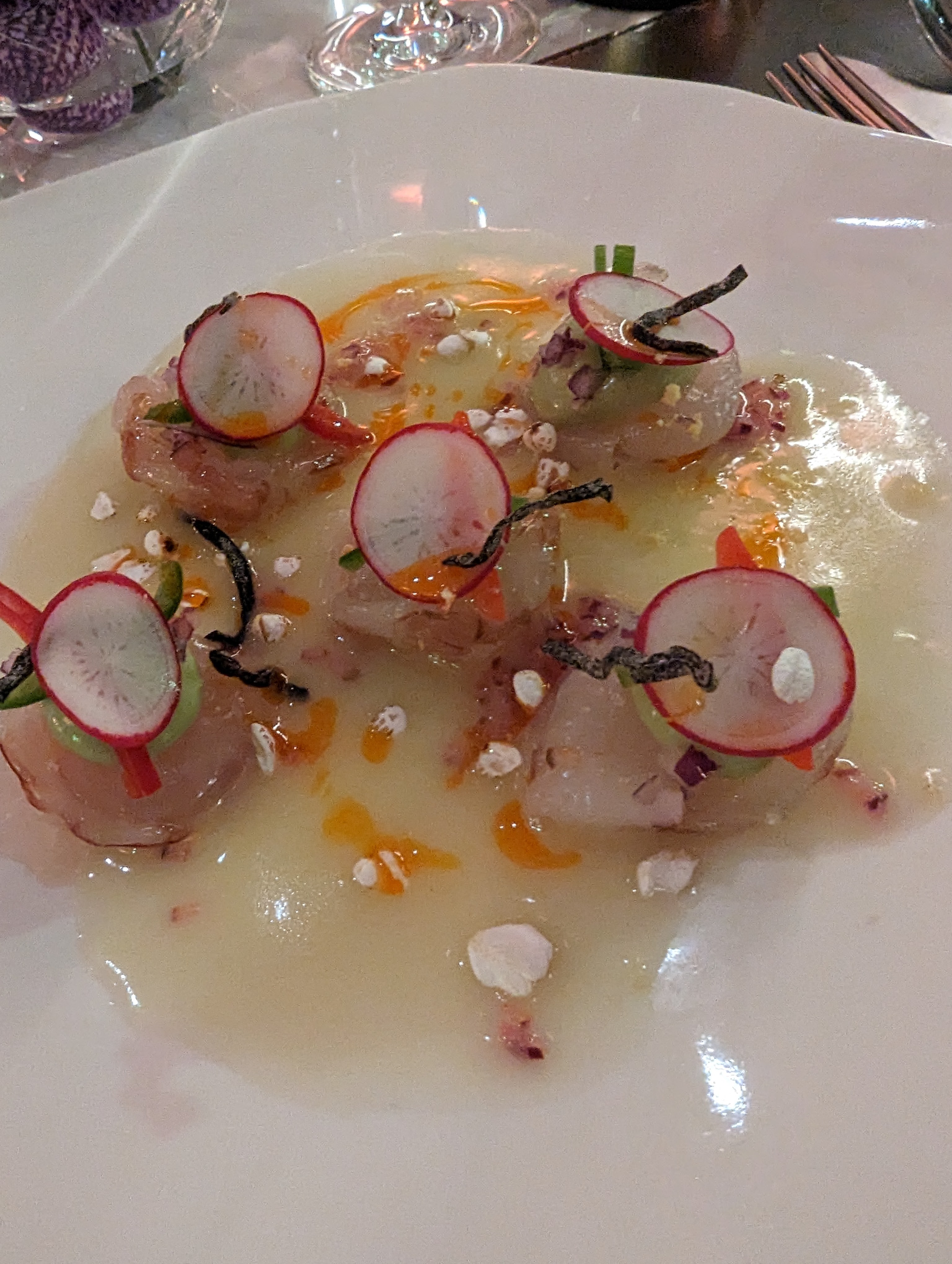 Nous avons débuté avec des noix de saint-jacques (bien cachées par une jolie et savoureuse tuile sur la photo) dont la sauce était à damner un saint, puis une raie à la grenobloise, suivie par du veau en croûte à l’artichaut et par un baba « façon mojito ». Ce qui m’a frappée, c’est que les goûts étaient à la fois subtils et affirmés, aucune fadeur (par exemple, souvent les très jolies tuiles qui décorent un plat n’ont que très peu de goût, or celle-là était très savoureuse), un parfait équilibre, bref, chapeau bas !