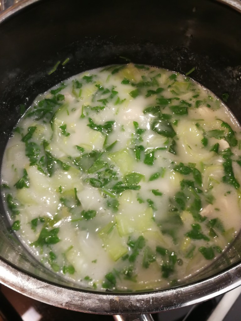 Dimanche midi, j’ai concocté une soupe de poulet au tapioca et à la coriandre (recette déchirée dans un vieux Elle à Table et introuvable online) – là aussi je l’ai enrichie en légumes, cette fois avec des bok choi grossièrement hachés et ajoutés peu après les lanières de poulet.