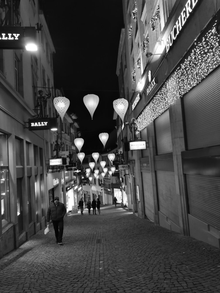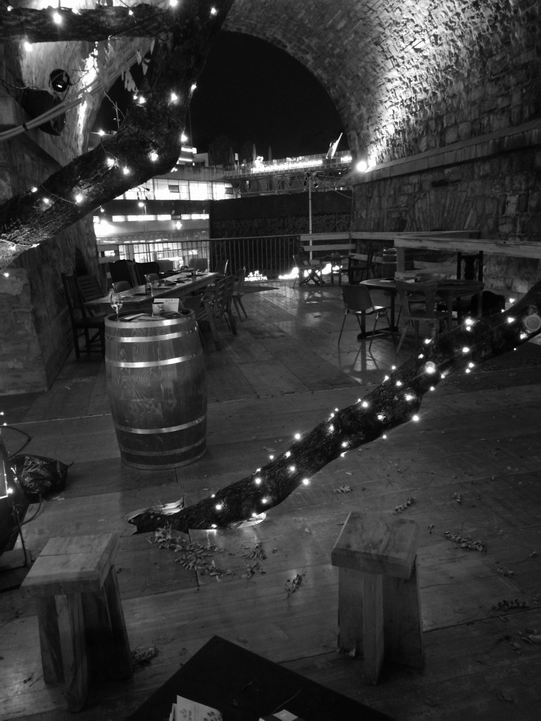 Mercredi soir, deuxième sortie : j’avais été invitée (grâce à ce blog je crois) à la soirée d’inauguration du marché de Noël de Lausanne, Bô Noël. Il faut savoir que, depuis cinq ans qu’il existe, Bô Noël prend de plus en plus d’ampleur, jusqu’à être inclus dans le top 5 des marchés de Noël d’Europe par je ne sais plus quelle revue britannique. Il est aussi couplé avec le festival Lausanne Lumières, qui orne notre ville de sculptures et animations lumineuses souvent très réussies. La soirée a commencé au Coeurnotzet, bar installé sous les voûtes du Grand-Pont. Nous étions à l’étage, ce qui donne une vue inédite sur les arches du pont, ainsi que sur la place Centrale. De plus, c’est très joliment aménagé, avec un bar bien sûr, des fauteuils et tables éparpillés, des braseros, et au beau milieu de tout ça, l’arbre qui pousse à cet endroit-là et auquel on a aménagé un passage dans le plancher. Mes photos sont hélas peu nombreuses et très pourries, mon téléphone disposant d’un appareil photo qui est excellent de jour et épouvantable de nuit (mais c’est mieux en noir et blanc, ce qui explique ce que vous voyez ci-dessous).