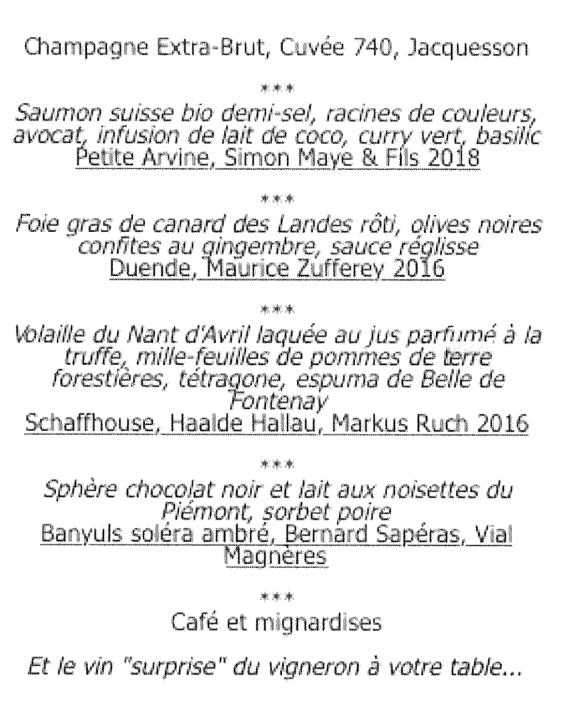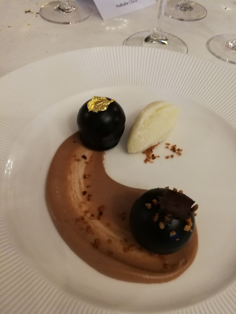 Je dois dire que la qualité de la cuisine était impressionnante, surtout si l’on pense que c’était servi à 180 personnes. Cuissons parfaites, goûts frais et subtils, et même moi qui suis tout sauf un bec sucré j’ai adoré le dessert ! Et il faut absolument que j’apprenne à faire des olives confites, c’est une tuerie. Quant aux vins, ils étaient dignes de la sélection du CAVE, qui est toujours parfaite.
