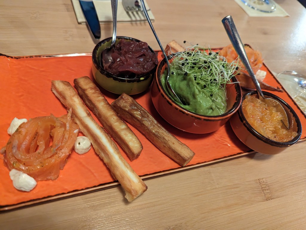 Des petites coques à tartelettes salées achetées chez Ikea (sérieusement, l’épicerie Ikea est un trésor de petites merveilles, même si tout n’est pas à garder – le fromage est fade et gommeux, et que dire des tubes de pâte de saumon…. Mais les bocaux de harengs, l’aquavit et les biscuits roulés à la cannelle, par exemple, sont parfaits !), remplies de filets de truite fumée mixés avec du jus de citron. Tout simple, très sympa comme apéro.